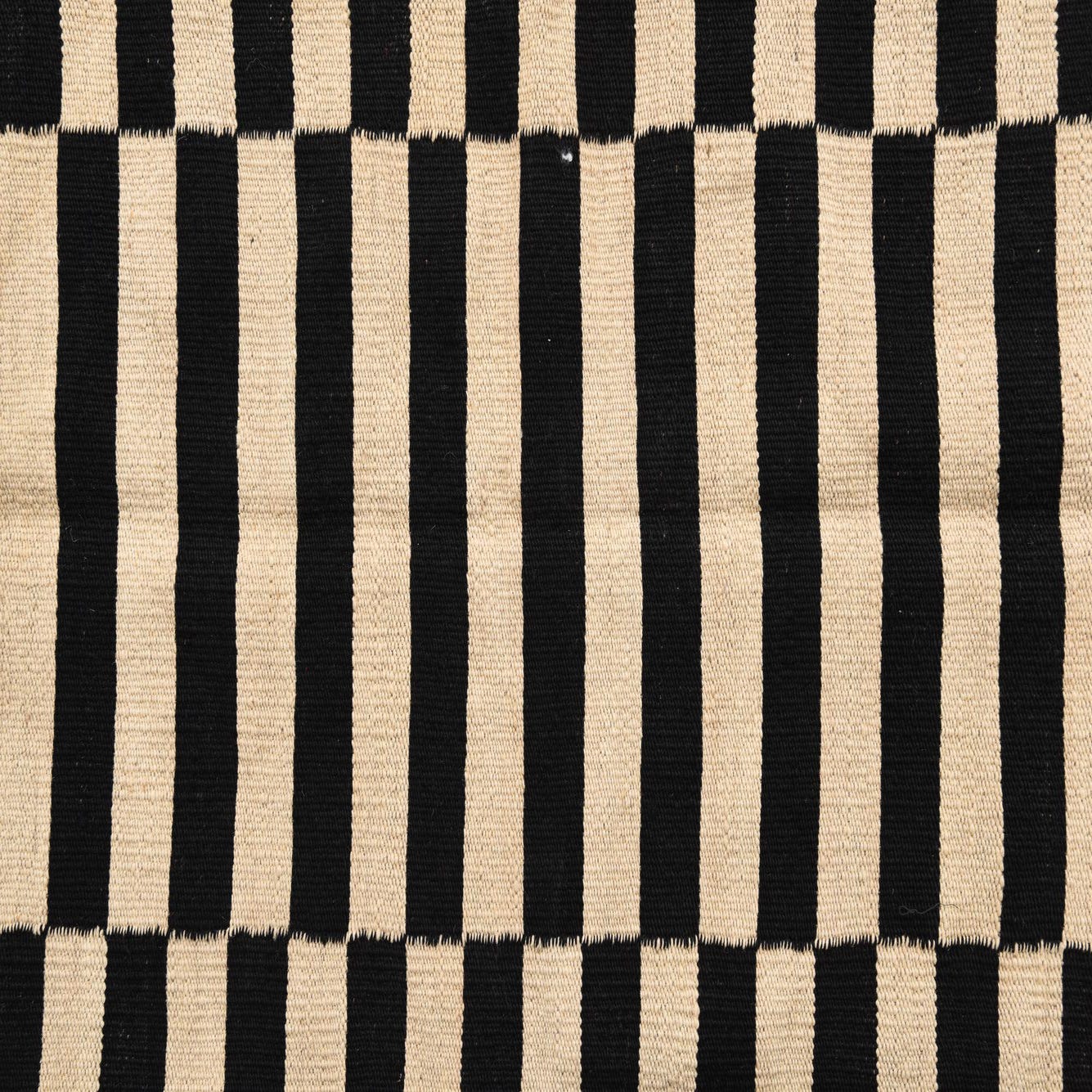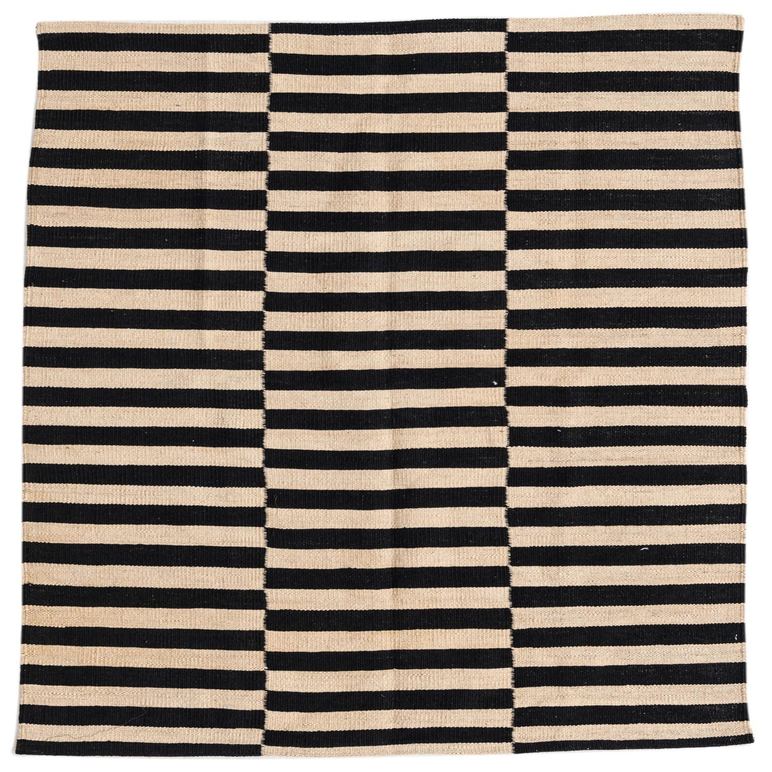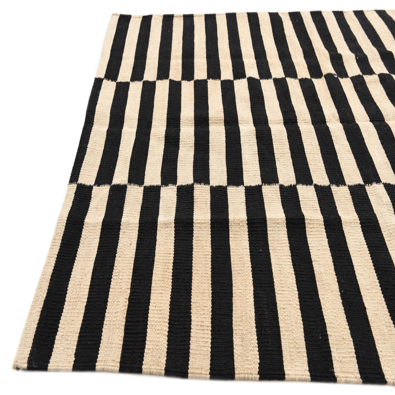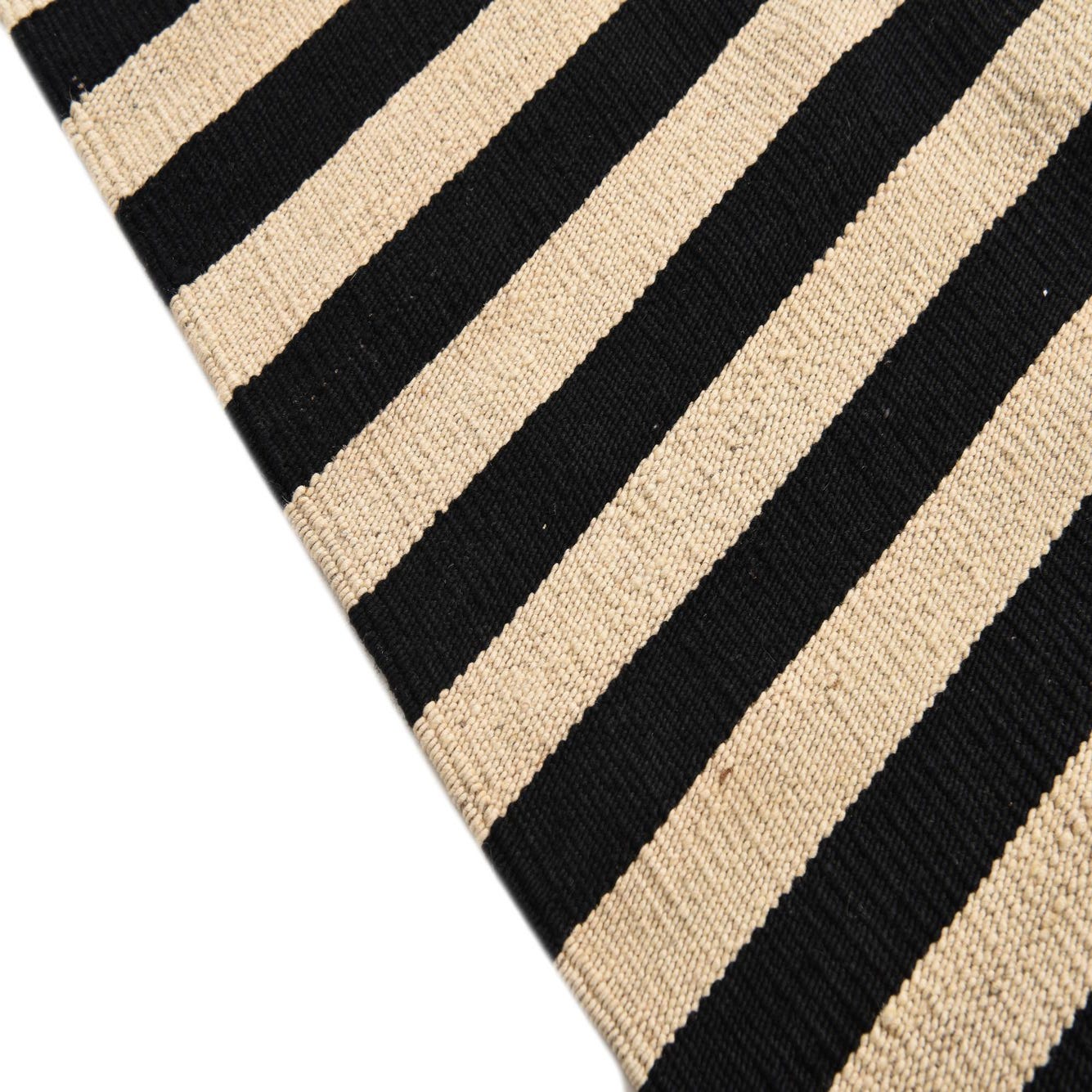 A bold black-and-white stripe pattern defines this hand-woven flatweave, arranged in three vertical panels of horizontal bands that create a clean, rhythmic graphic. The alternating bands are crisply defined—deep black against a soft natural white—giving the rug a modern, minimalist look with a subtle handmade character. Run your hand across the surface and you’ll notice the low-profile, slightly ribbed texture typical of tightly woven wool: firm underfoot with a tactile warmth from the natural fibers.