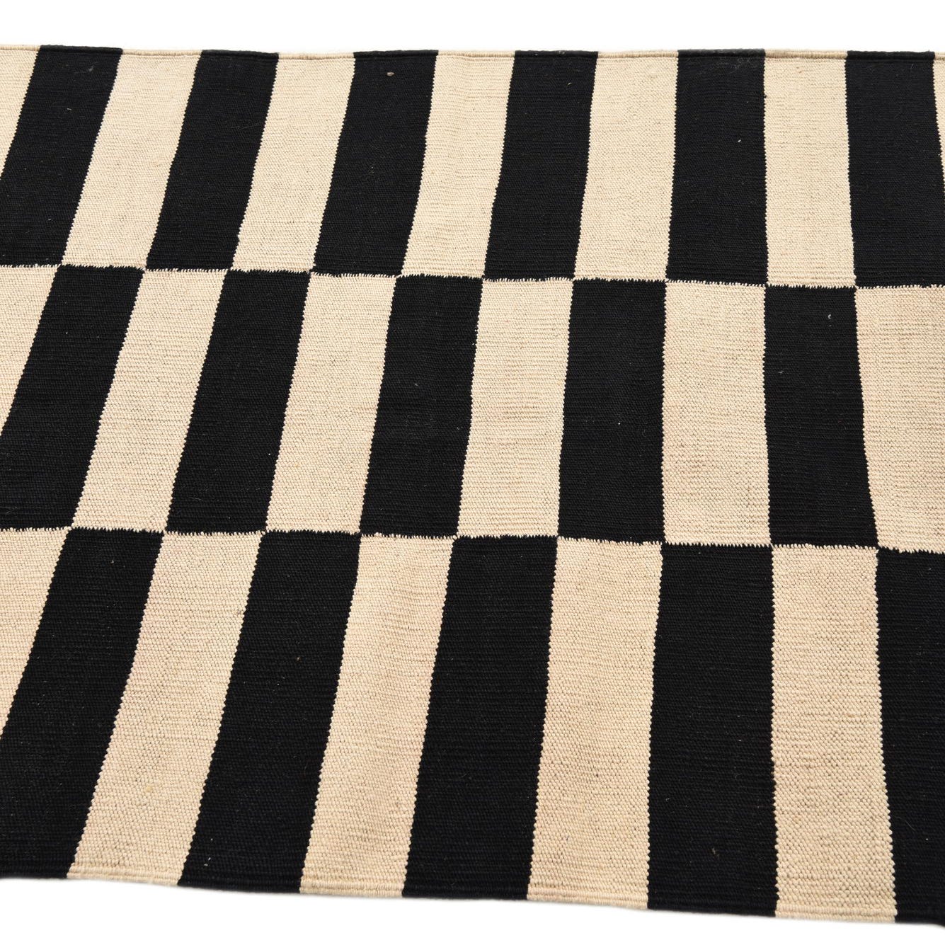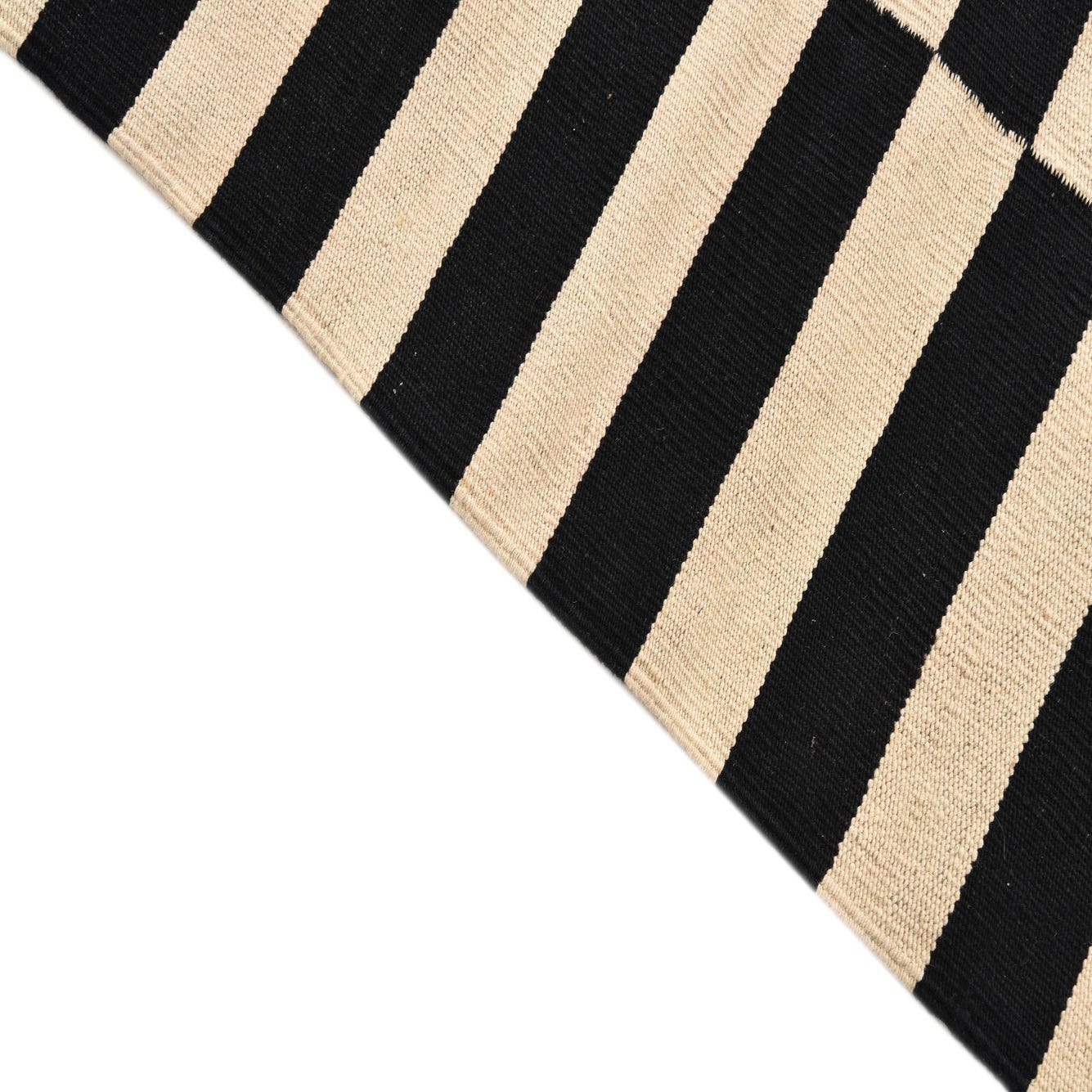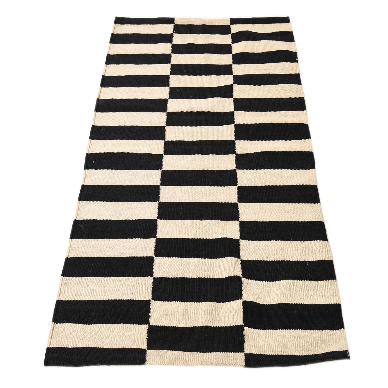A 3x5 rectangular black and ivory flatweave wool rug with a modern tribal striped pattern, ideal for an entryway.