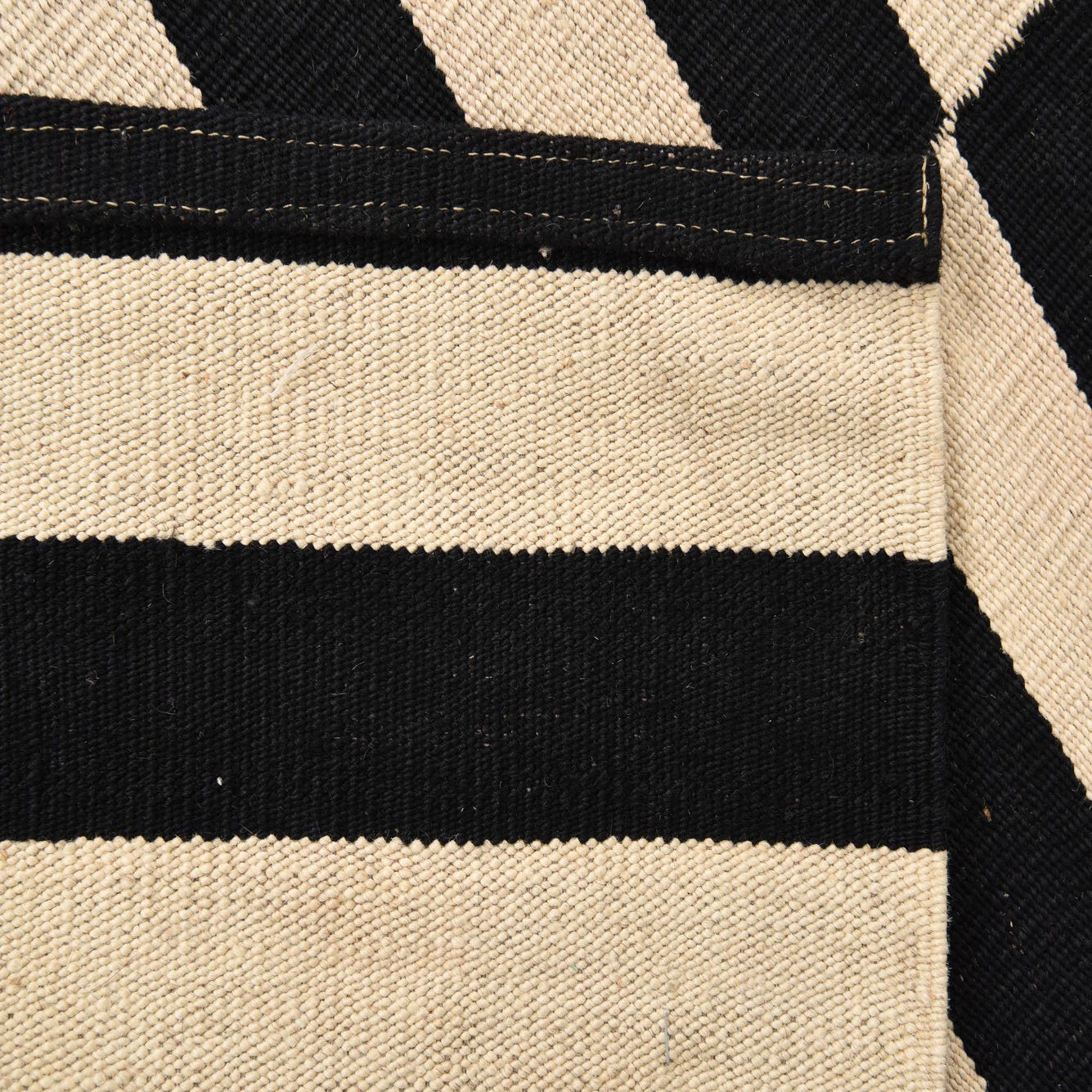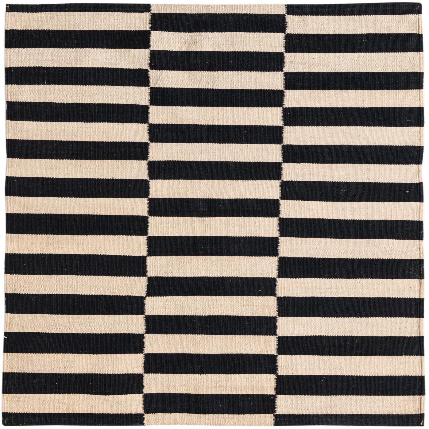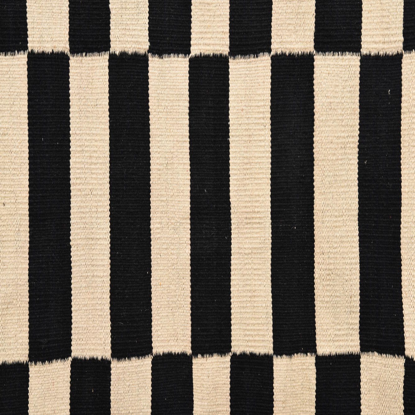 A 3x5 rectangular black and ivory flatweave wool rug with a modern tribal striped pattern, ideal for an entryway.