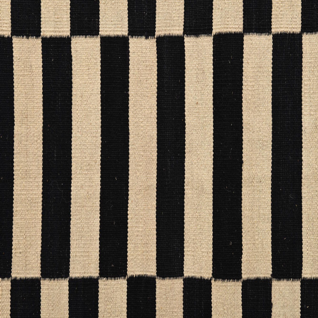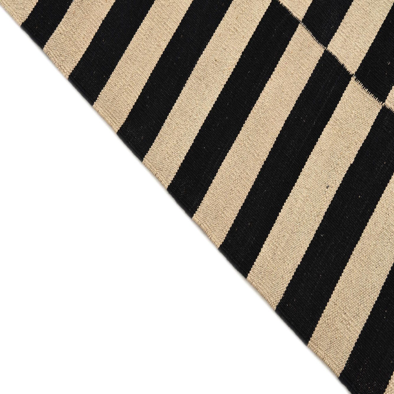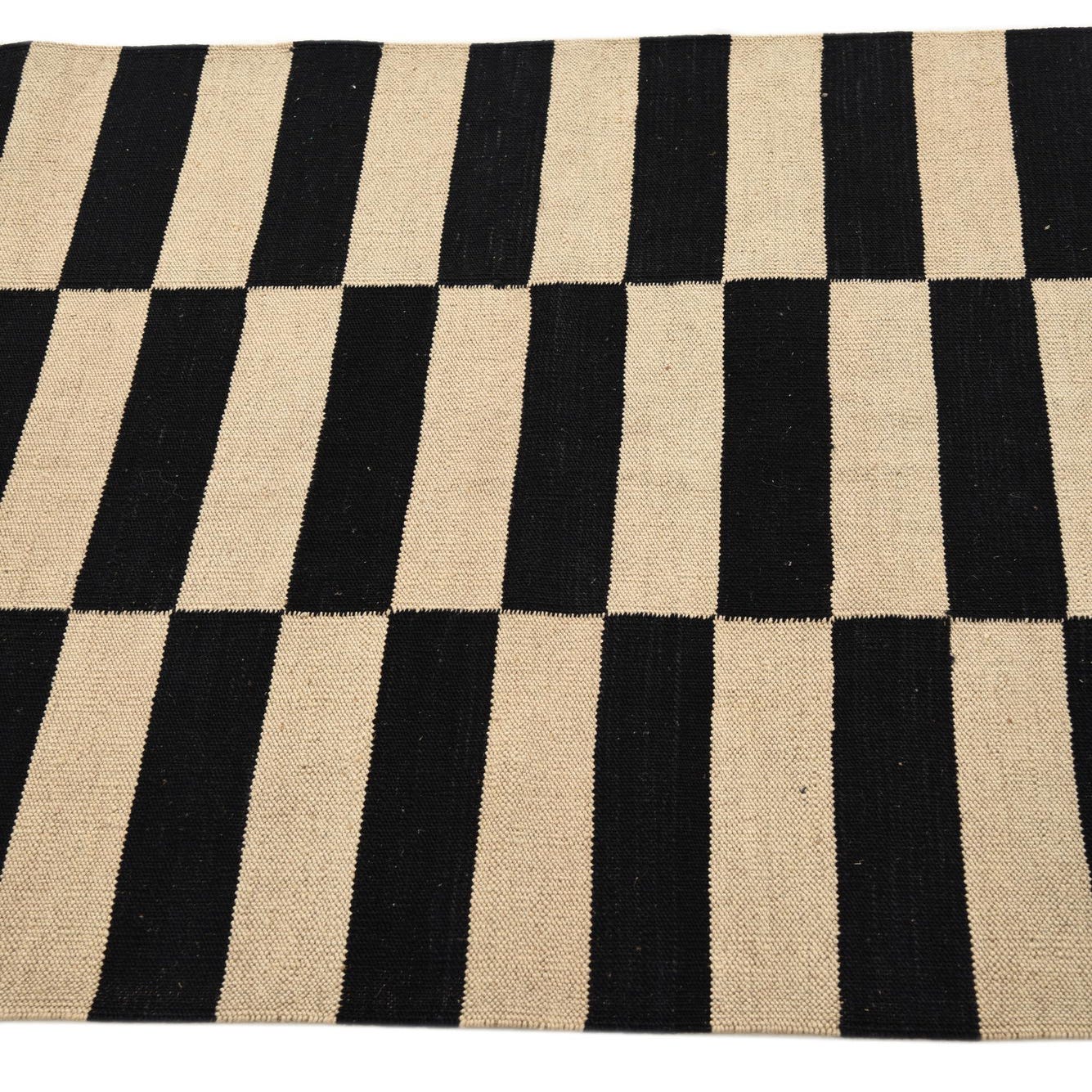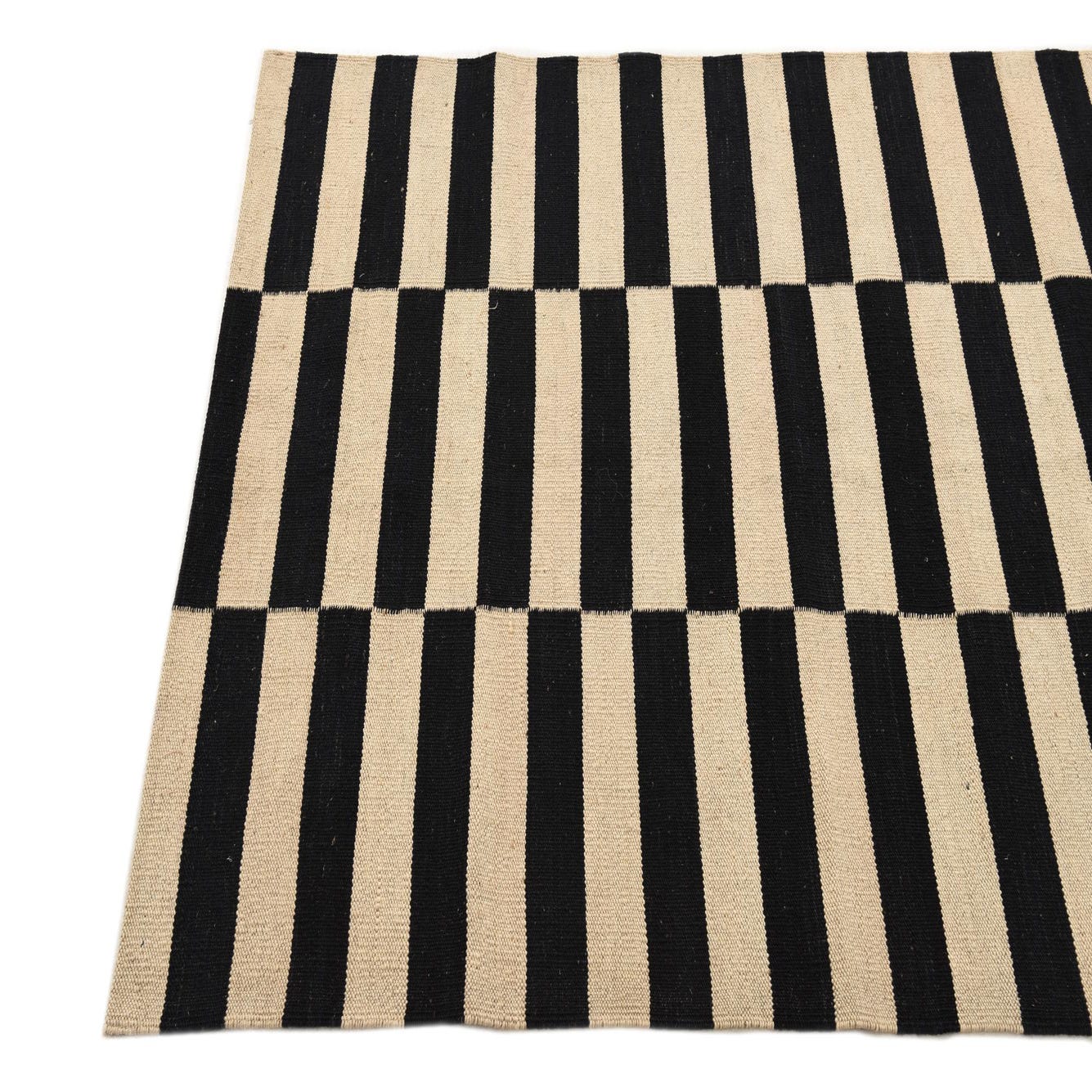 A 3x5 rectangular flatweave rug with bold black and ivory horizontal stripes, suitable for a modern or tribal decor.