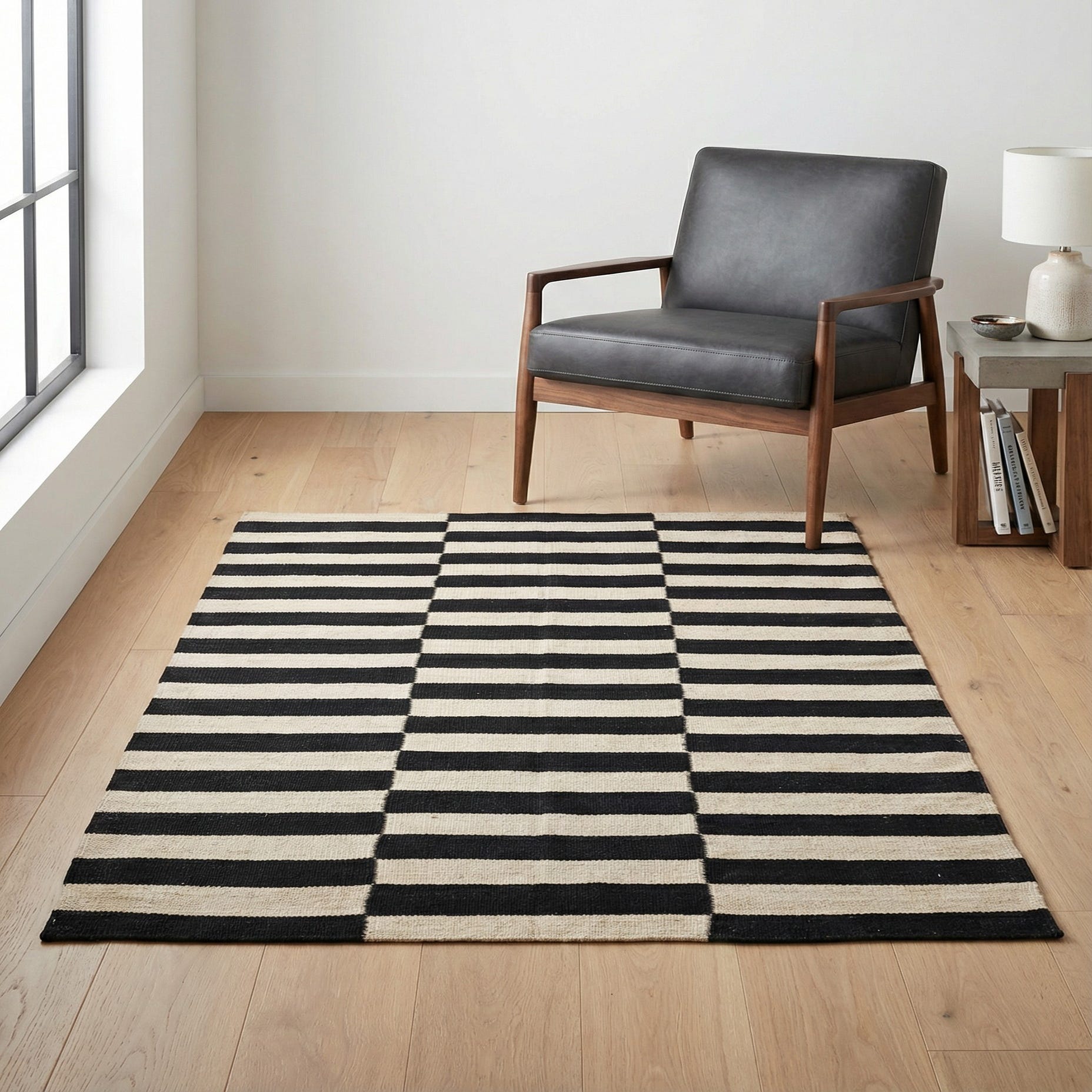 The striking contrast of black and white creates a visual statement, allowing this rug to stand out as a focal point or to complement a monochromatic design scheme. The simplicity of its color scheme and the timeless nature of its striped pattern ensures it can seamlessly integrate with contemporary, minimalist, Scandinavian, and even more traditional decors. It would be particularly effective in areas where a touch of modernity is desired without overwhelming the space, such as in an entryway, home office, or small living area.