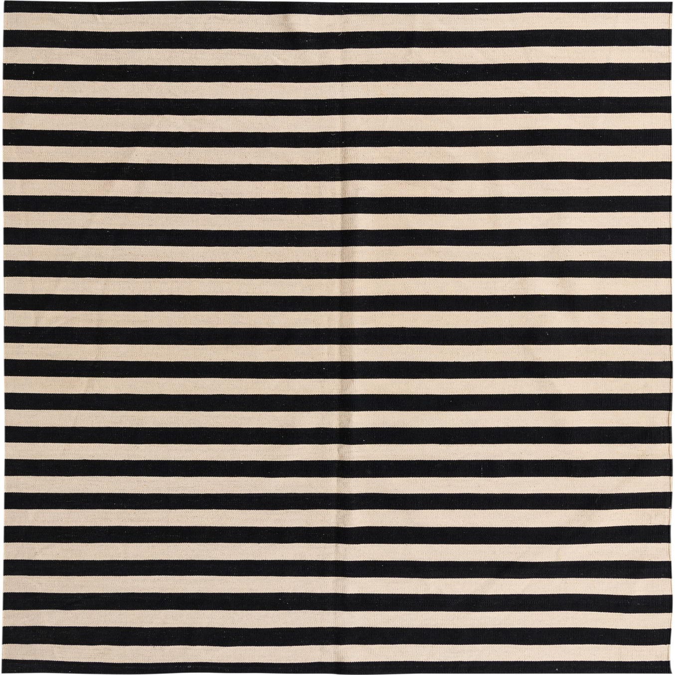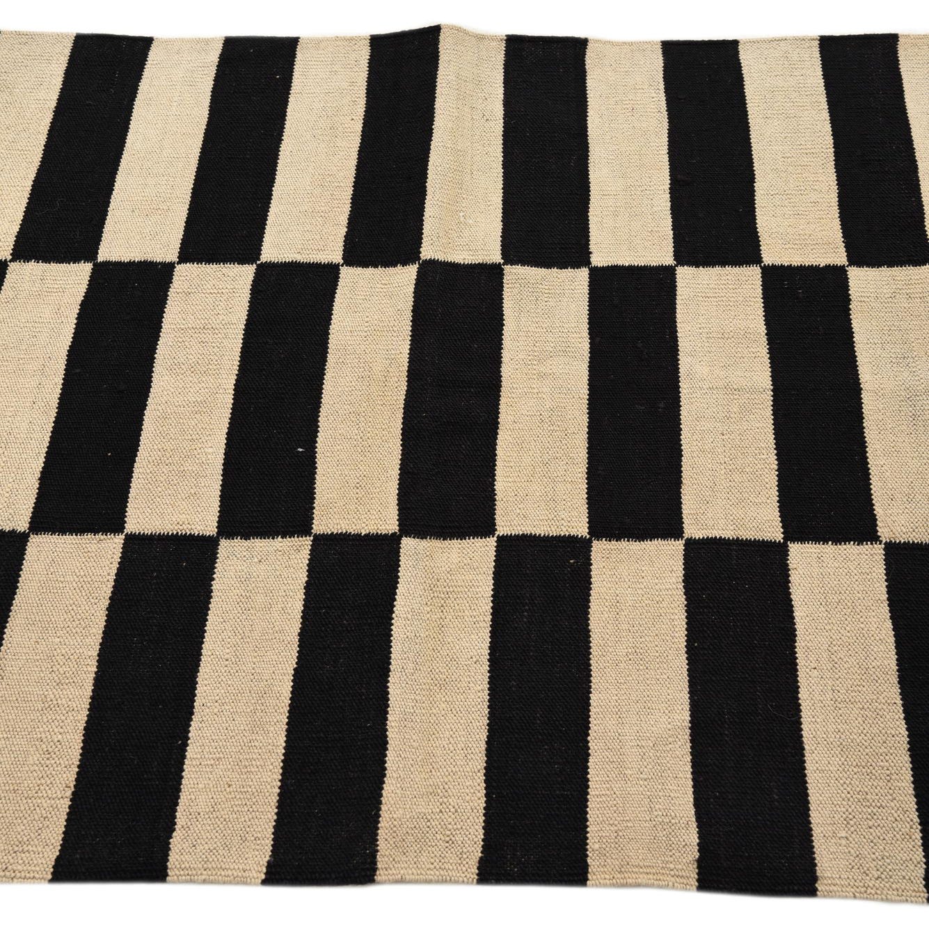 Part of the Kilim Modern collection, this hand-woven 3x5 rug is crafted from 100% wool, offering both durability and comfort underfoot. The design features a classic black and white striped pattern that provides a bold visual statement. The contrasting stripes create a sense of movement while maintaining a minimalist aesthetic.