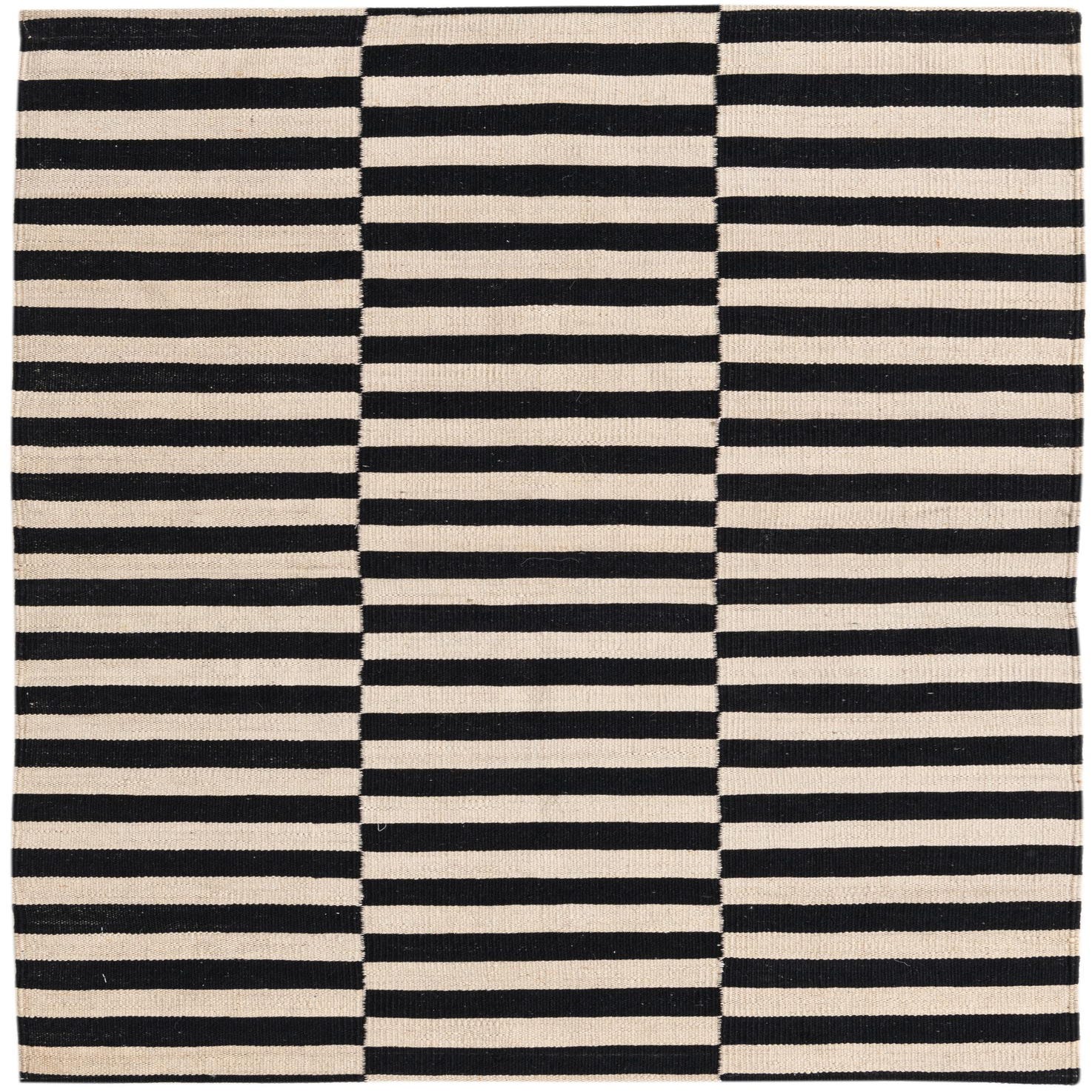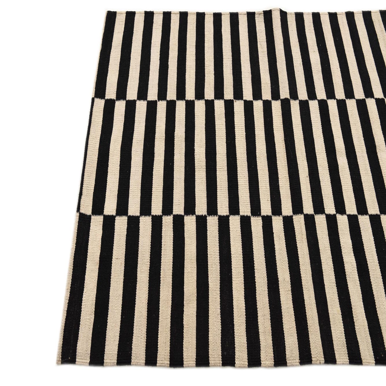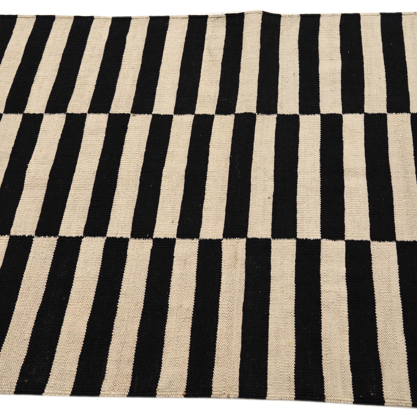 A 3x5 rectangular black and ivory flatweave rug with a modern striped and tribal pattern, suitable for an entryway.