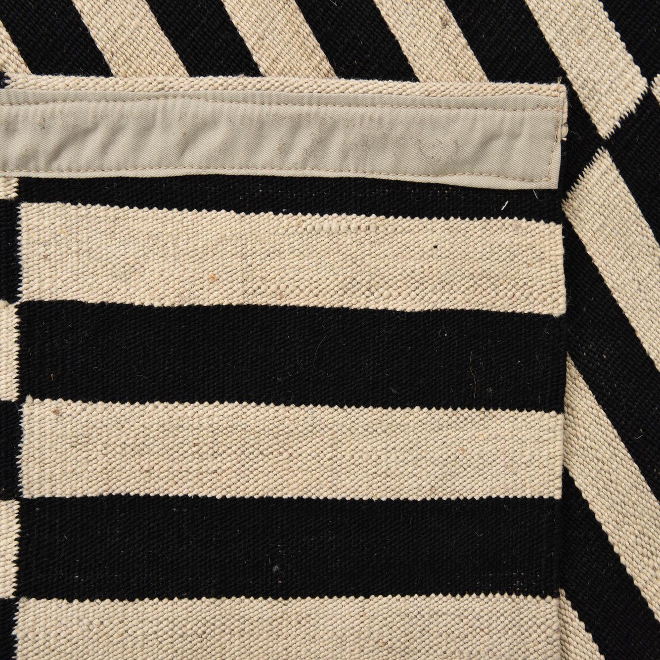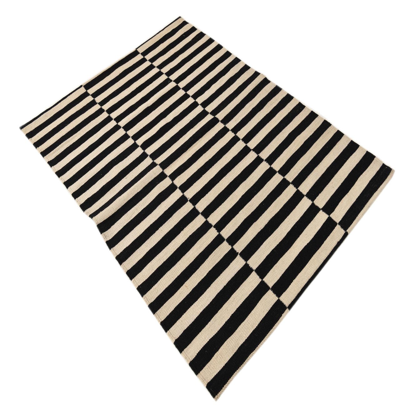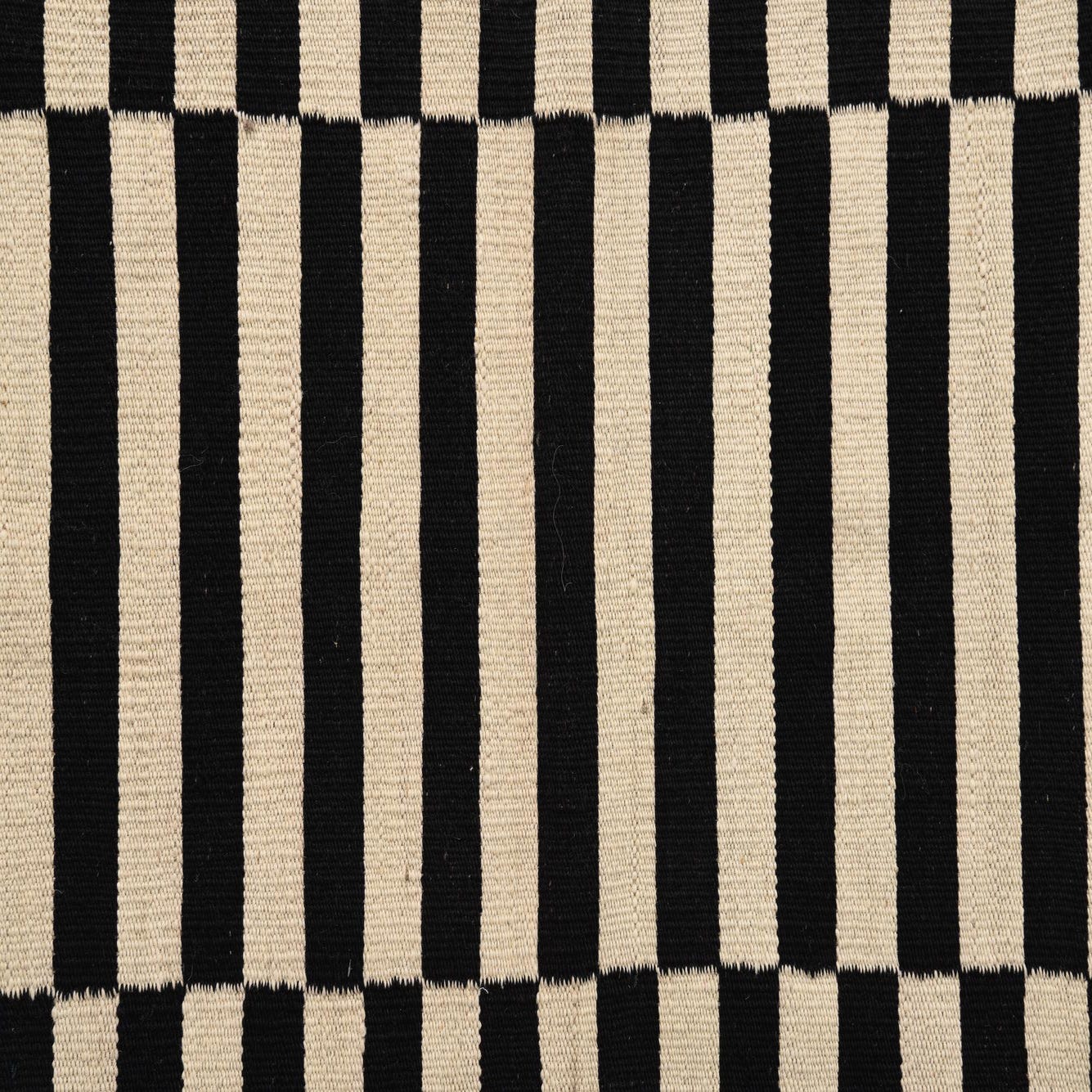 A 3x5 rectangular black and ivory flatweave rug with a modern striped and tribal pattern, suitable for an entryway.