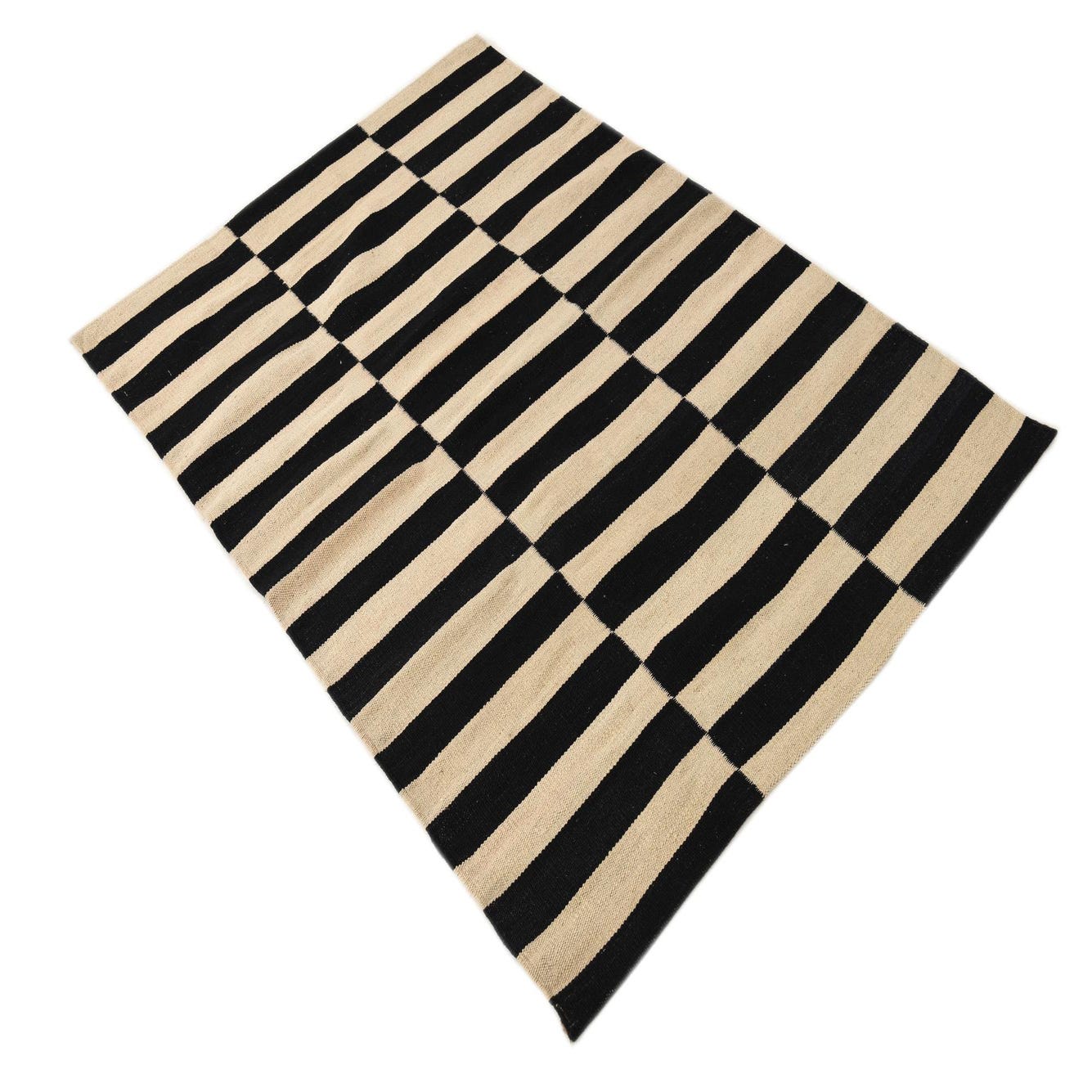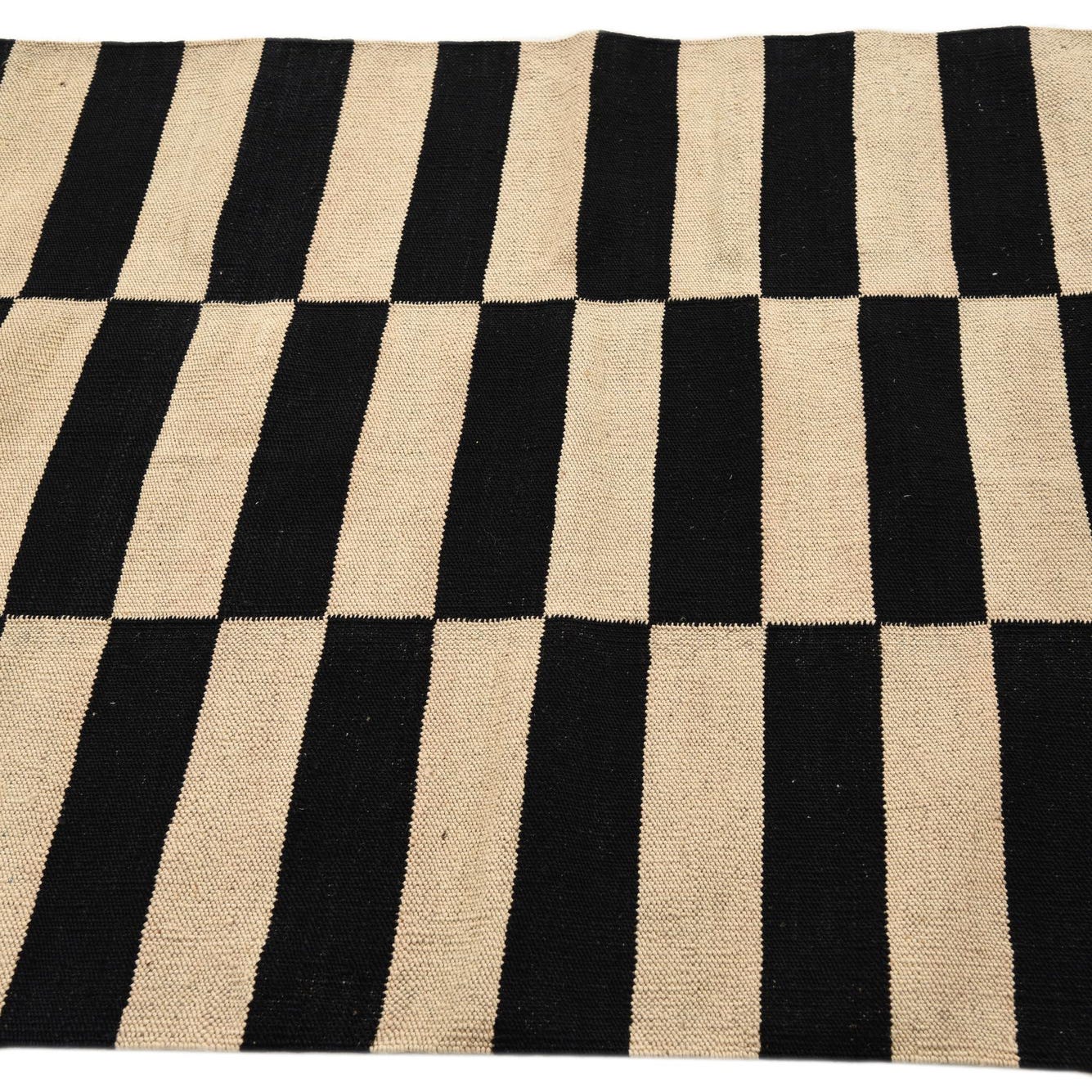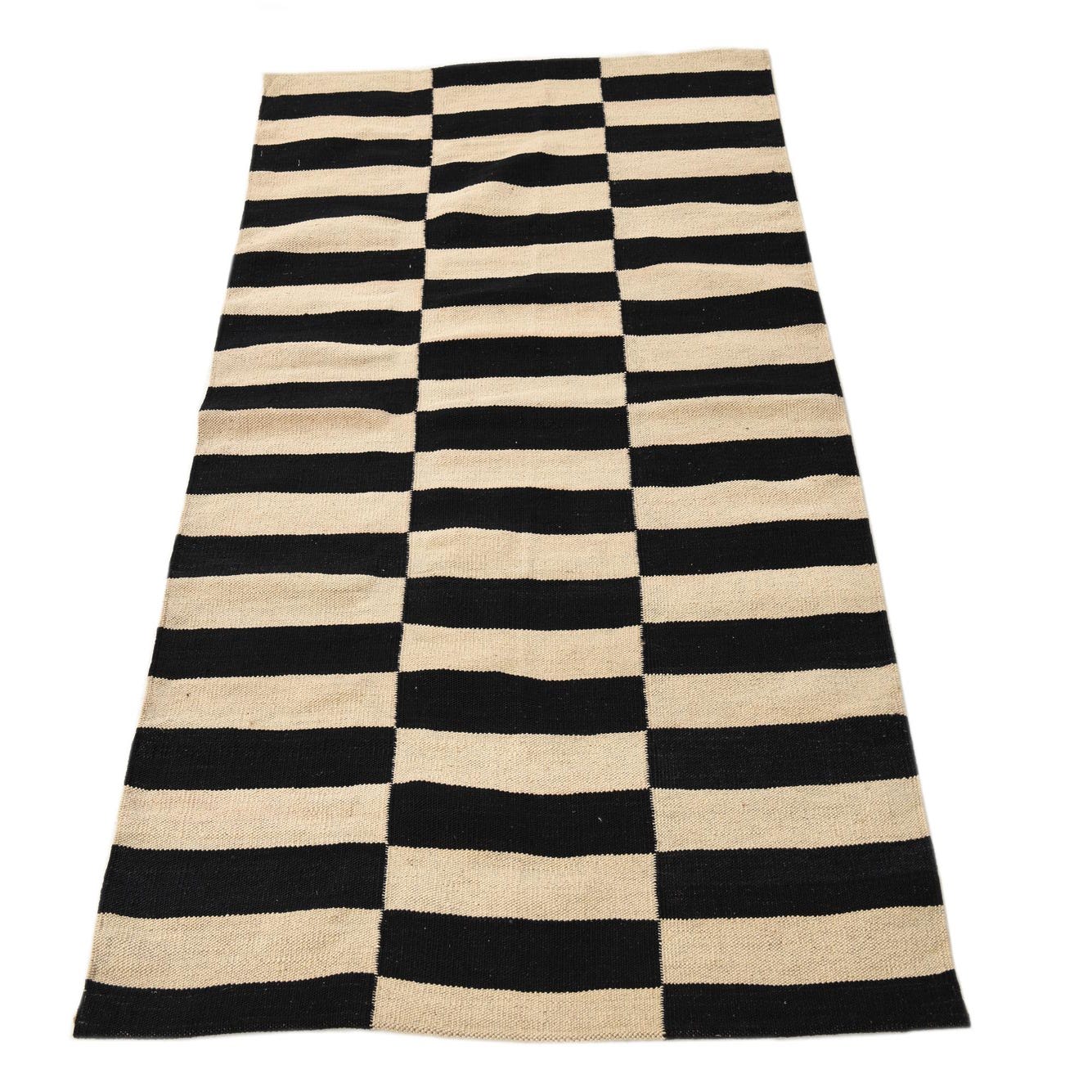 This Kilim Modern collection 3x5 rug features a bold, graphic pattern with black and white stripes, handwoven from 100% wool for a durable texture. The contrasting colors create a compelling visual statement that would anchor the design elements of any space effectively.