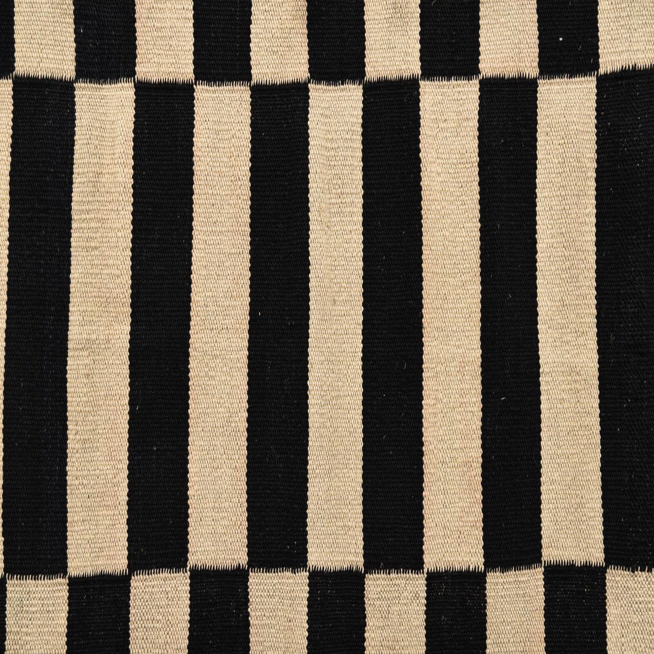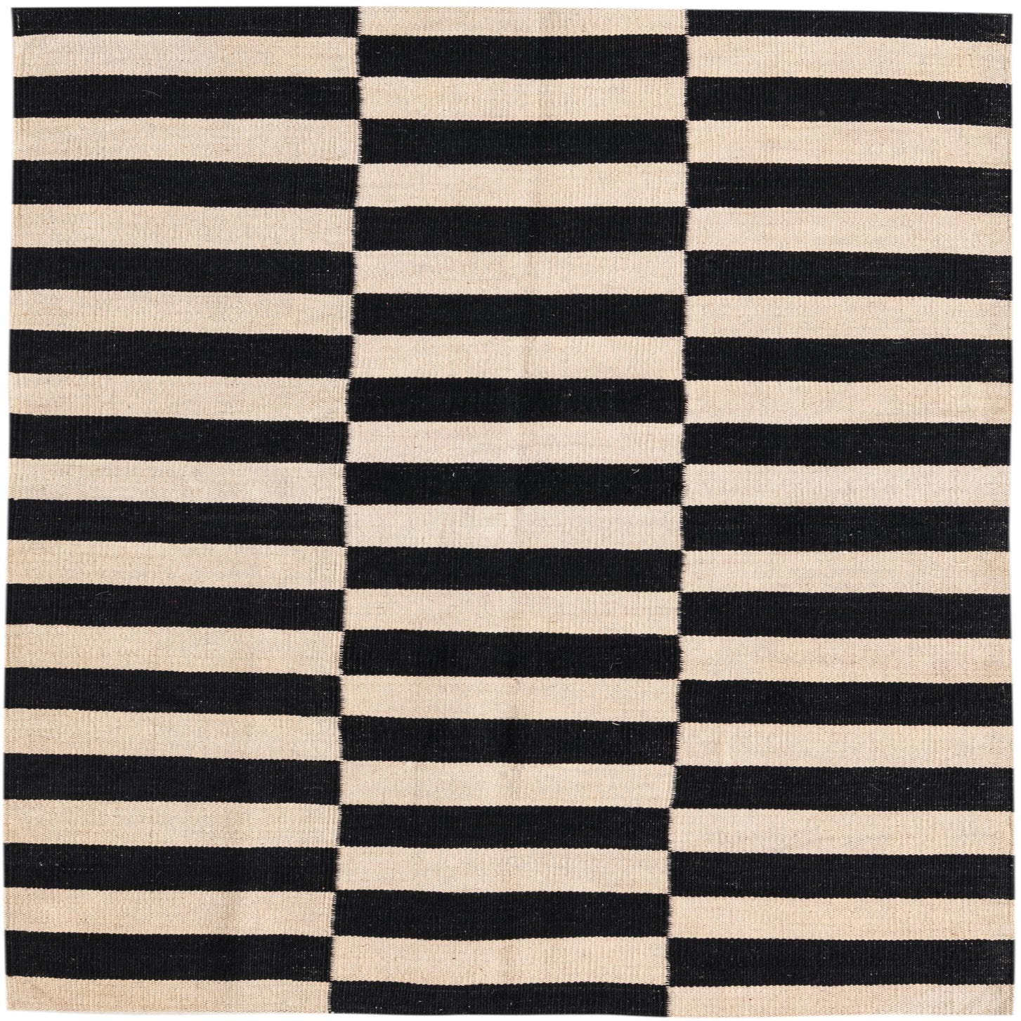 A 3x5 rectangular black and ivory flatweave wool rug with a modern tribal stripe pattern.