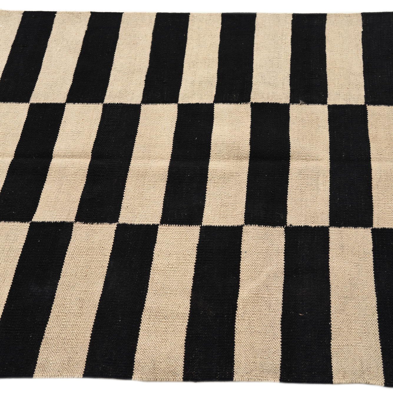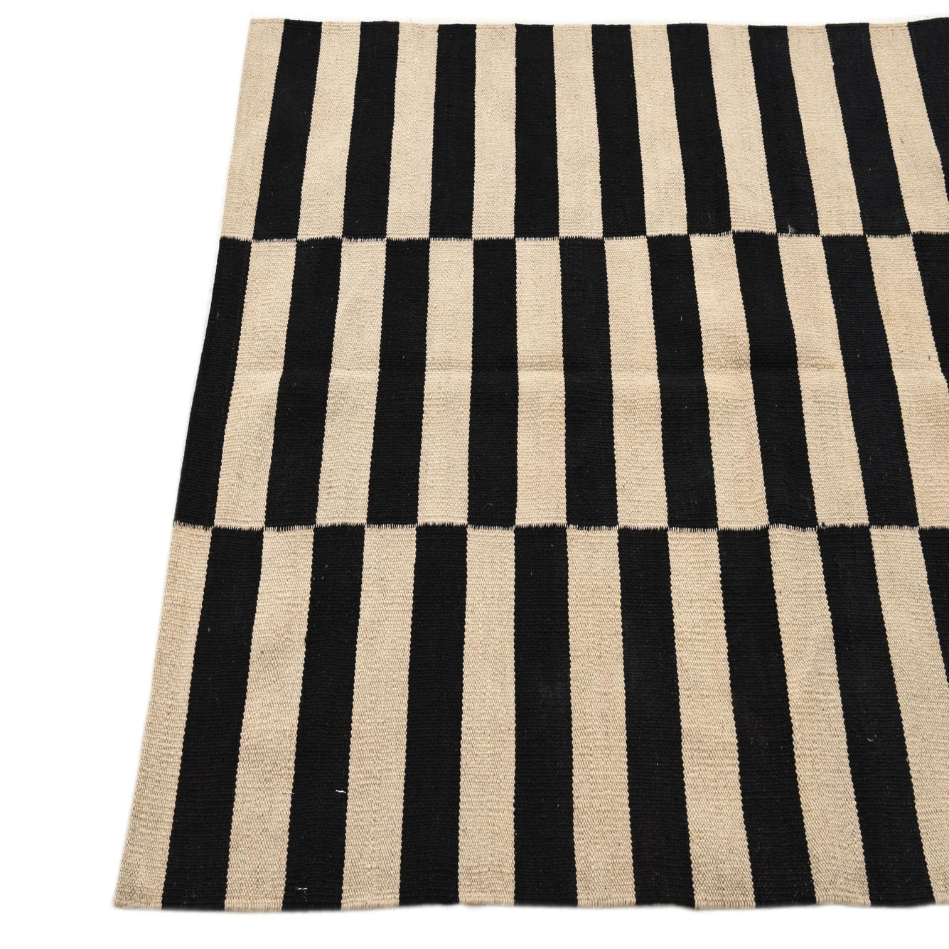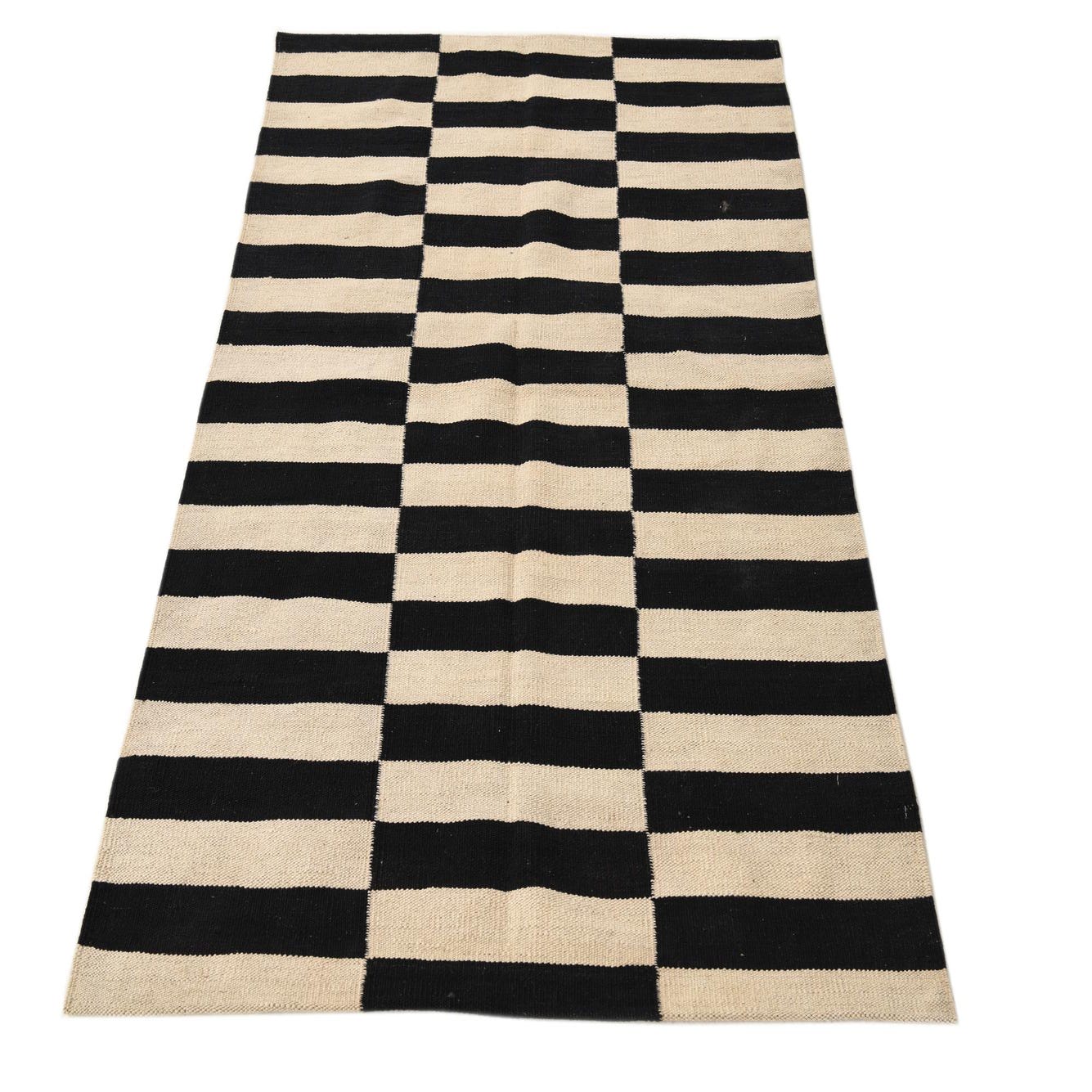 This Kilim Modern collection rug presents a bold and graphic pattern of black and white stripes, offering a contemporary aesthetic that complements a range of interior designs. It is handwoven from 100% wool, known for its durability and plush texture. At a versatile size of 3x5 feet, this piece can serve as an accent or a centerpiece in smaller spaces.