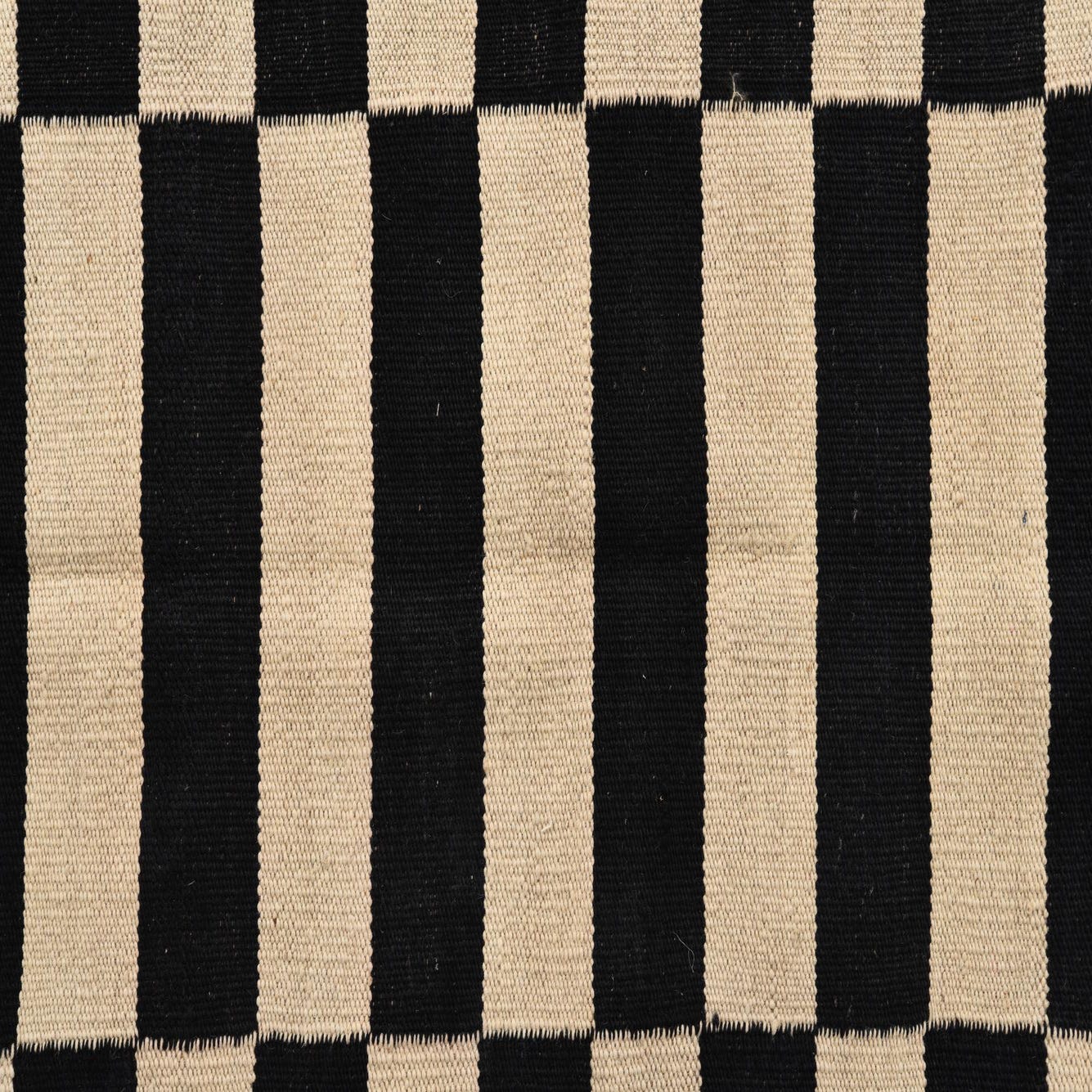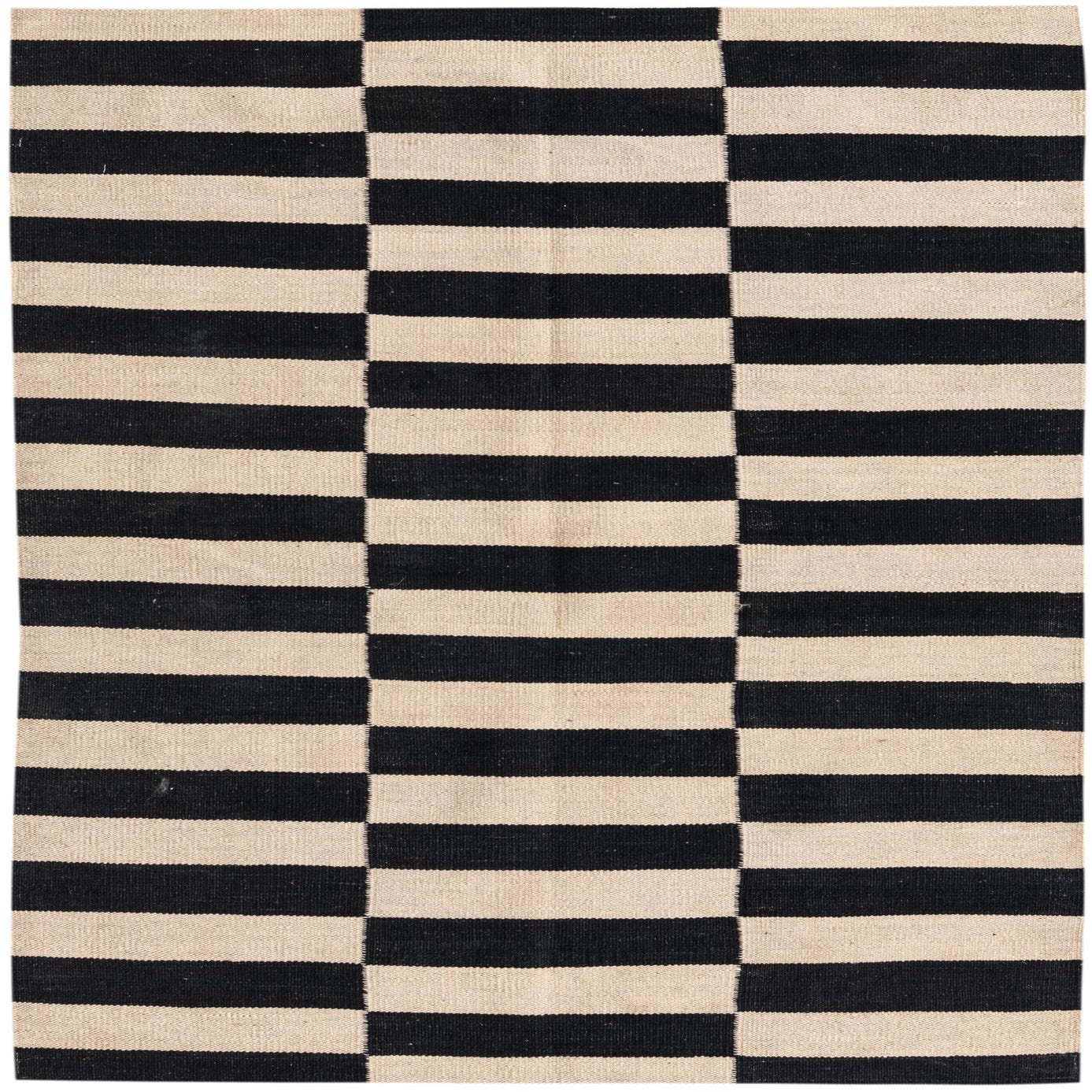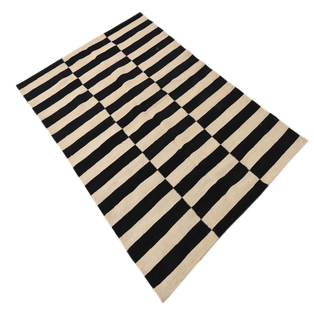This Kilim Modern collection rug presents a bold and graphic pattern of black and white stripes, offering a contemporary aesthetic that complements a range of interior designs. It is handwoven from 100% wool, known for its durability and plush texture. At a versatile size of 3x5 feet, this piece can serve as an accent or a centerpiece in smaller spaces.