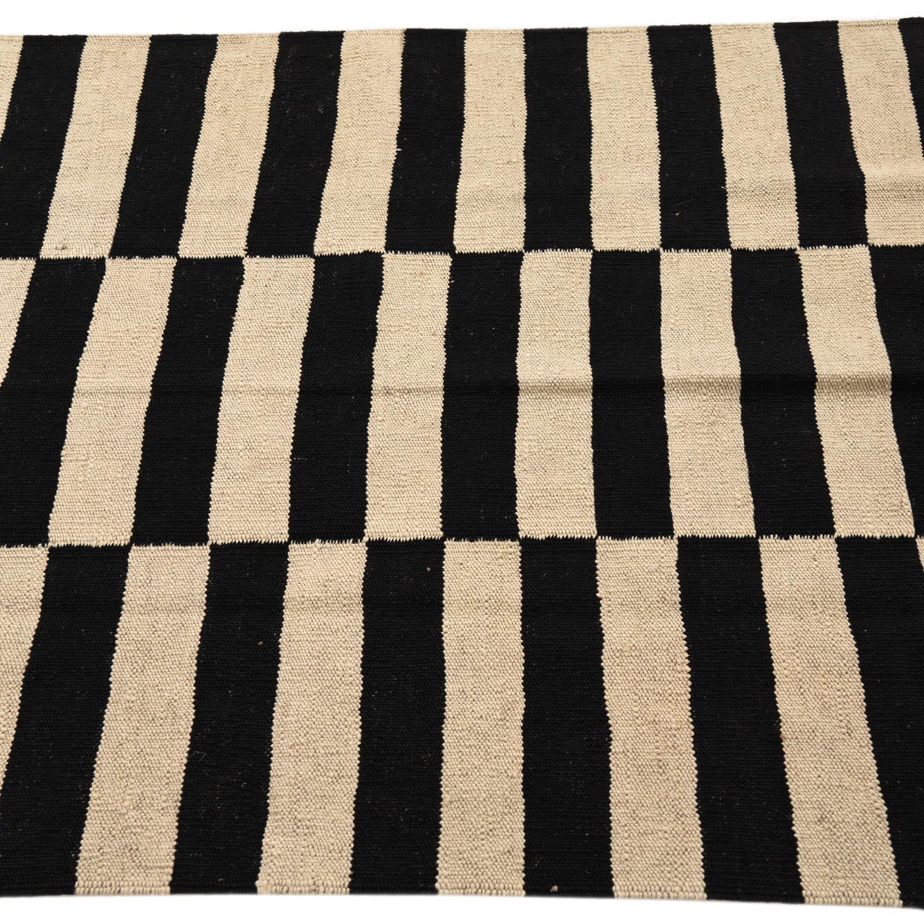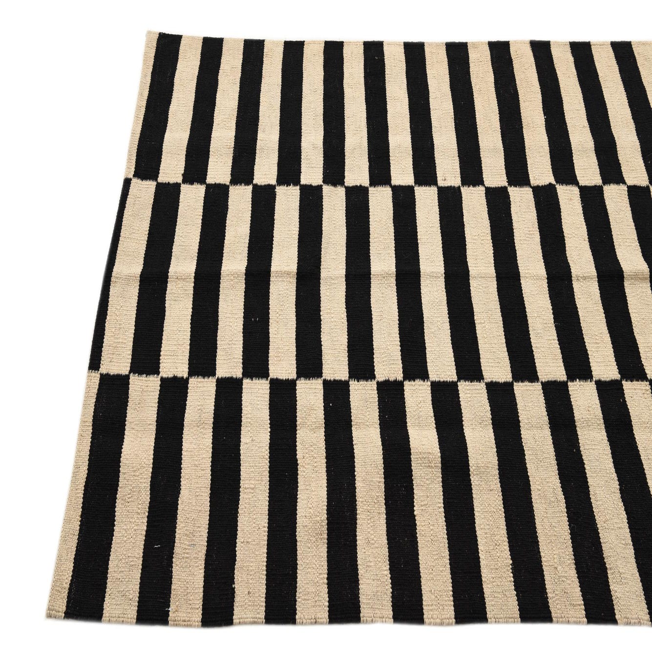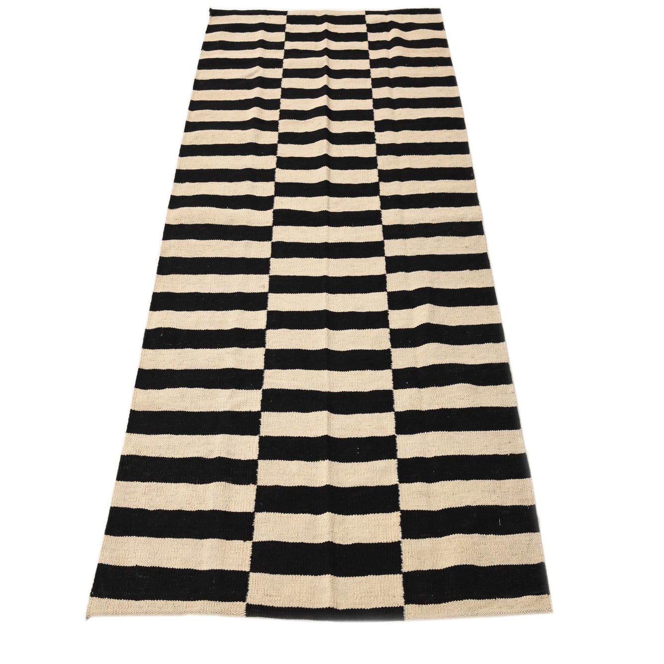 Hand-woven of 100% wool, this flatweave kilim presents a bold graphic of black and white horizontal bands. The pattern is arranged in three vertical panels— a centered column of consistent stripes flanked by offset striped panels—creating a rhythmic, geometric look that reads clean and contemporary. The high-contrast palette and straightforward geometry suit modern and minimalist sensibilities while nodding to traditional kilim weaving.