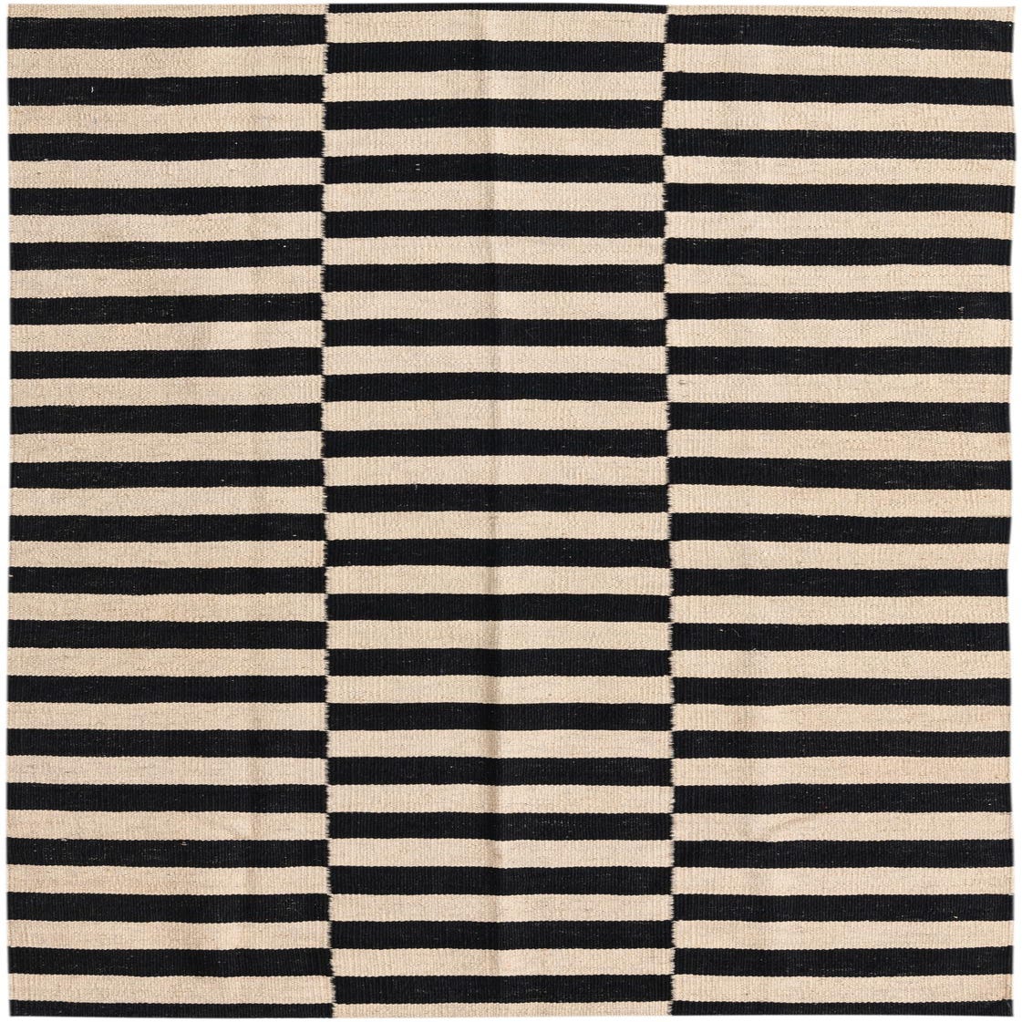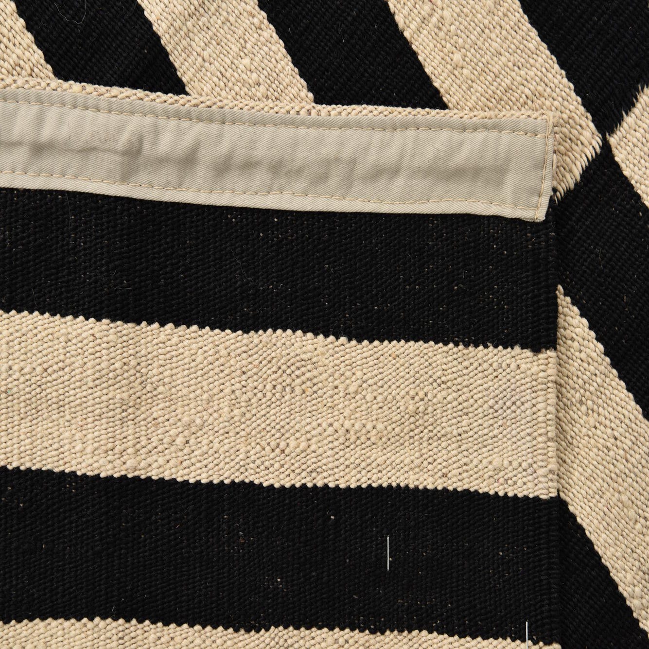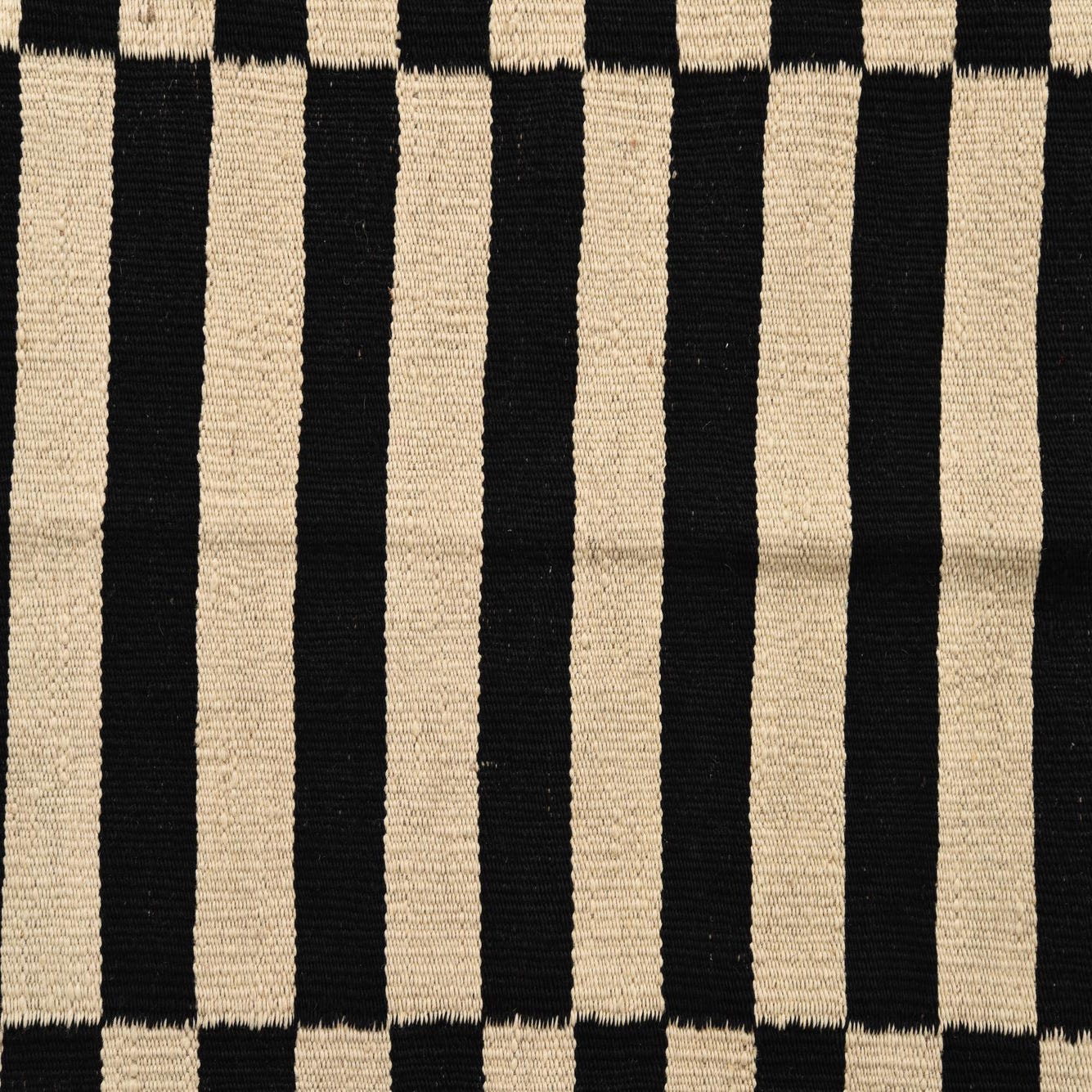 Hand-woven of 100% wool, this flatweave kilim presents a bold graphic of black and white horizontal bands. The pattern is arranged in three vertical panels— a centered column of consistent stripes flanked by offset striped panels—creating a rhythmic, geometric look that reads clean and contemporary. The high-contrast palette and straightforward geometry suit modern and minimalist sensibilities while nodding to traditional kilim weaving.