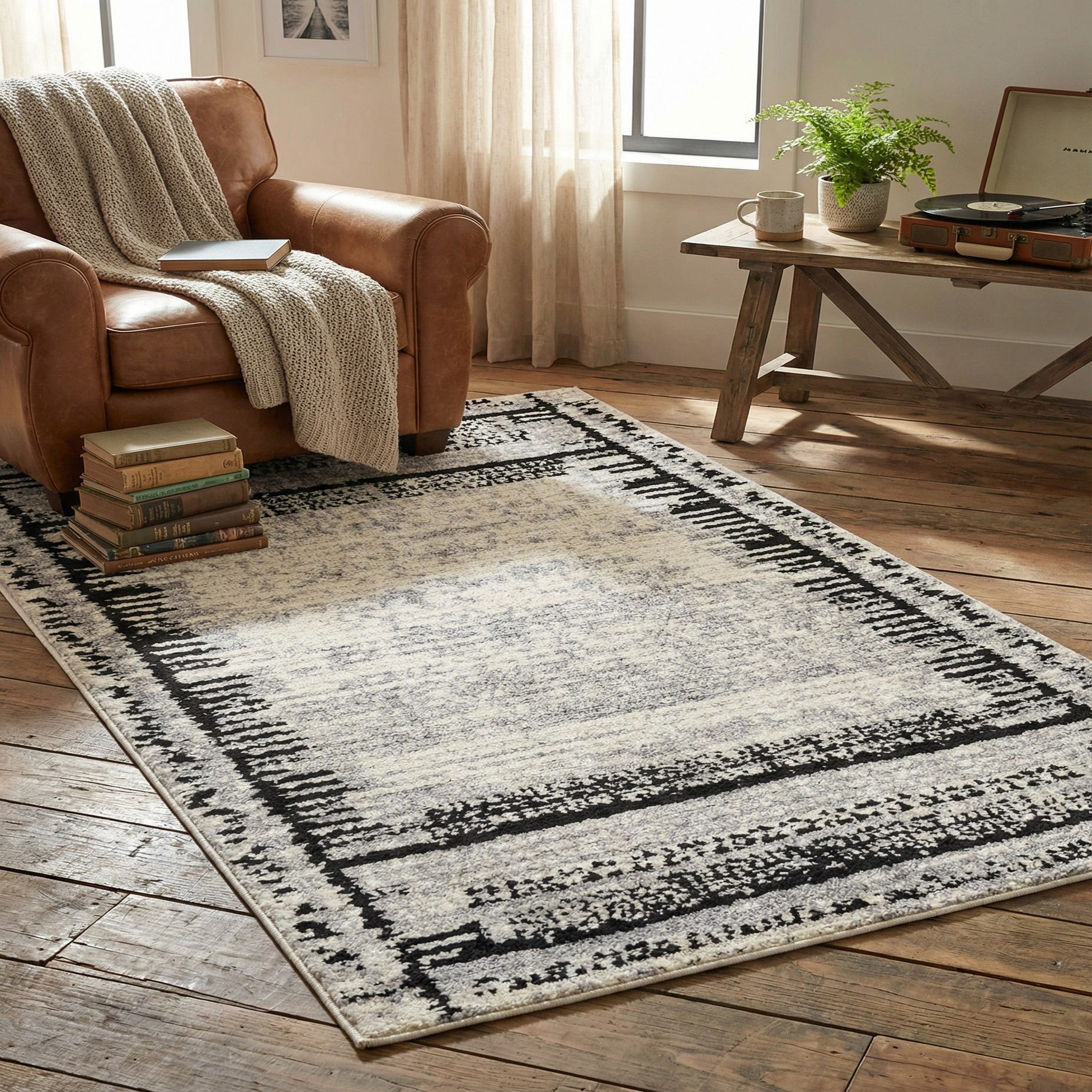 Primary color is Black and White. Colors in this rug include: Black and White, Gray.