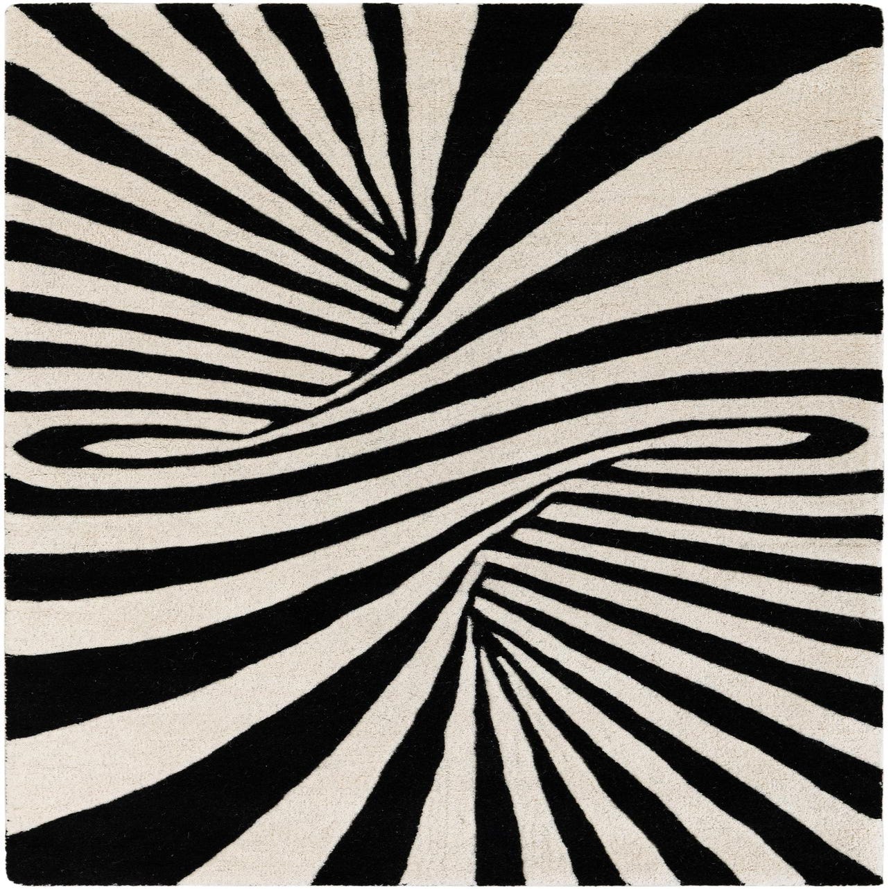 A 3x5 rectangular black and white modern wool rug with a swirling optical illusion pattern, creating a vortex effect.