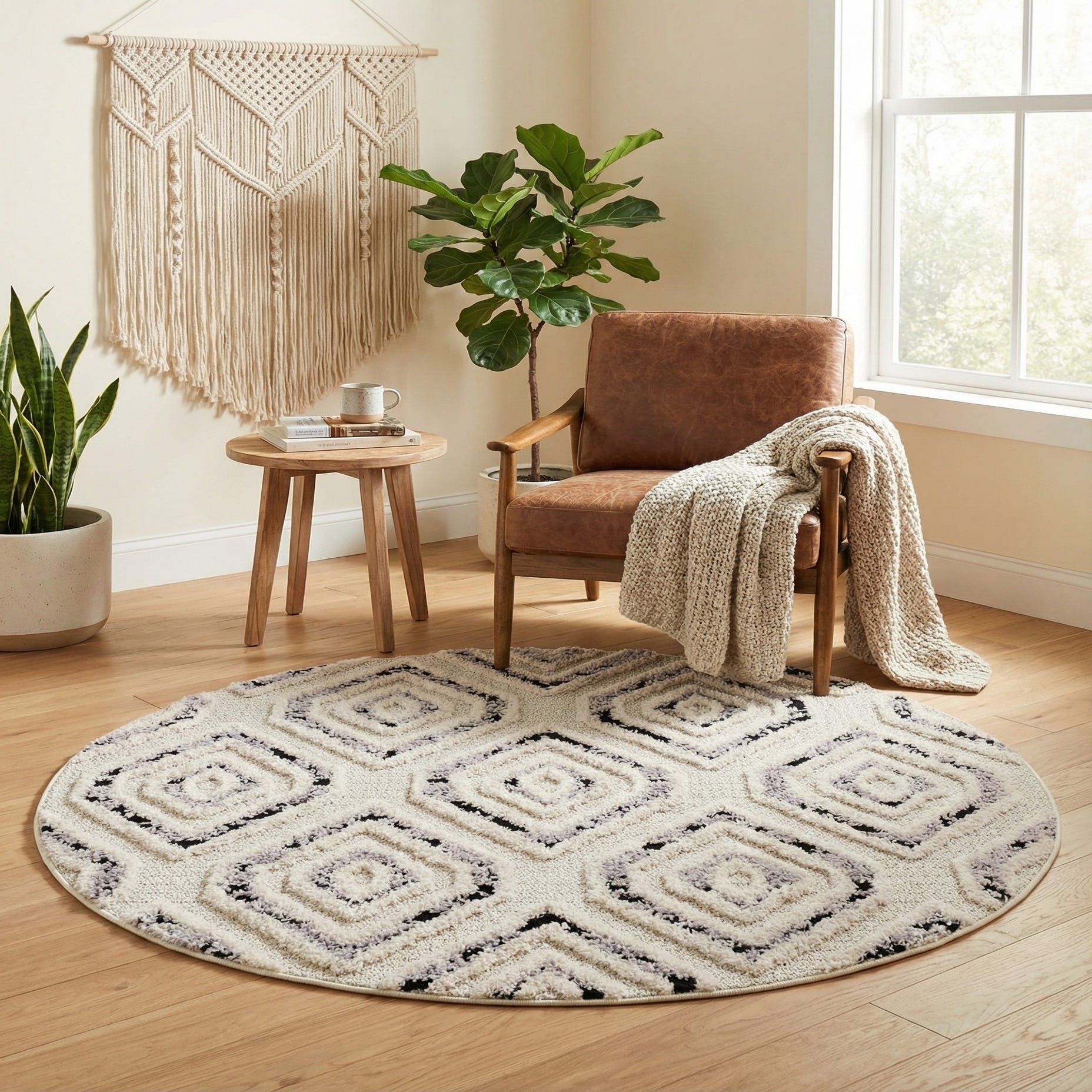 This round design works well beneath a circular coffee table, as a cozy anchor at the foot of a bed, or in a reading nook where texture is the focus. It pairs easily with minimalist, modern, or transitional decor—think light wood furniture, black metal accents, or a neutral sofa—adding pattern and warmth without overpowering the room.