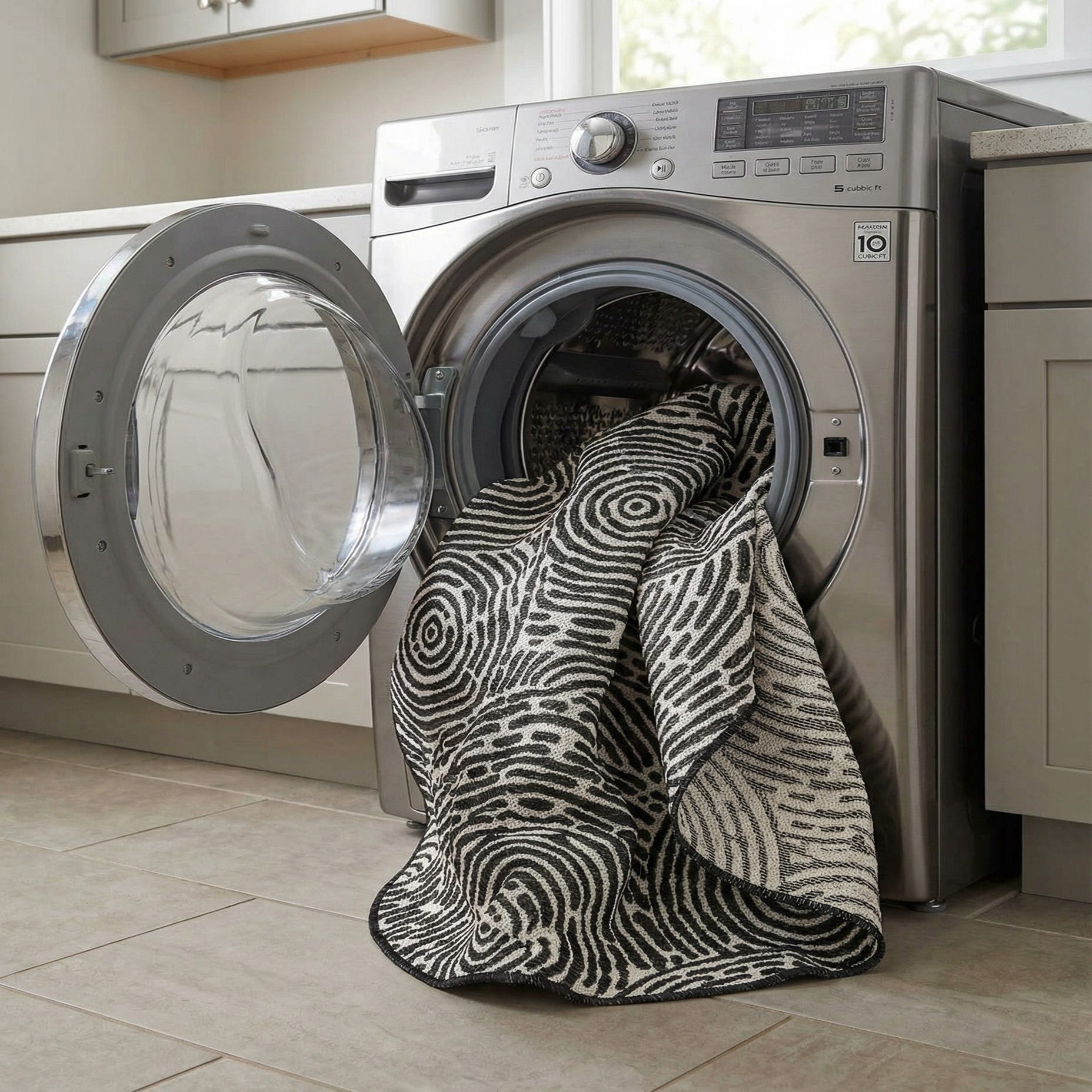 A 4' round black and white modern abstract rug with swirling fingerprint-like patterns, suitable for indoor or outdoor use.