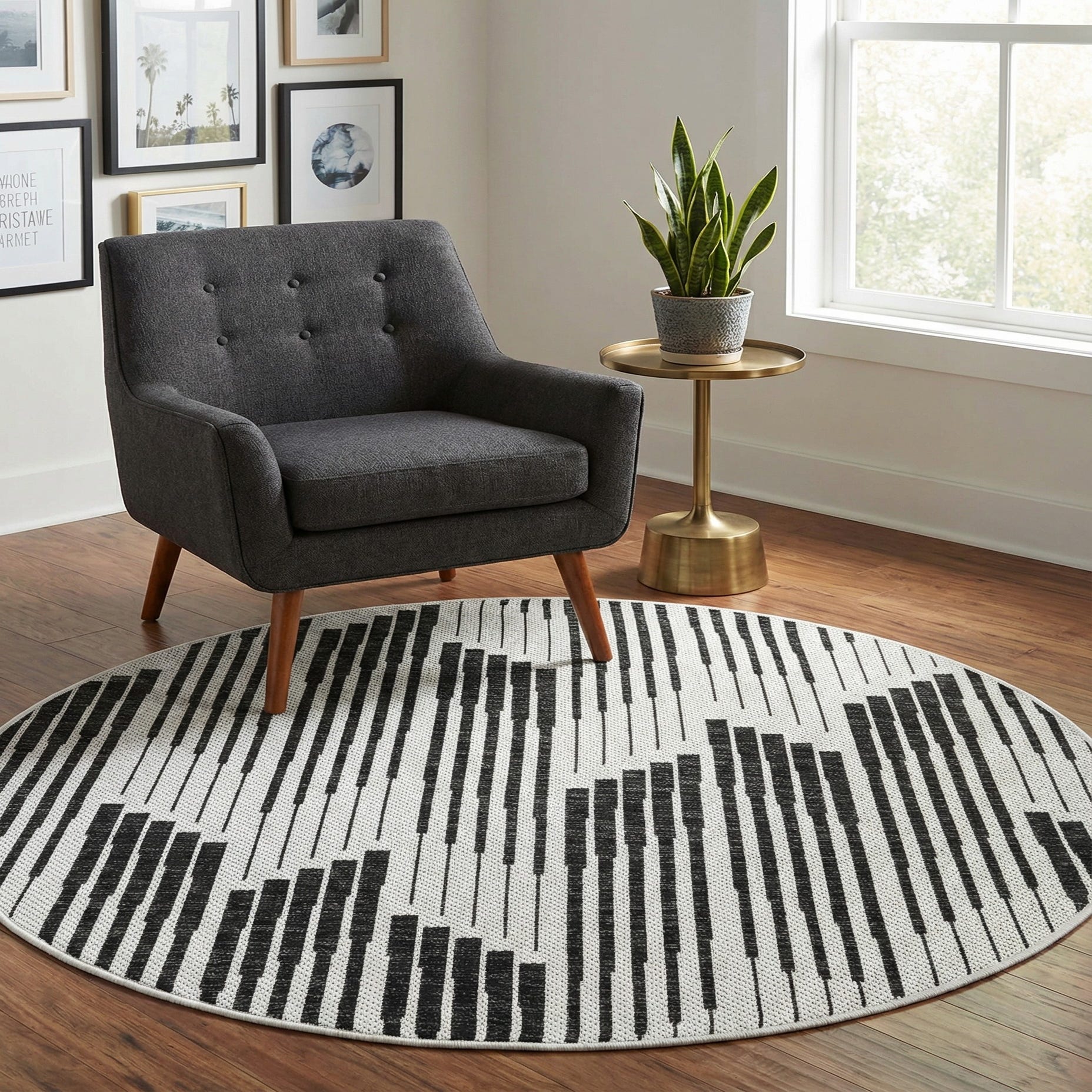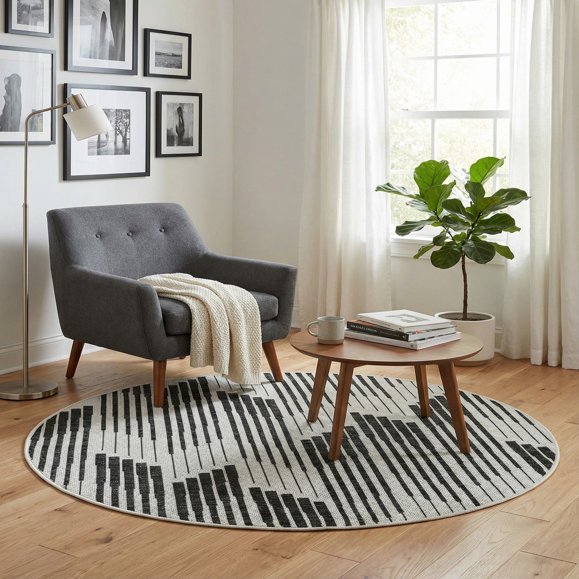 A 4' 1 round black and white outdoor rug with a modern striped geometric pattern, ideal for patios.