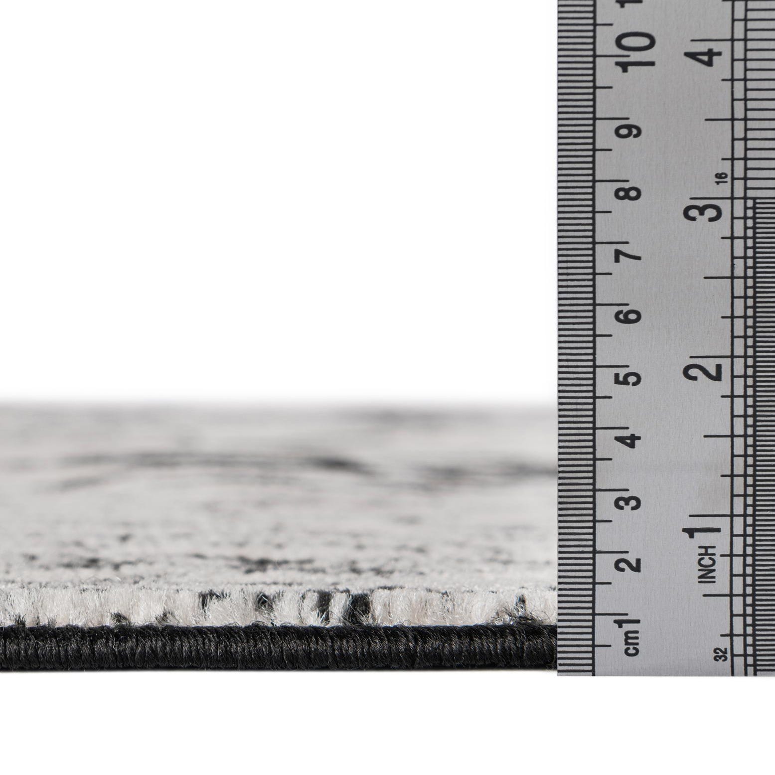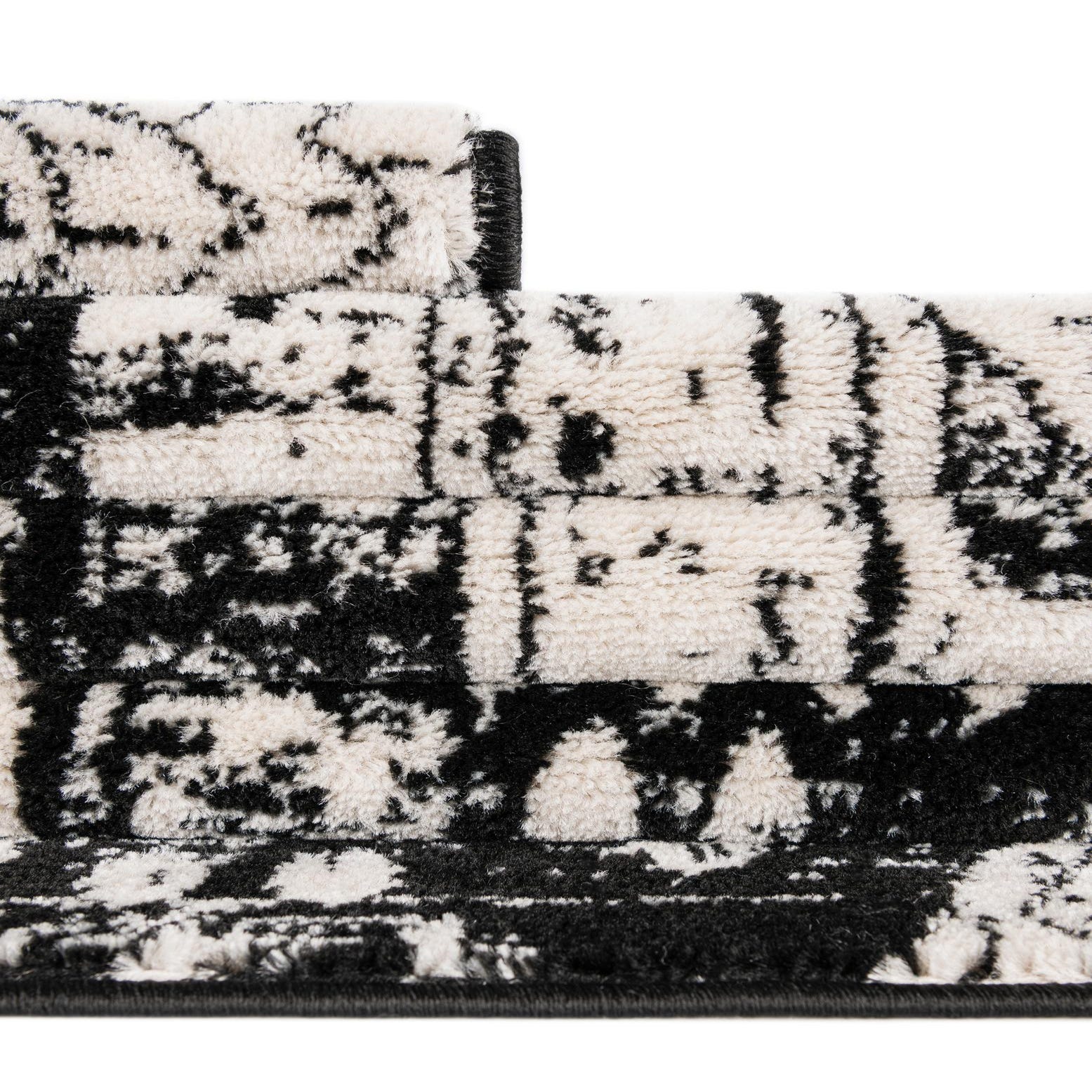 A bold black-and-white palette gives this rug a graphic, updated-vintage look. Vertical banding, distressed medallion fragments and textured overlays combine into an abstract, tribal-inspired pattern that reads modern and lived-in at the same time. The background is black and white with strong black patterning across the field, creating high contrast and clear definition. Machine-made from 85% polypropylene and 15% polyester, the low, dense pile feels smooth and slightly firm underfoot while remaining soft enough for everyday living.