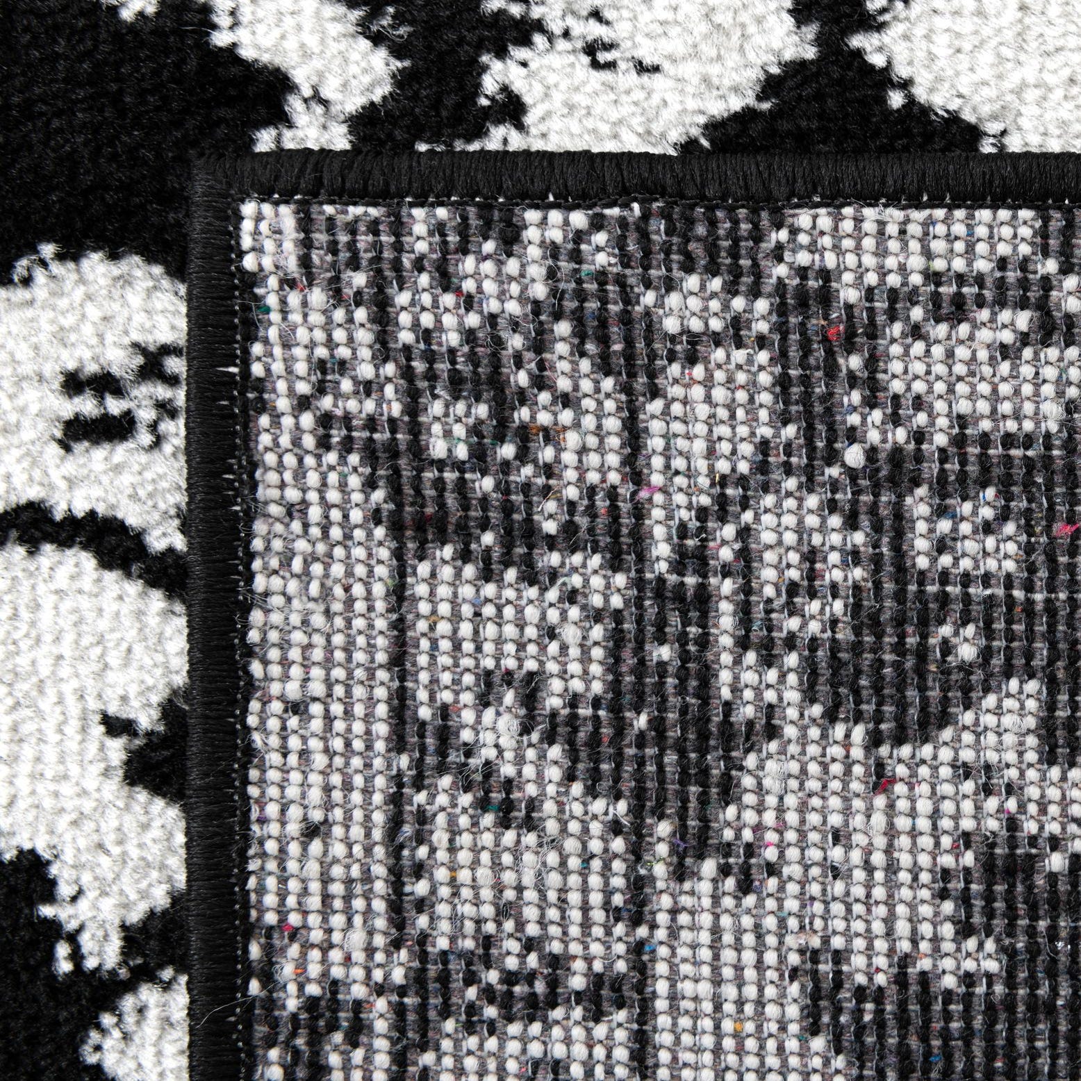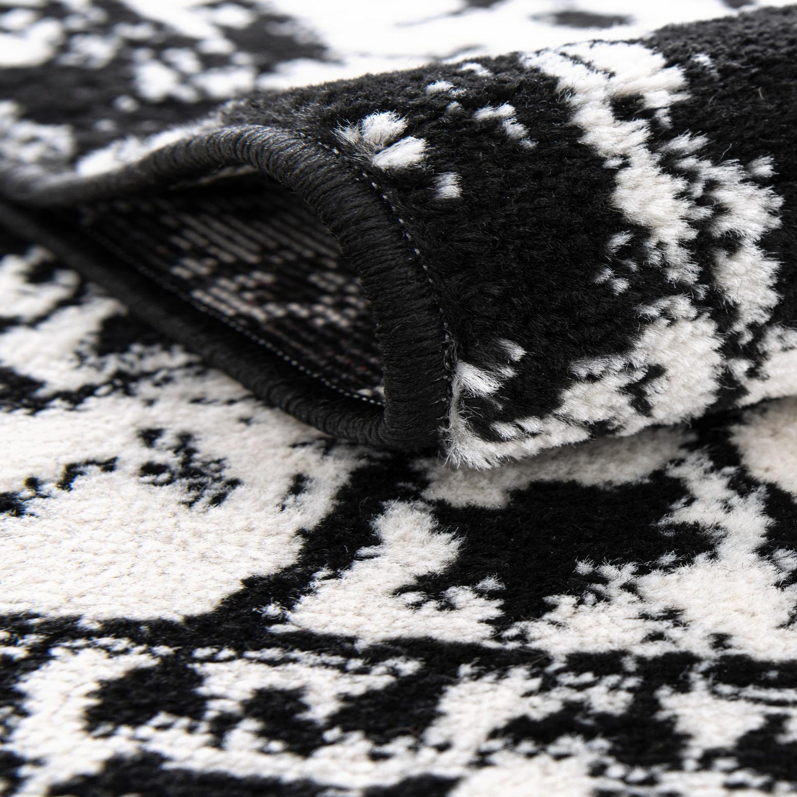 A high-contrast, vintage-inspired design anchors this machine-made rug. Classical floral and medallion motifs are rendered in bold black against a black-and-white ground, with a distressed finish that gives the pattern a lived-in, layered look. The border contains repeating floral accents that frame the center field, and the overall effect is a balanced mix of traditional ornament and modern graphic contrast. Made from 85% polypropylene and 15% polyester, the rug has a low-profile, dense pile that feels soft underfoot while holding its shape.
