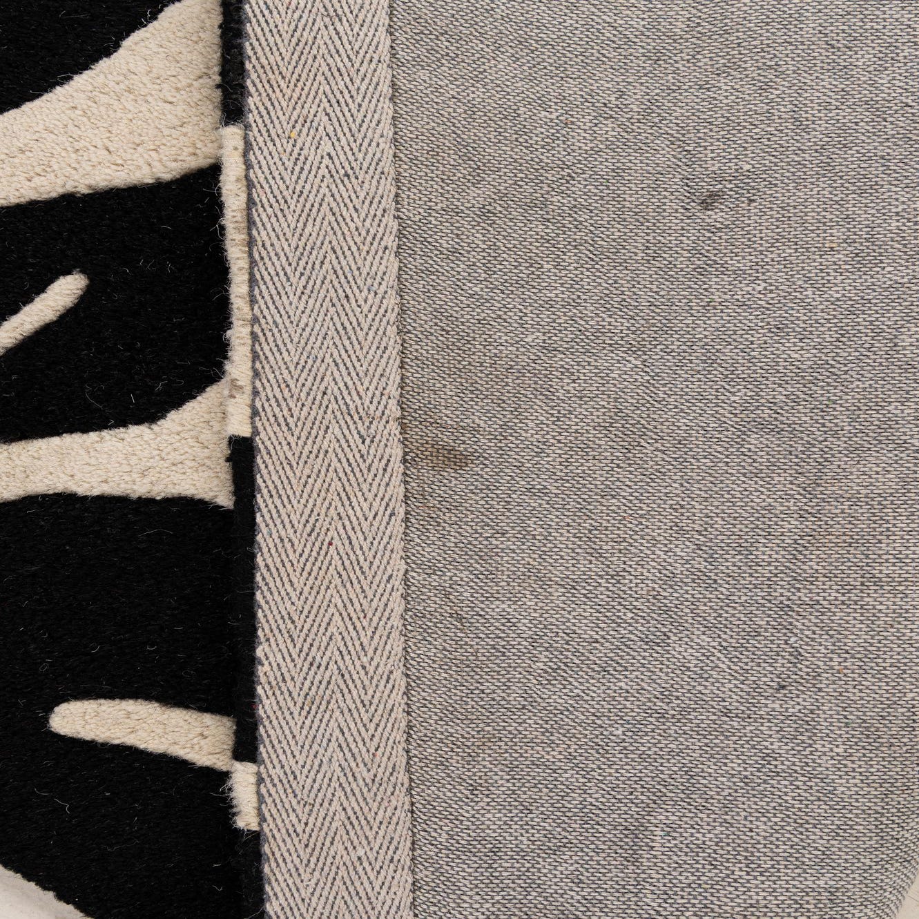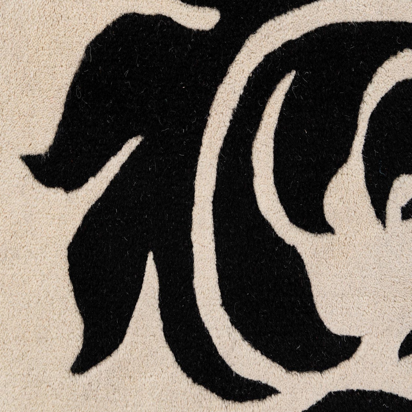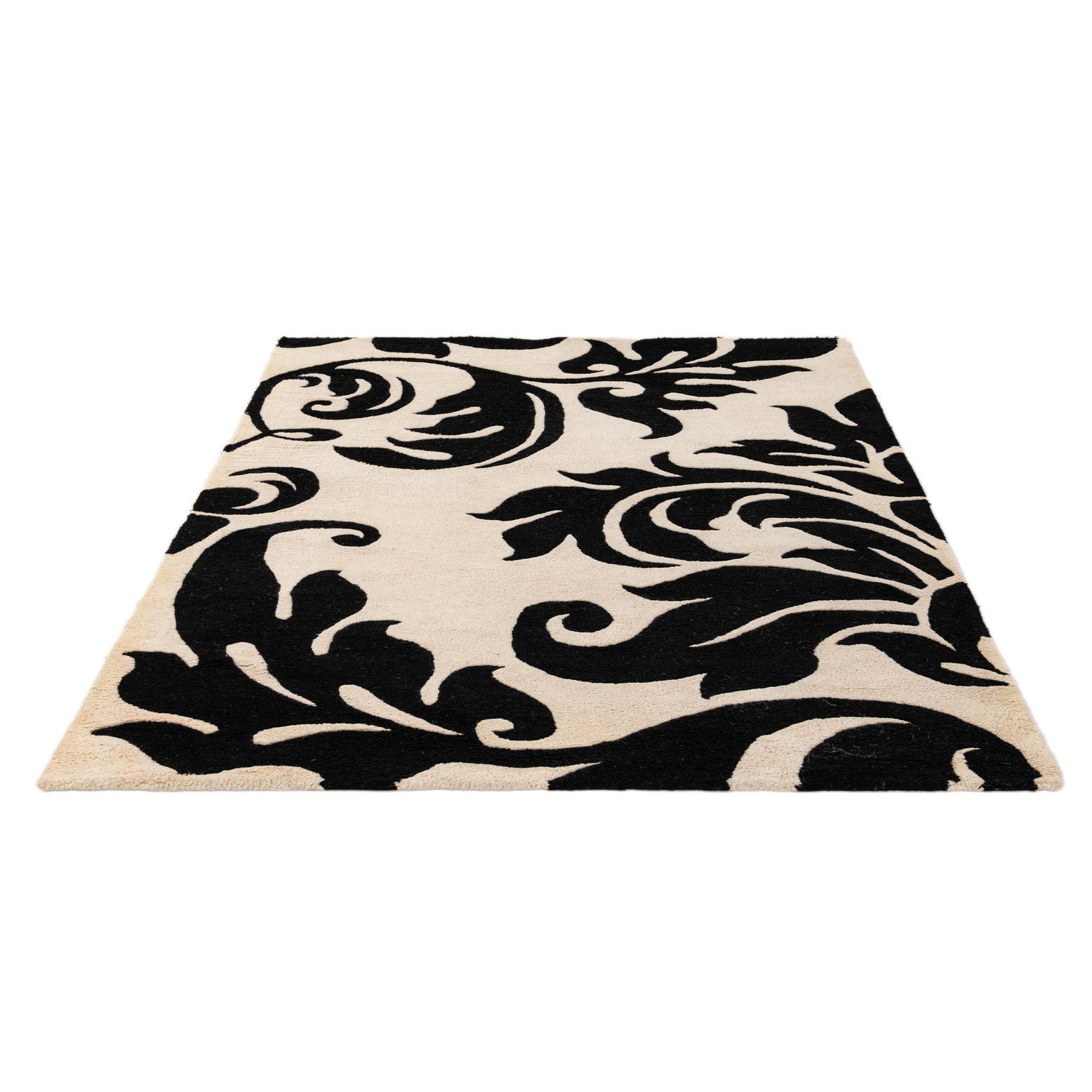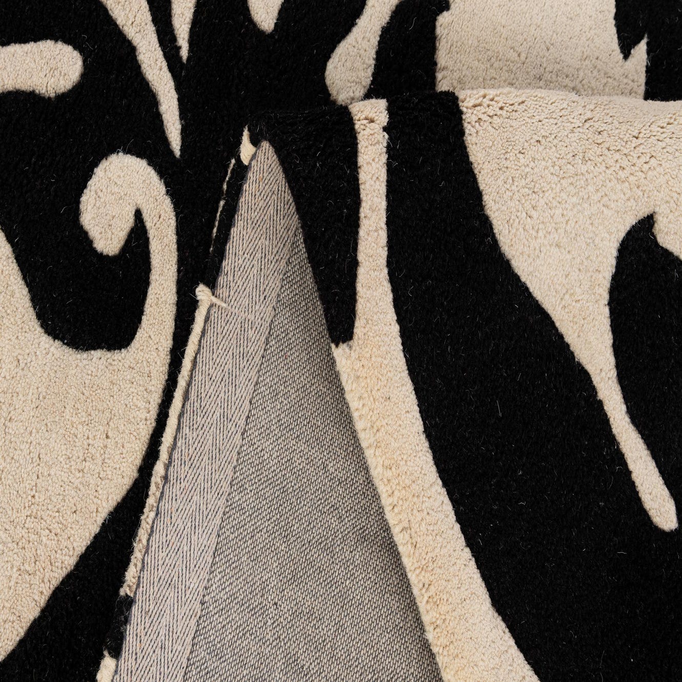 A 4x6 rectangular black and ivory modern wool rug with a bold, high-pile floral scroll pattern.