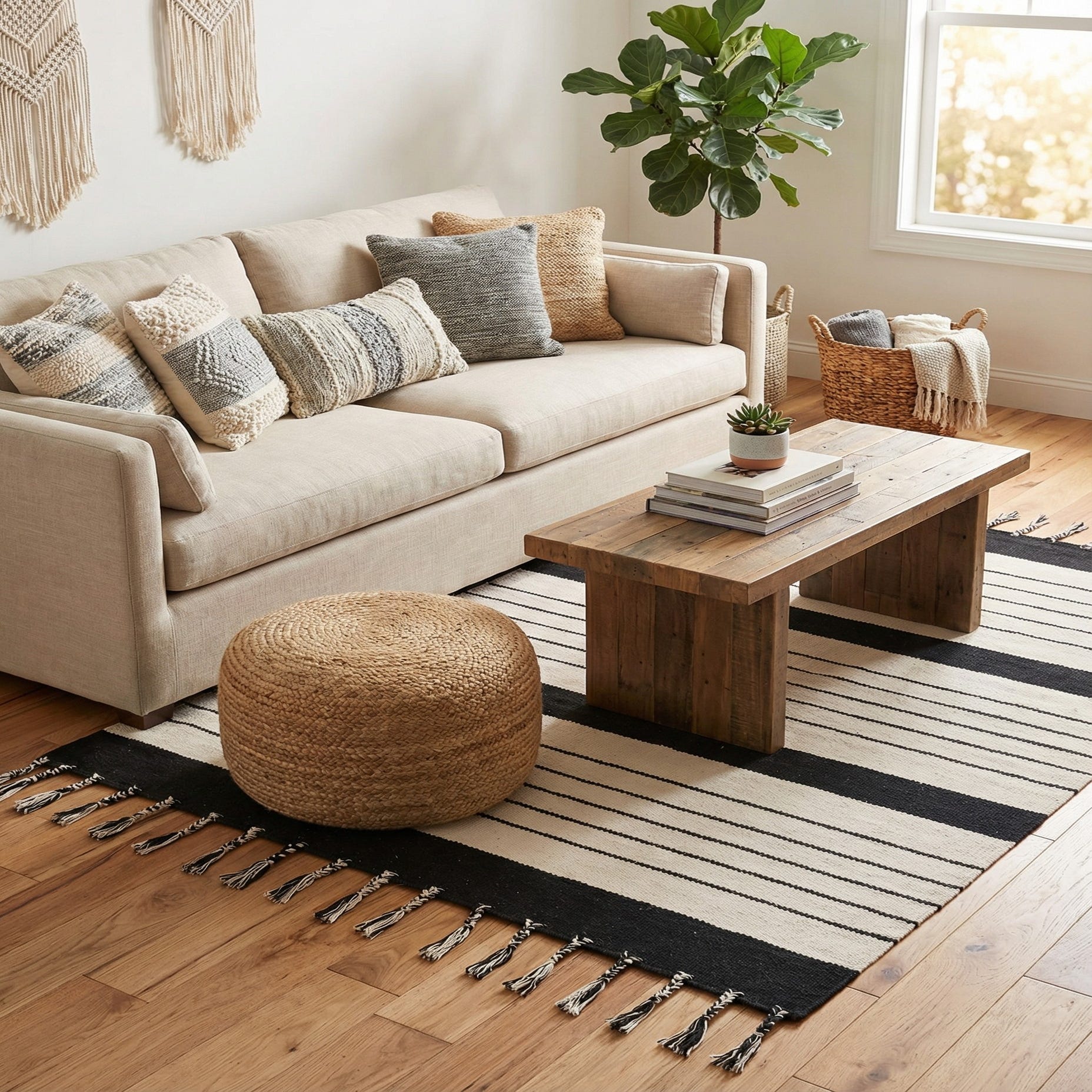 The monochrome palette and linear design work well in modern, Scandinavian, or minimalist interiors, and they also provide a strong contrast in farmhouse or coastal schemes. Place it to define a small seating area, anchor a reading nook, or add structure to an entry or kitchen space; it layers nicely over a larger neutral for added depth. Pair with light wood furniture, metal accents, and textured textiles to balance the bold stripes without overwhelming the room.