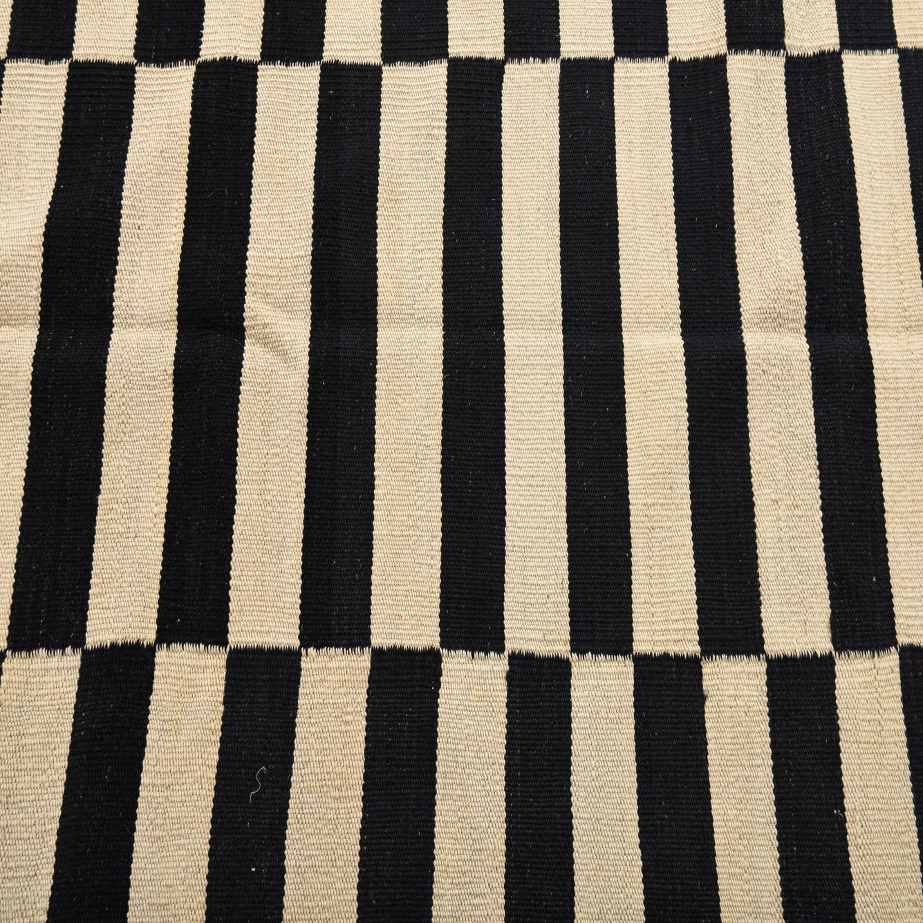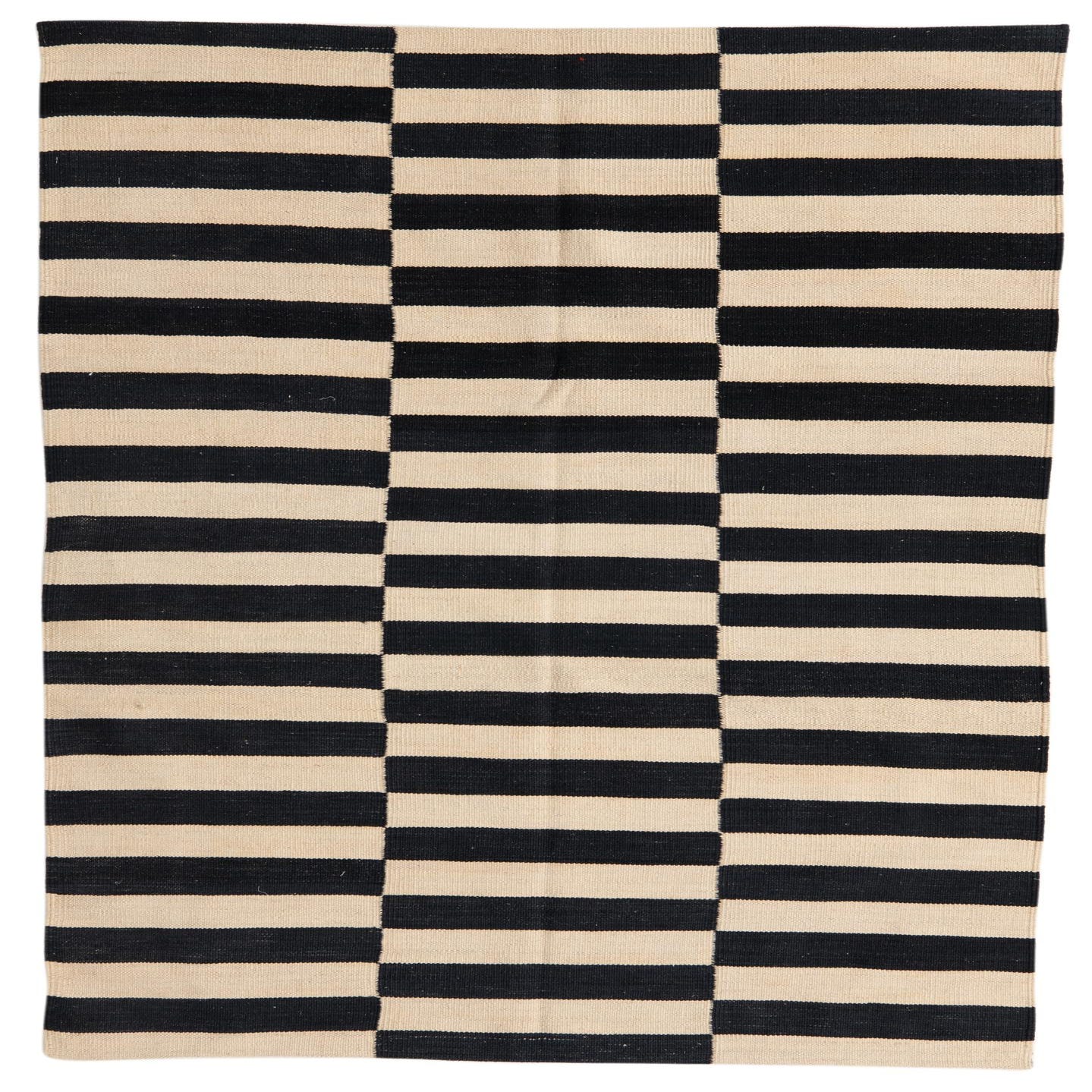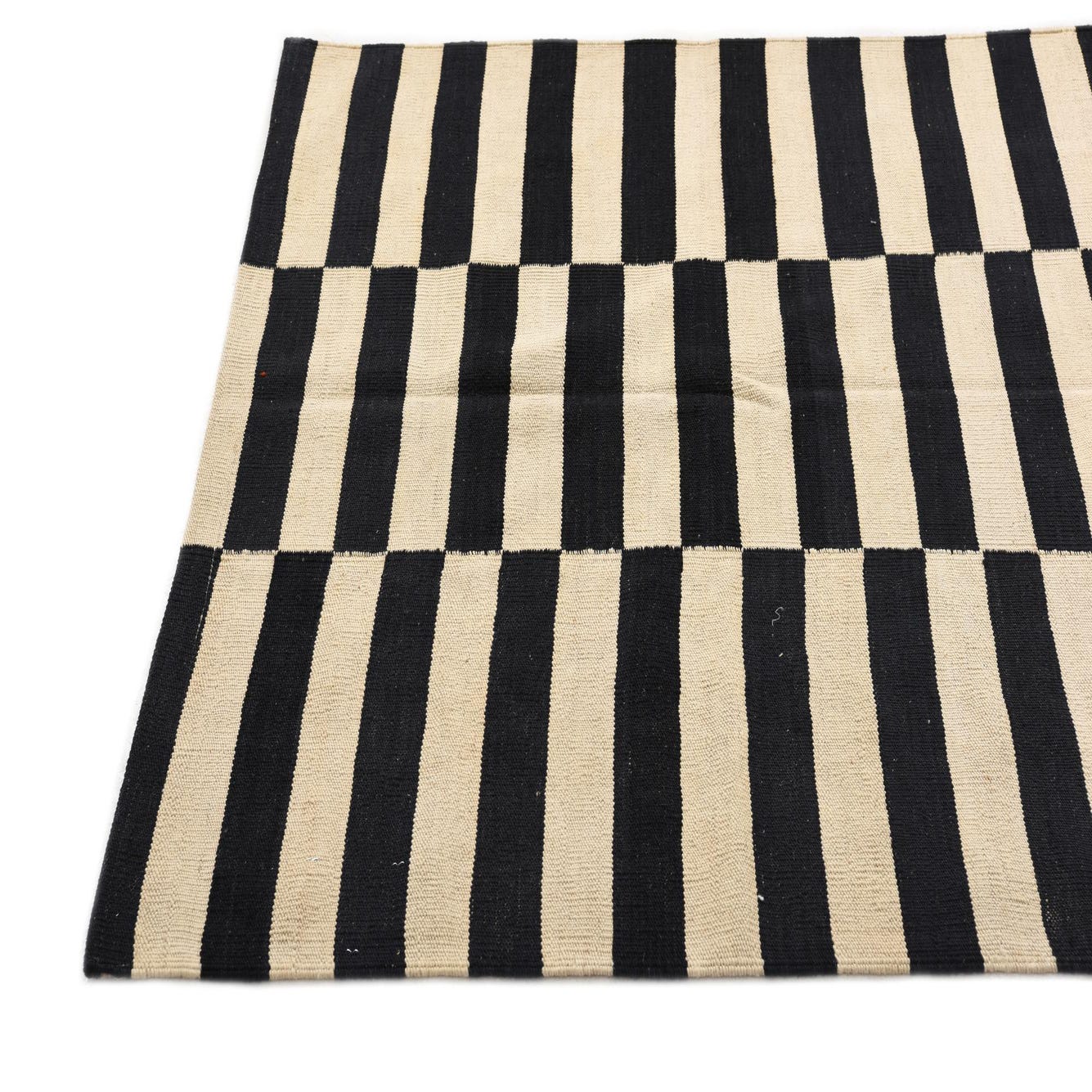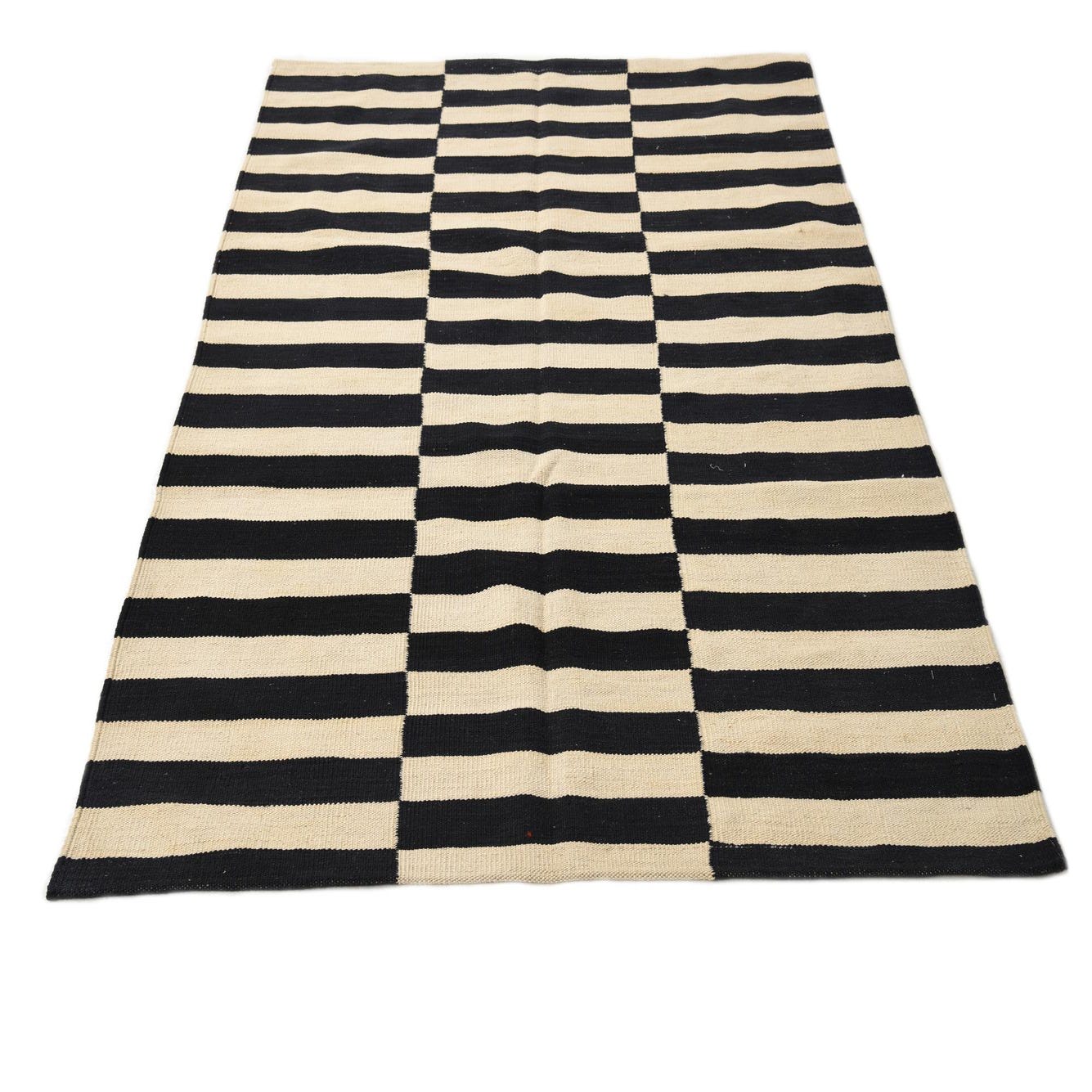 This hand?woven, 100% wool kilim presents a graphic stripe motif arranged in three vertical panels. Narrow horizontal bands alternate in black and white to create a structured, geometric layout with clean edges and a slight irregularity from the handweaving. The flatweave surface is low?profile and tightly woven, offering a firm, tactile feel with the subtle texture and natural variance you expect from wool kilims.