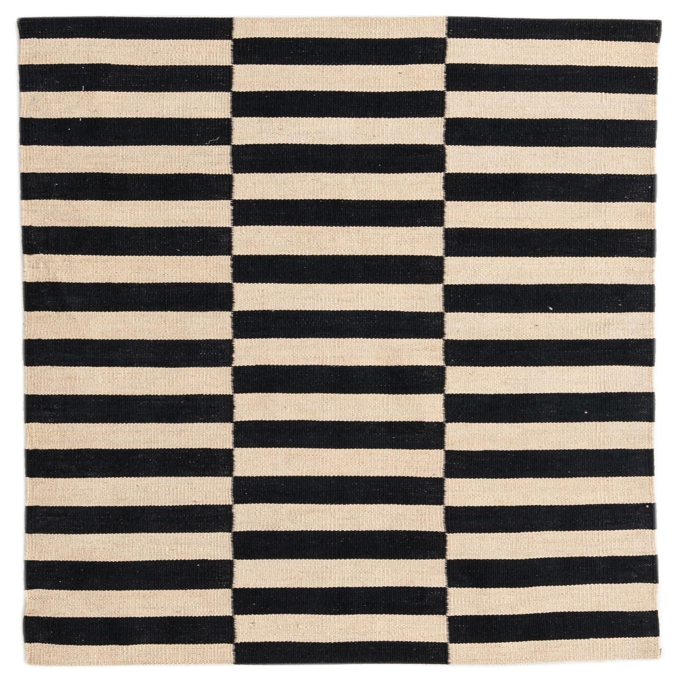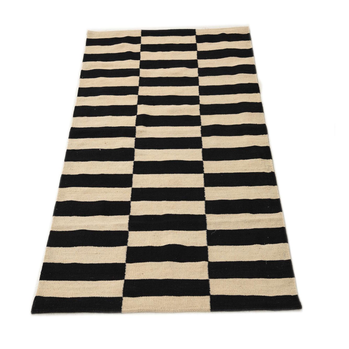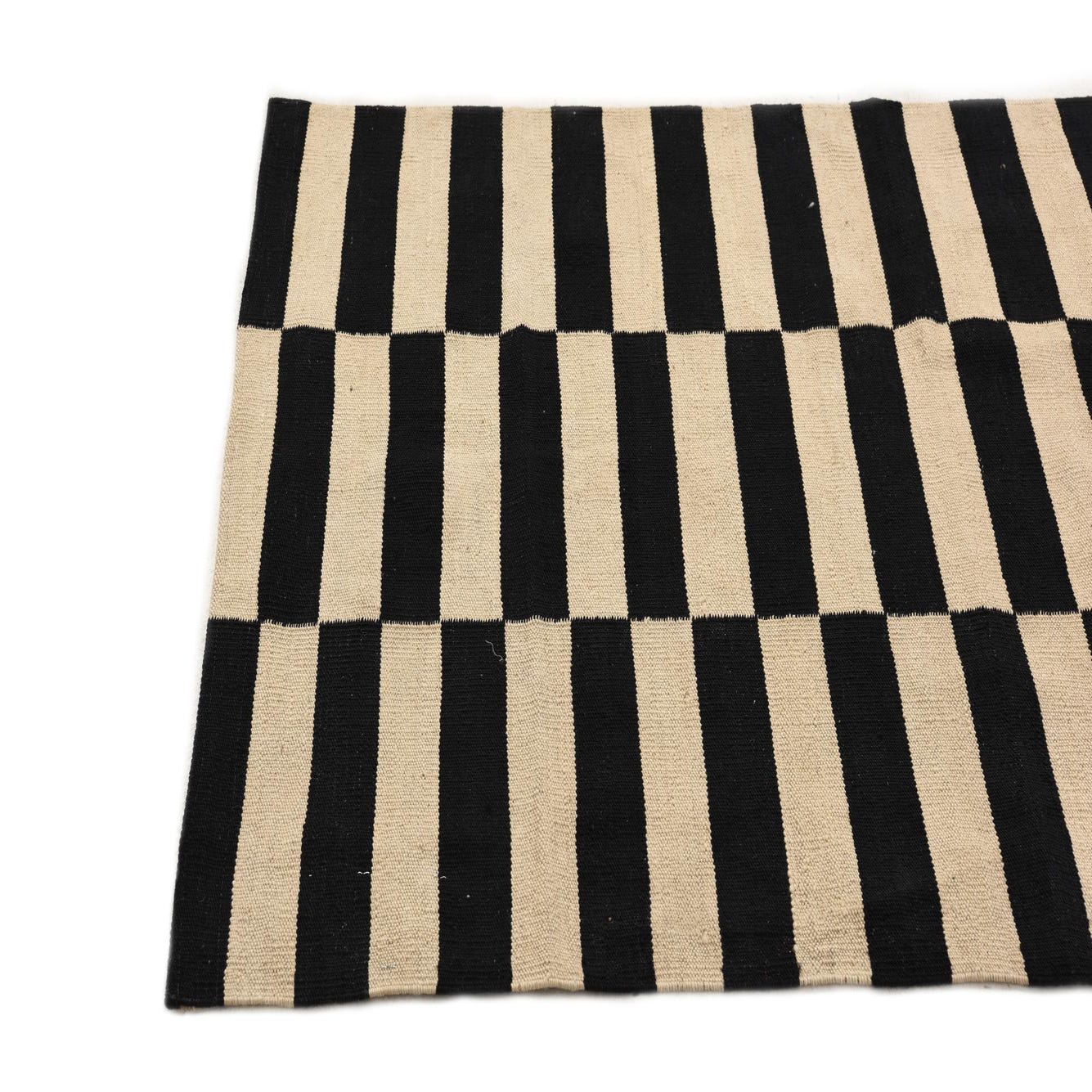 A 4x6 rectangular black and cream flatweave wool rug with a bold striped tribal pattern, suitable for a living room.