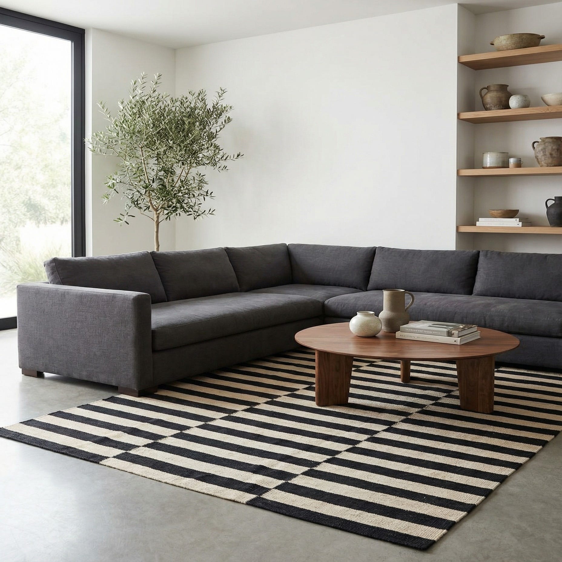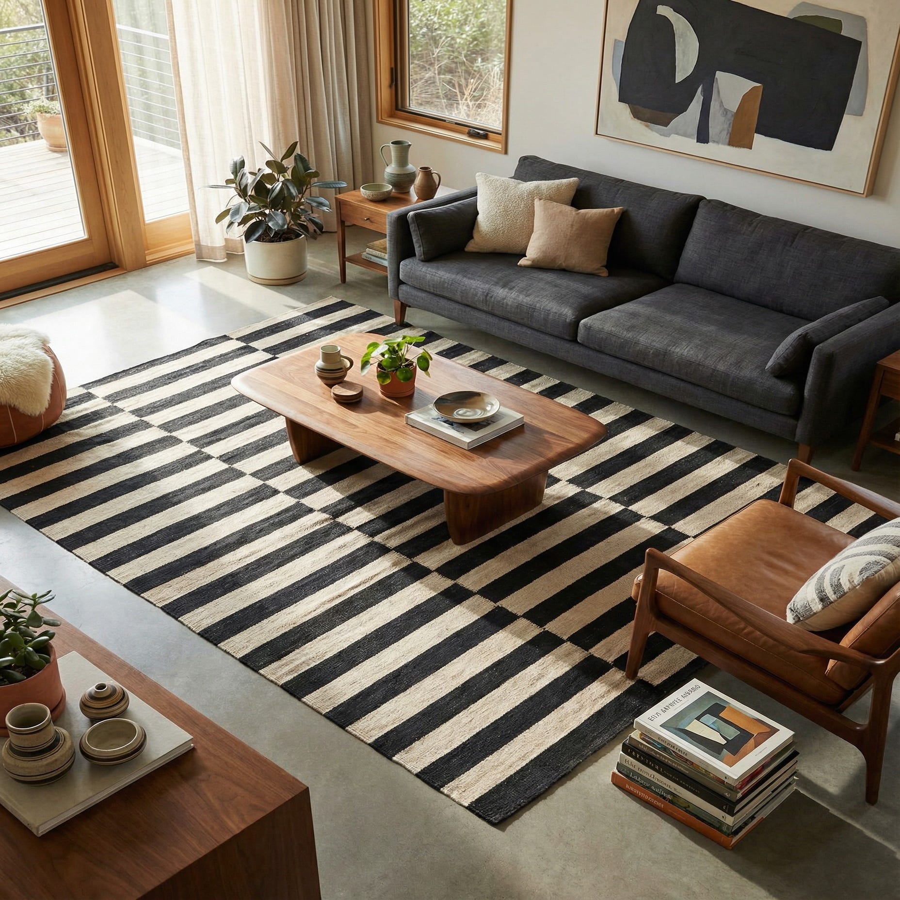 This rug pairs easily with minimalist and contemporary interiors—place it under a coffee table in a living room, in an entryway to anchor a console, or layered on hardwoods to add pattern without bulk. It also complements mid-century and industrial furnishings when combined with warm wood, leather, or metal accents, or it can act as a neutral graphic backdrop for colorful pillows and artwork in a studio or home office.