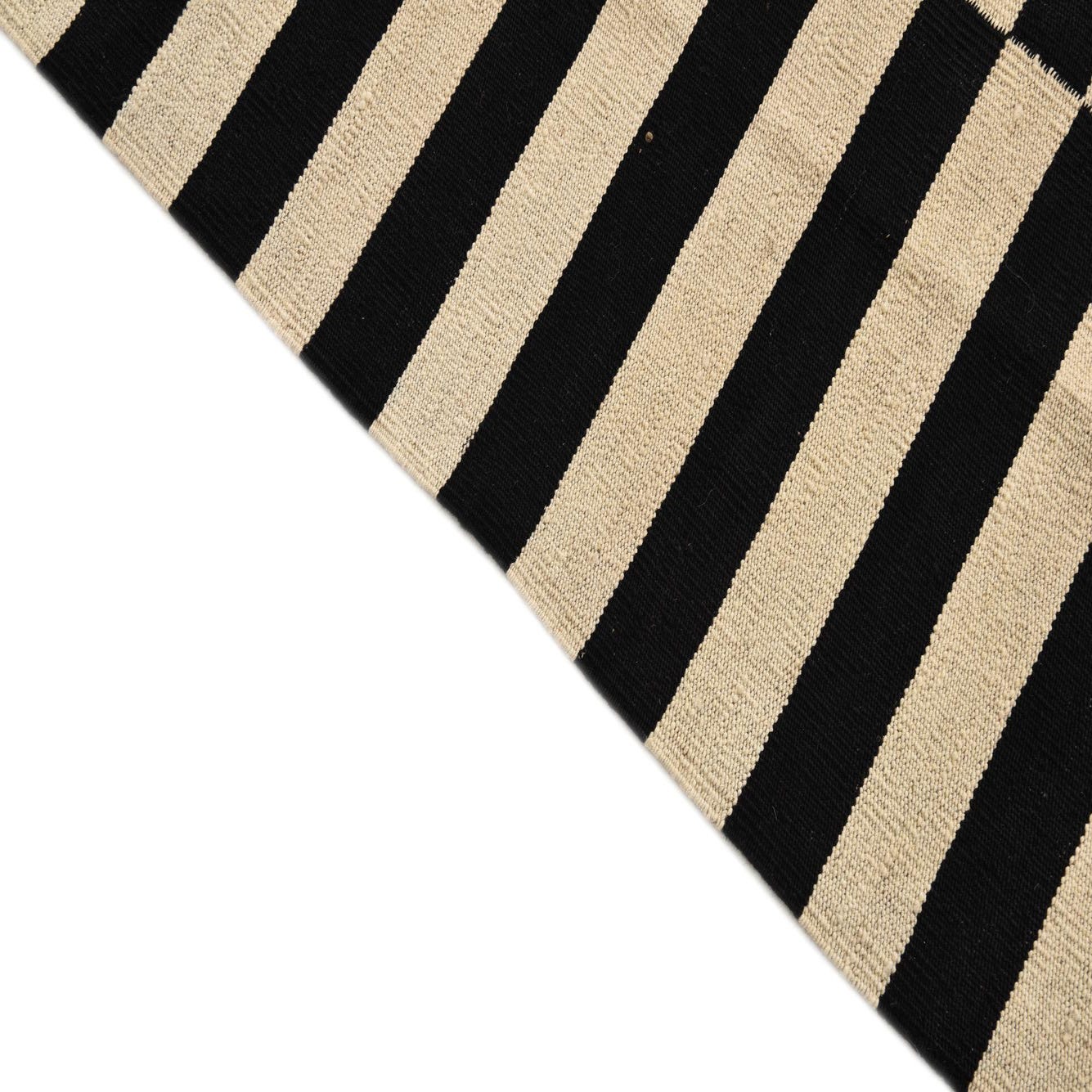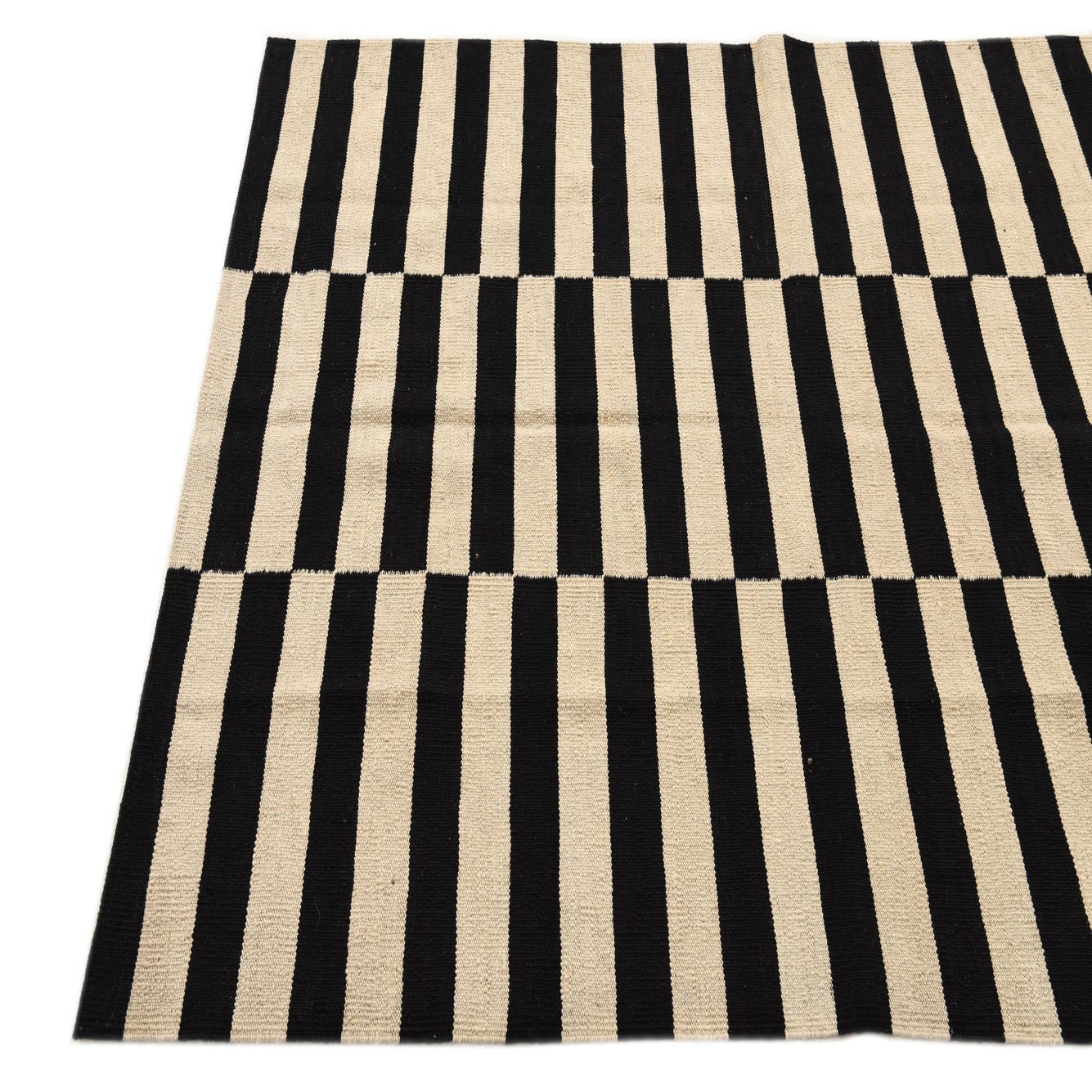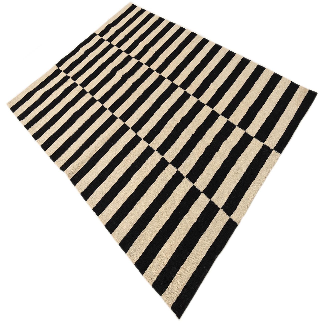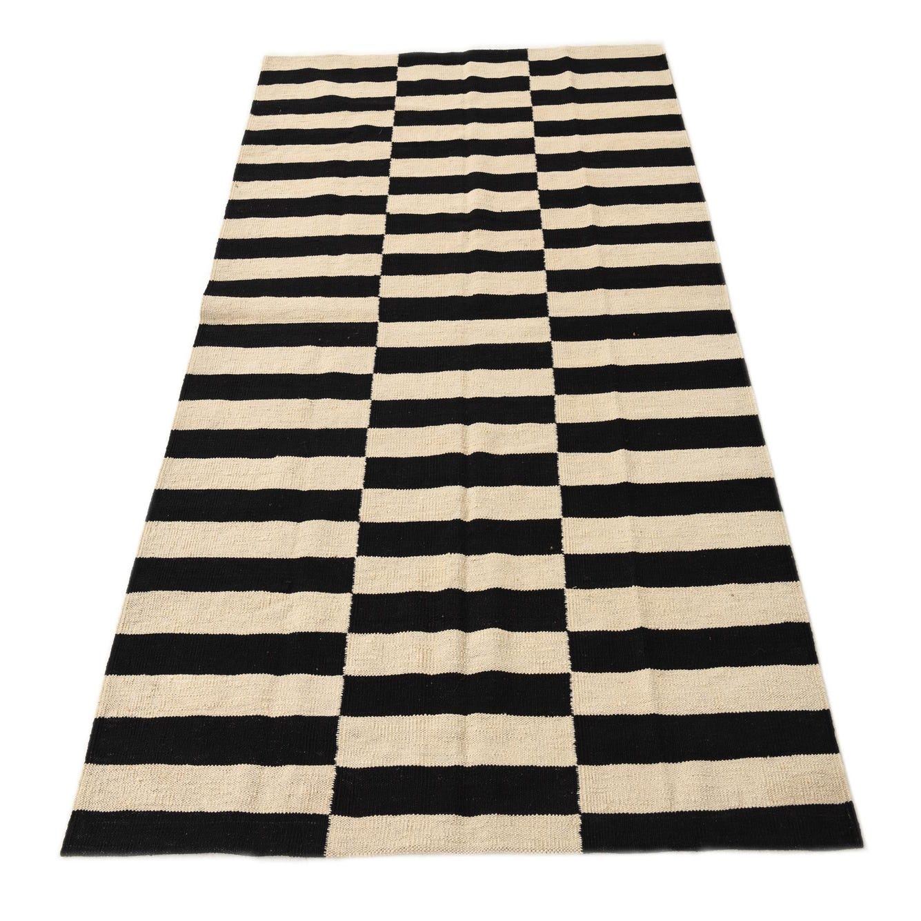 A 4x6 rectangular Kilim Modern rug with a bold black and ivory striped pattern, suitable for a living room.