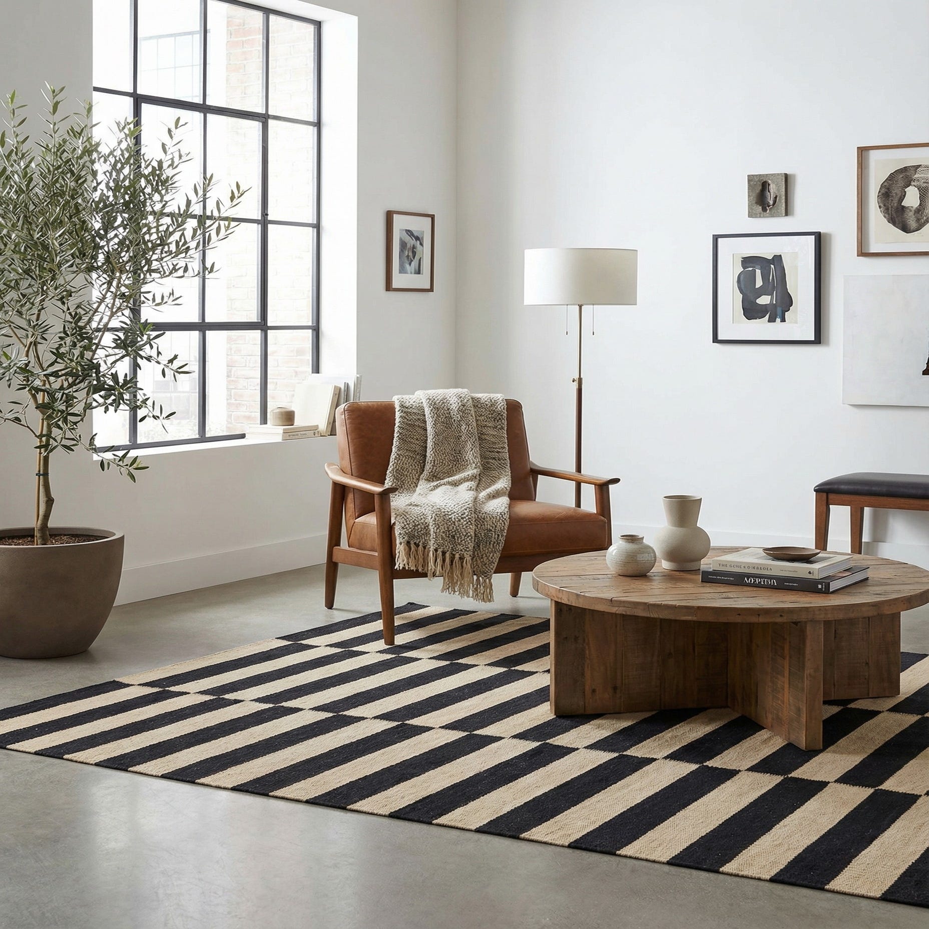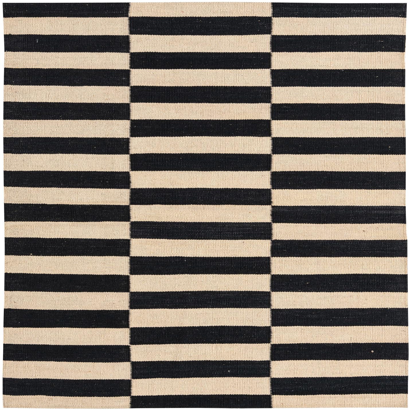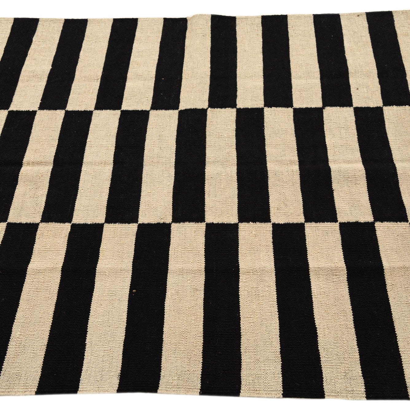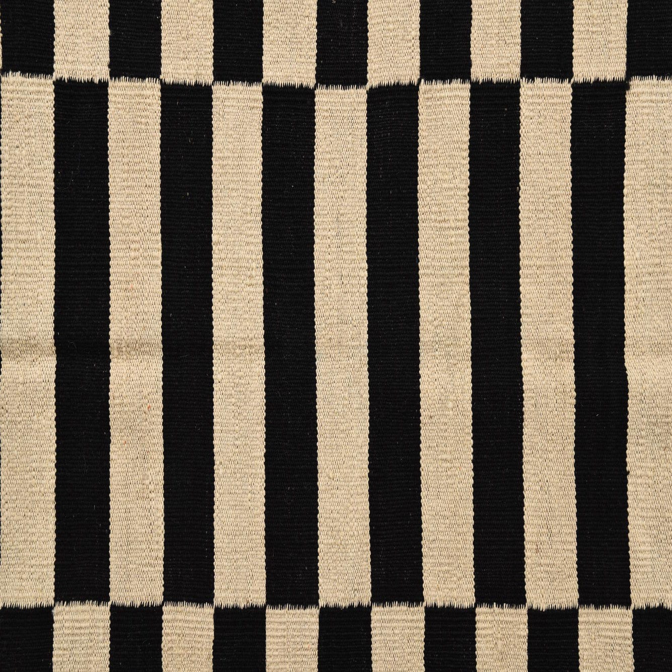 A 4x6 rectangular Kilim Modern rug with a bold black and ivory striped pattern, suitable for a living room.