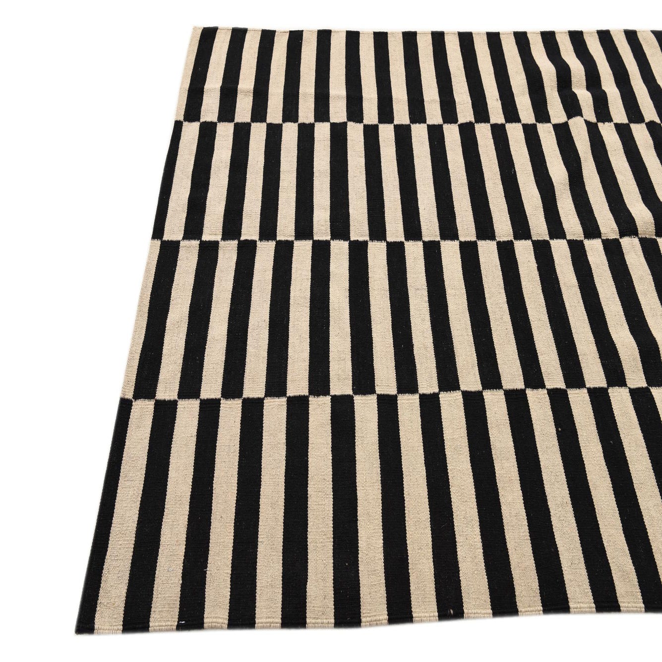 A 4x6 rectangular Kilim Modern rug with a bold black and cream horizontal stripe pattern, shifted in the middle column.