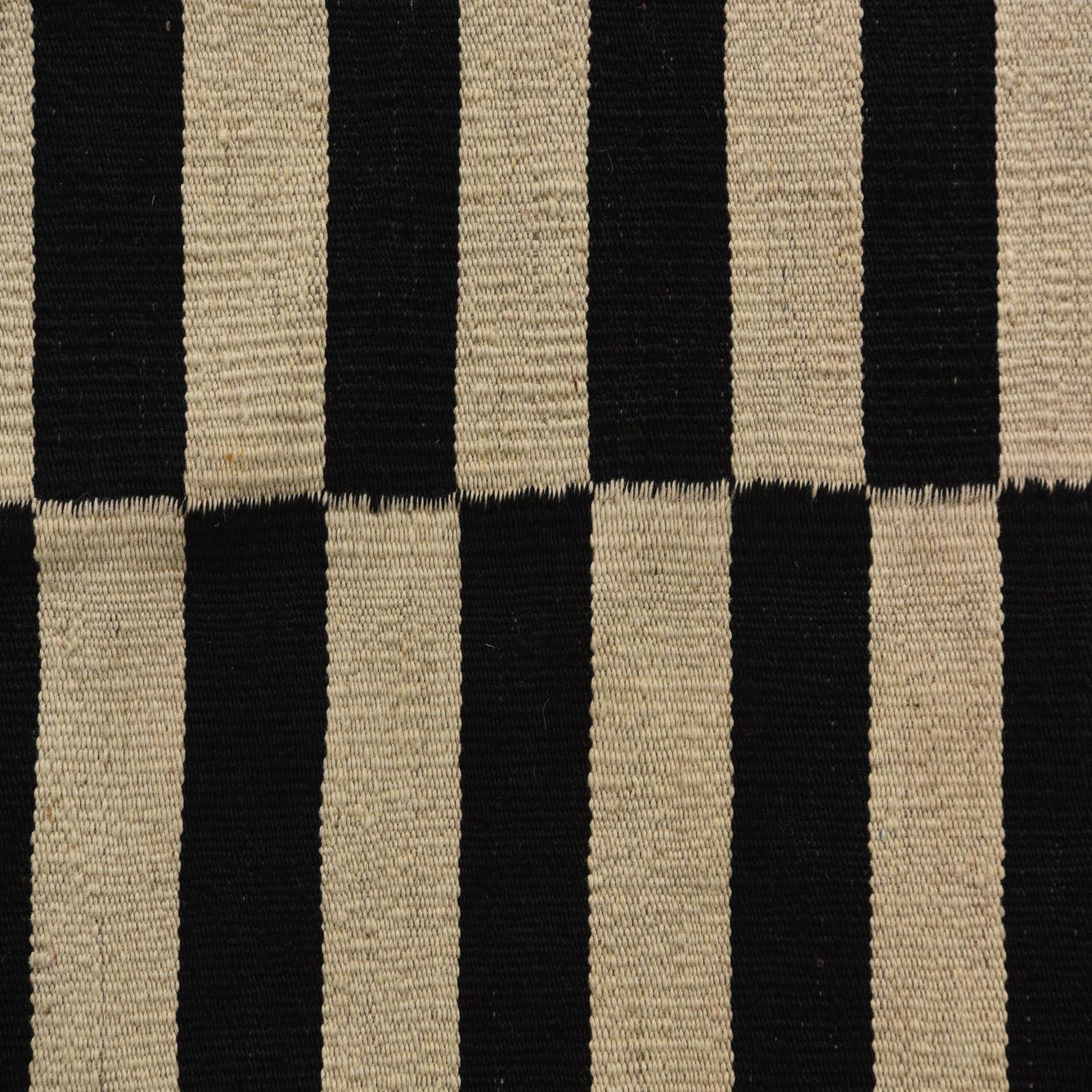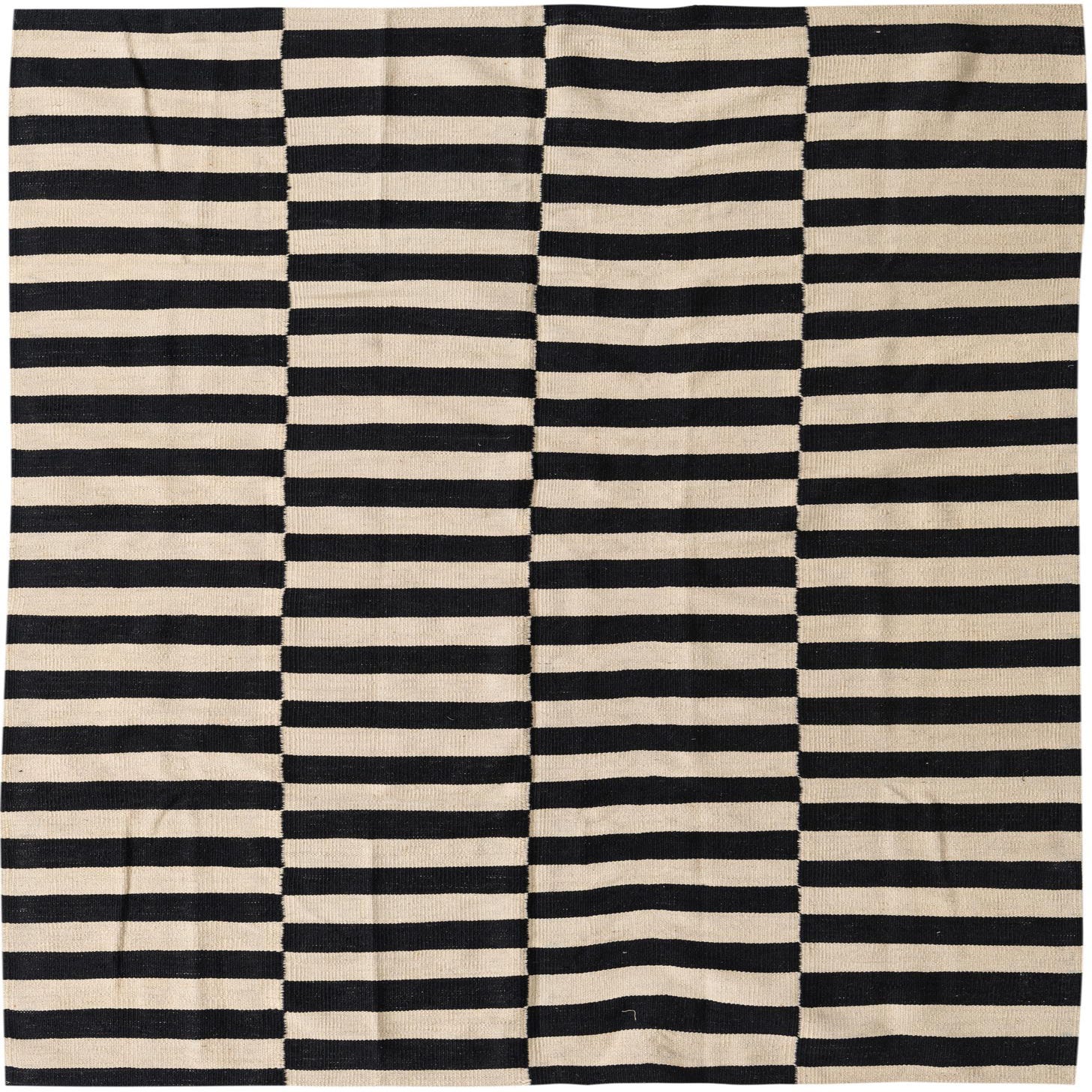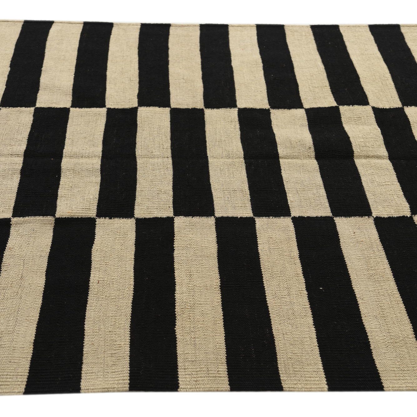 A 4x6 rectangular flatweave rug with a bold black and ivory striped pattern, perfect for a modern living room.