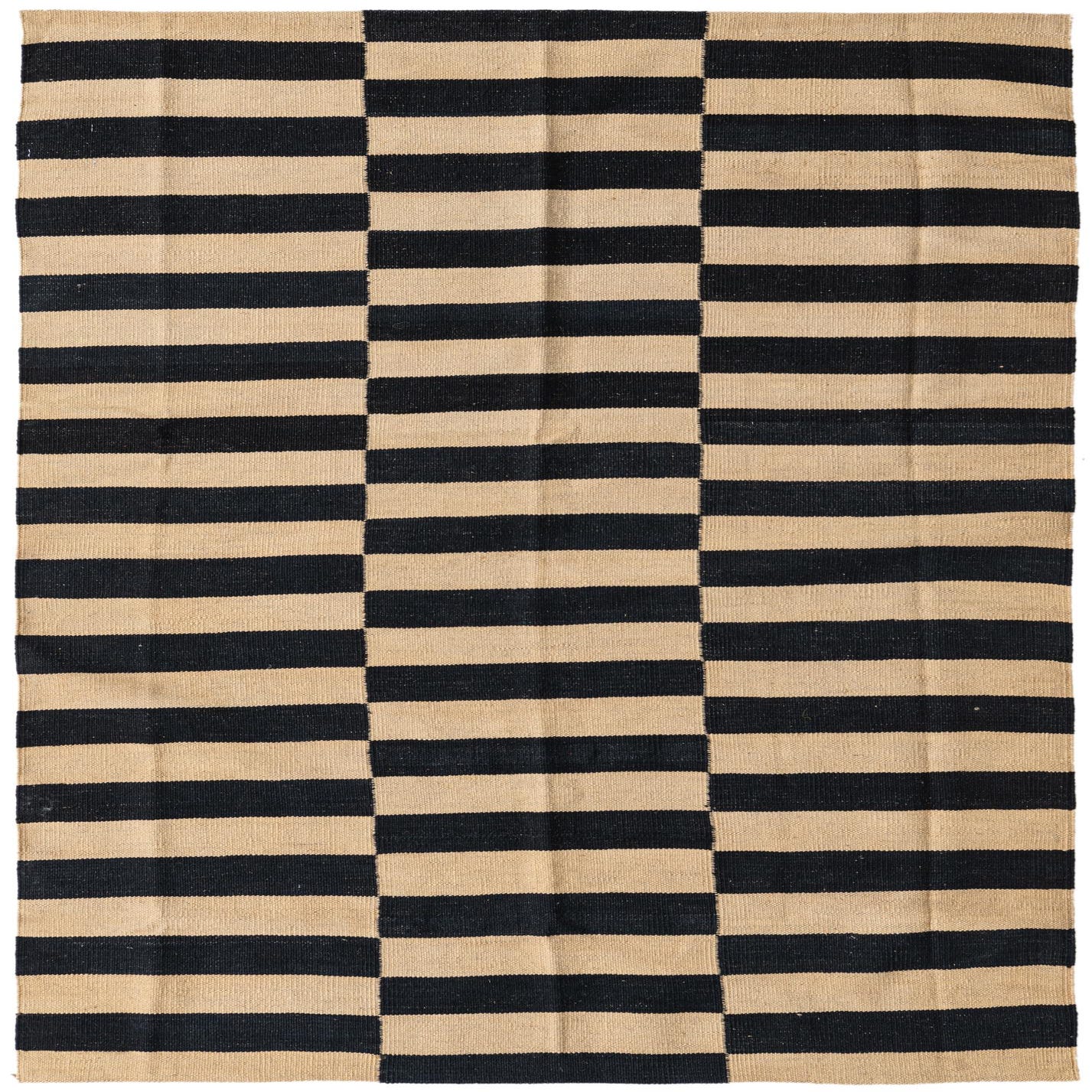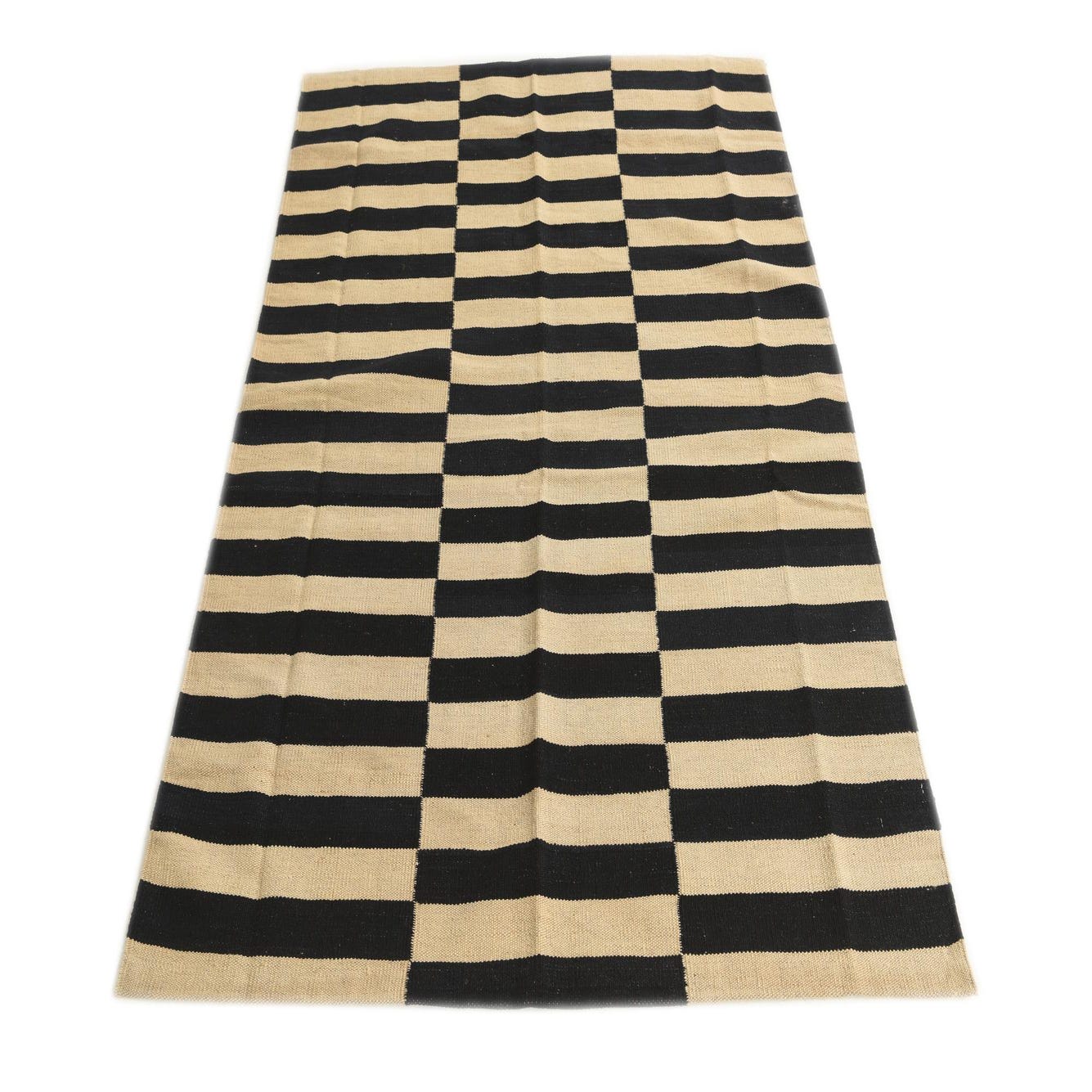 A 4x6 rectangular Kilim Modern rug with alternating black and natural ivory horizontal stripes in a tribal pattern.
