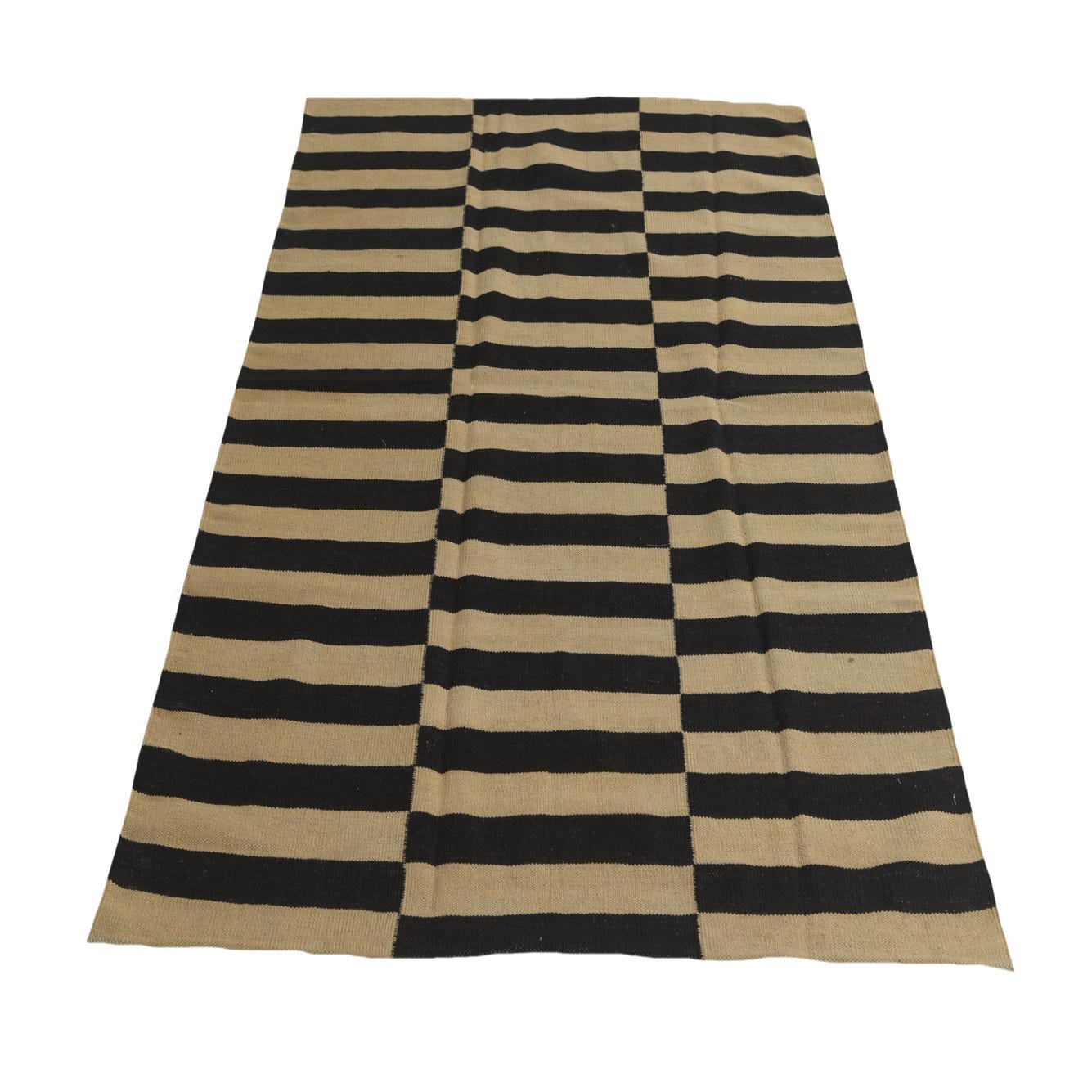 A 4x6 rectangular black flatweave rug with a subtle striped and tribal pattern, suitable for various indoor rooms.