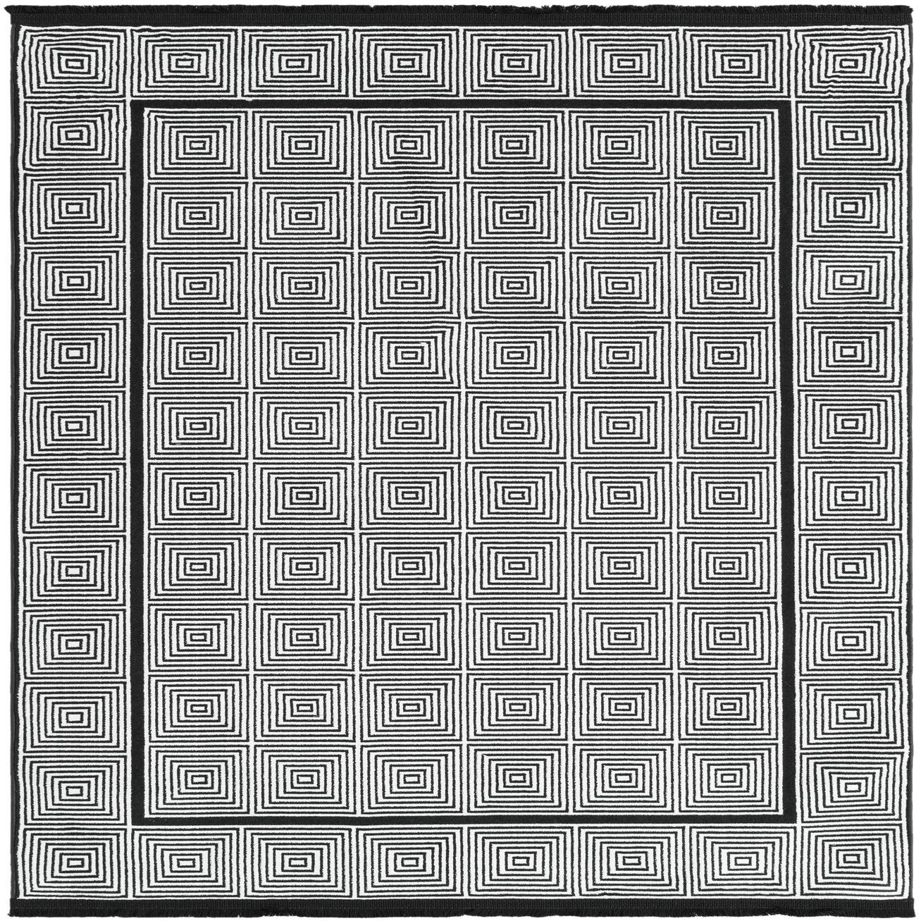 A 4x6 rectangular Rugs.com Milano rug featuring a bold black and white modern geometric pattern of concentric squares.