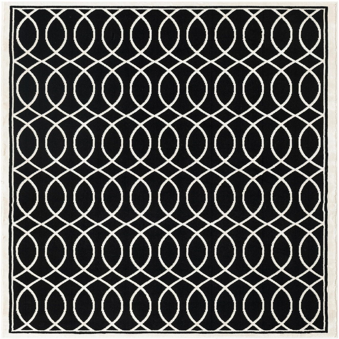 A 4x6 rectangular black and white area rug with an interlocking geometric trellis pattern and a cream border.