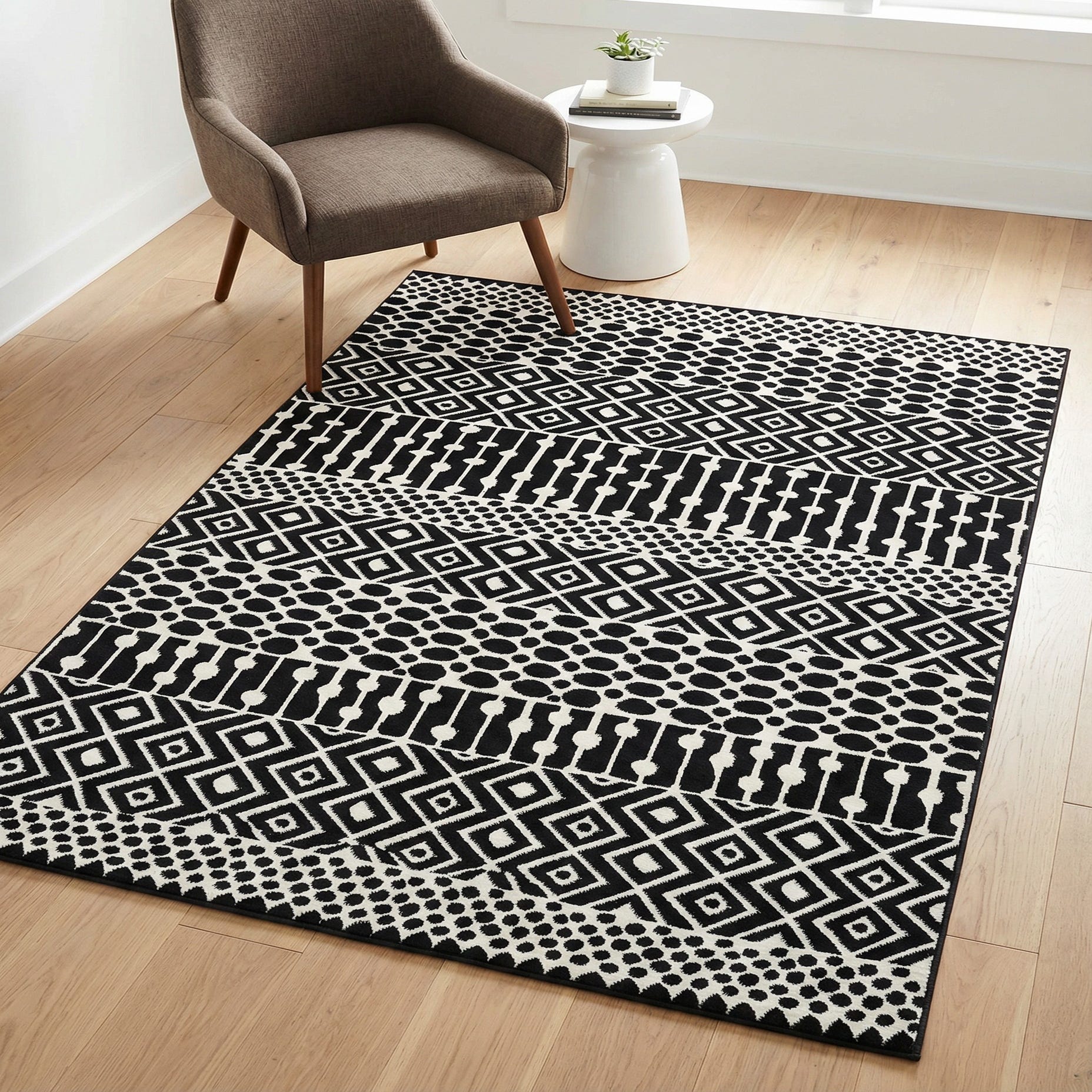 Bold, graphic stripes of geometric motifs give this rug a modern, textural presence. Alternating bands of irregular oval dots, tight speckled rows, diamond lattices and stylized vertical bar-and-dot patterns create a layered, tribal-inspired look in crisp black and white. The high-contrast palette and precise patterning read clean and contemporary, while the low-profile polyester construction offers a soft, slightly cushioned feel underfoot with clearly defined edges and motifs.