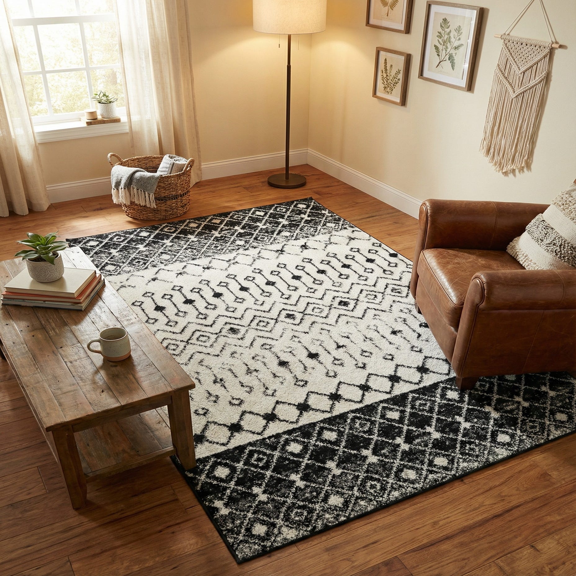 Place this rug where graphic contrast will complement the room: beneath a low-profile sofa in a modern living room, under a small dining set to add visual interest, or in an entryway to make a crisp first impression. It pairs naturally with matte black metal accents and warm wood furniture, and also brings balance to minimalist or Scandinavian schemes when layered with linen textiles or woven baskets.