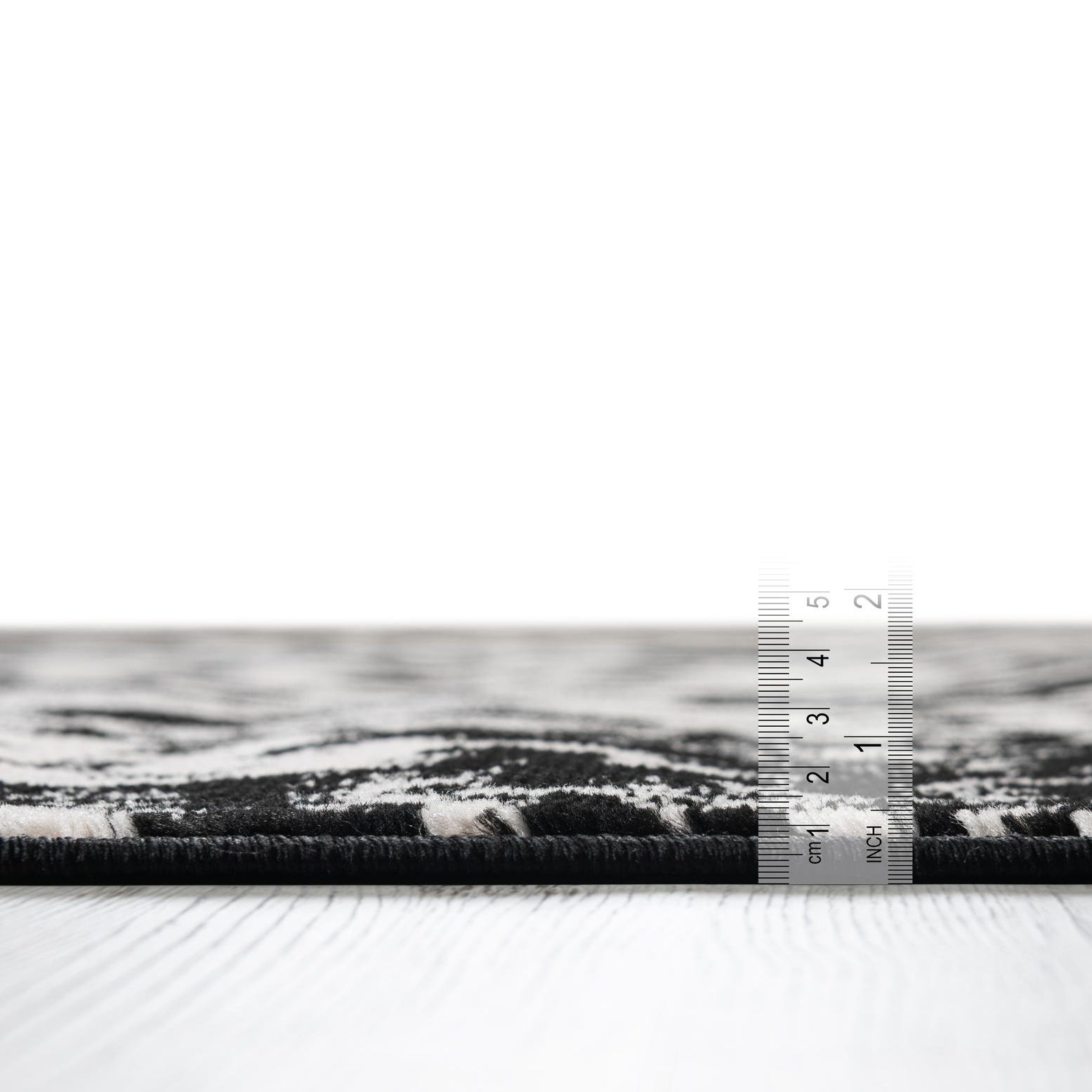 This rug works well in modern monochrome interiors, urban lofts, or transitional living rooms where a graphic anchor is needed. Place it beneath a sofa grouping to define the seating area, under a small dining set for visual contrast, or layered at the foot of a bed to add pattern without heavy color. Its versatile black-and-white scheme pairs cleanly with natural woods, metal accents, and both cool and warm neutrals.