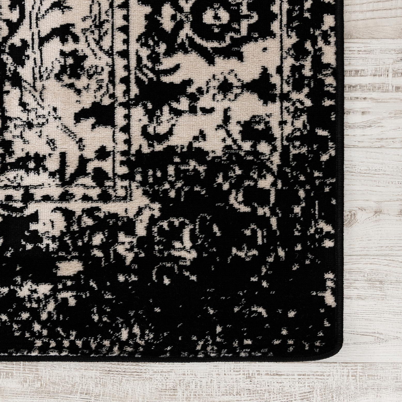 A classic, distressed Persian-inspired pattern in a black-and-white palette gives this machine-made rug a casual, yet structured presence. Ornamental florals and medallion motifs are rendered in deep black against a mottled black-and-white ground, with a worn border that softens the overall geometry. The surface reads as low to medium pile with a dense, slightly plush hand—85% polypropylene provides resilience while 15% polyester adds a soft touch and subtle sheen to the fibers.