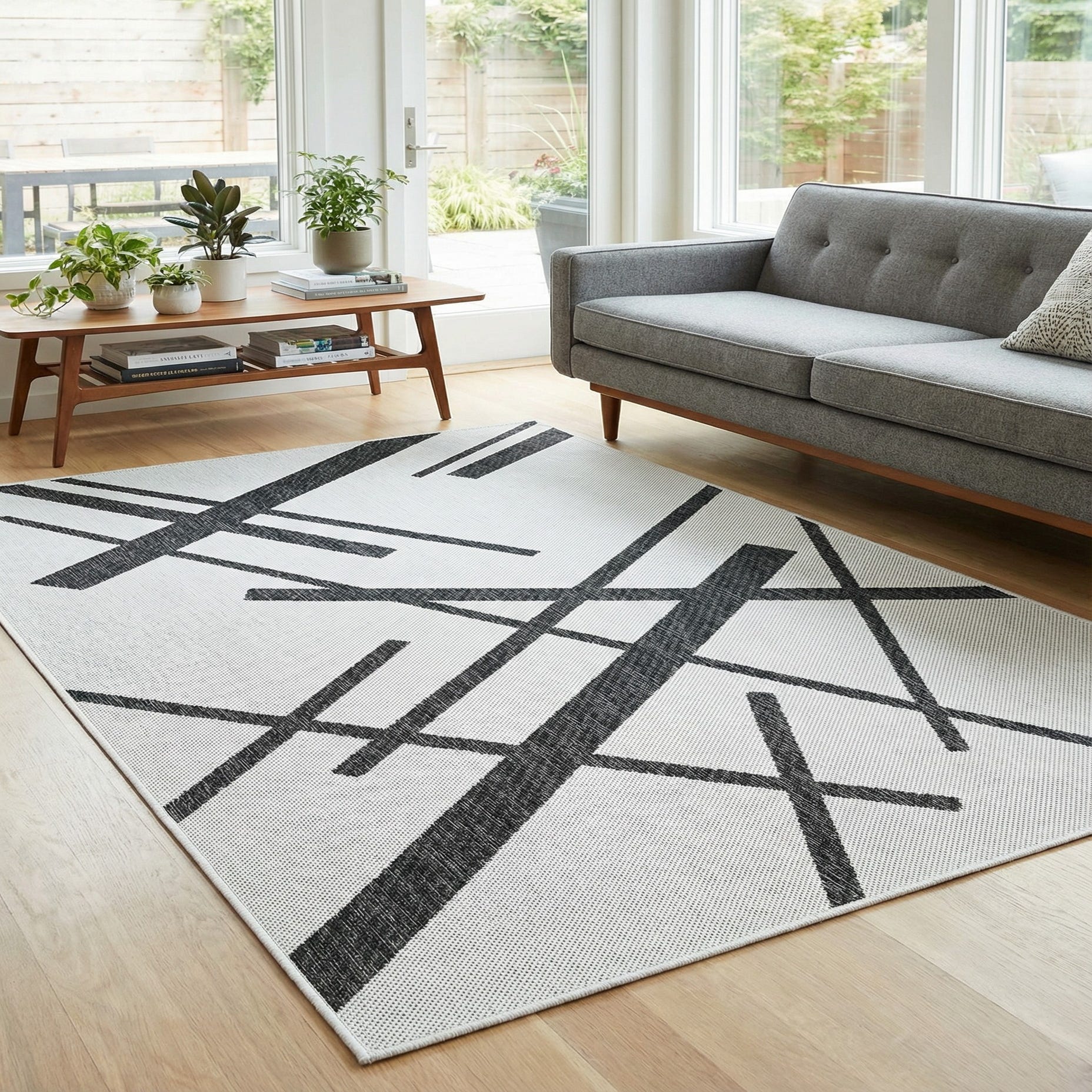 This versatile rug provides a modern touch to patios, decks, or even indoor spaces such as living rooms or home offices that seek to incorporate clean, architectural lines. Its monochromatic tones enable it to integrate seamlessly with a variety of decor themes, from minimalist to Scandinavian-inspired settings, or serve as a contrasting element in more vibrant and colorful environments.