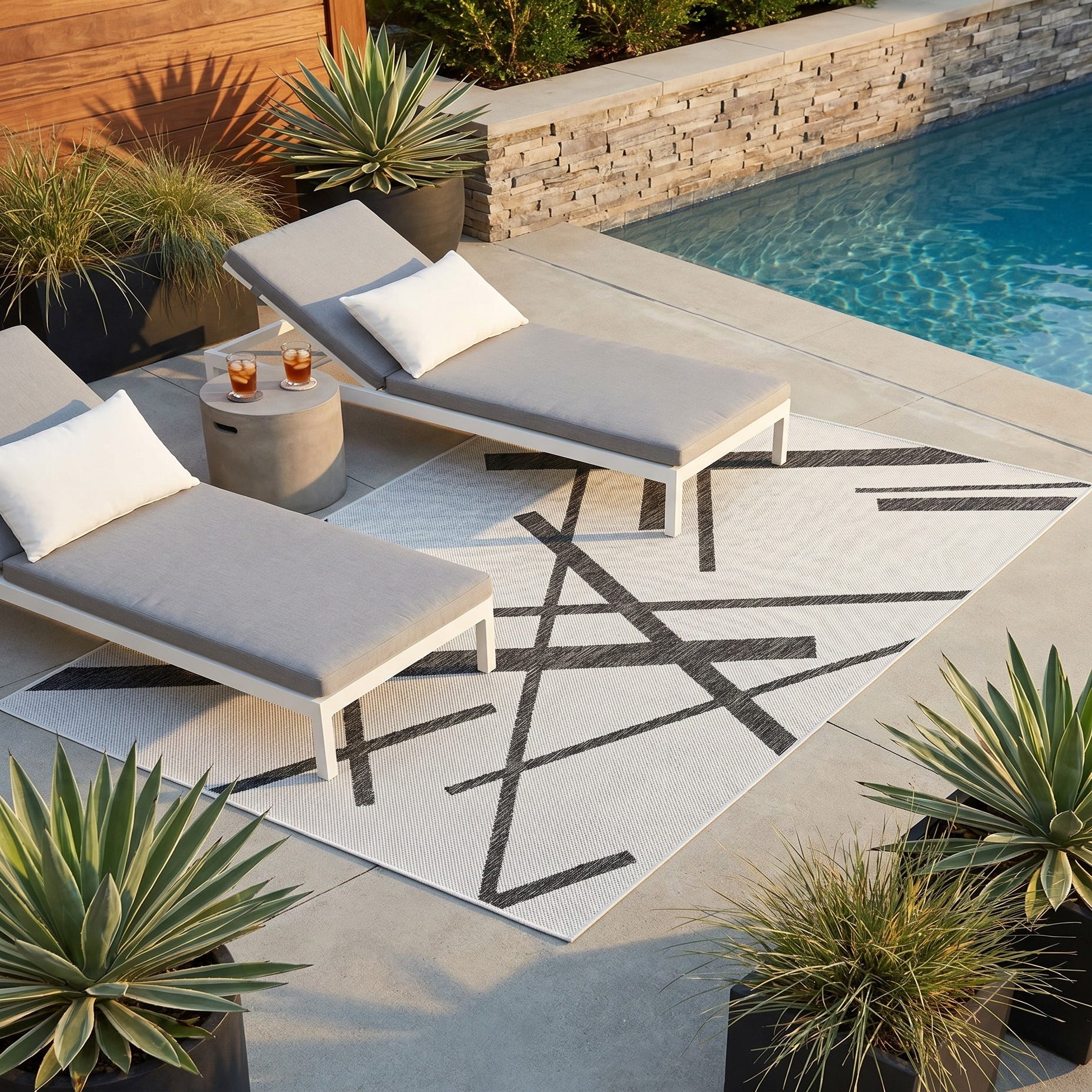 Love the contemporary look of this rug! We are so happy we chose this to accent the blue of our pool with our living area on our lanai. We still are going to add a few more pillows but love the rug to add color.