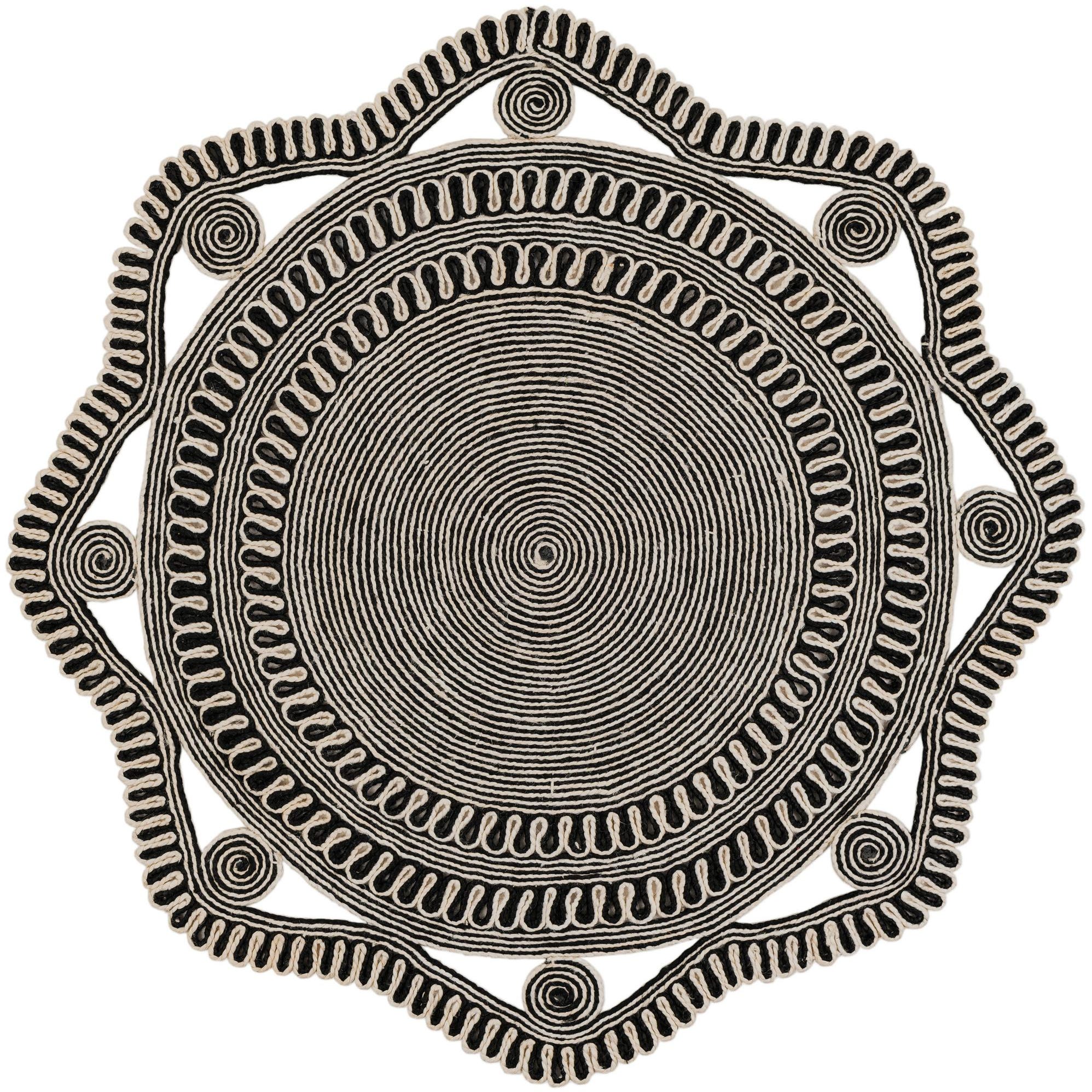 Hand-braided from 100% jute, this round rug pairs a tight concentric spiral center with a decorative looped band and a scalloped outer edge punctuated by small circular motifs. The black and white colorway creates a bold, graphic contrast while the braided jute construction gives the surface a firm, textured feel underfoot — you can make out the individual cords and subtle irregularities that give the piece character and depth.