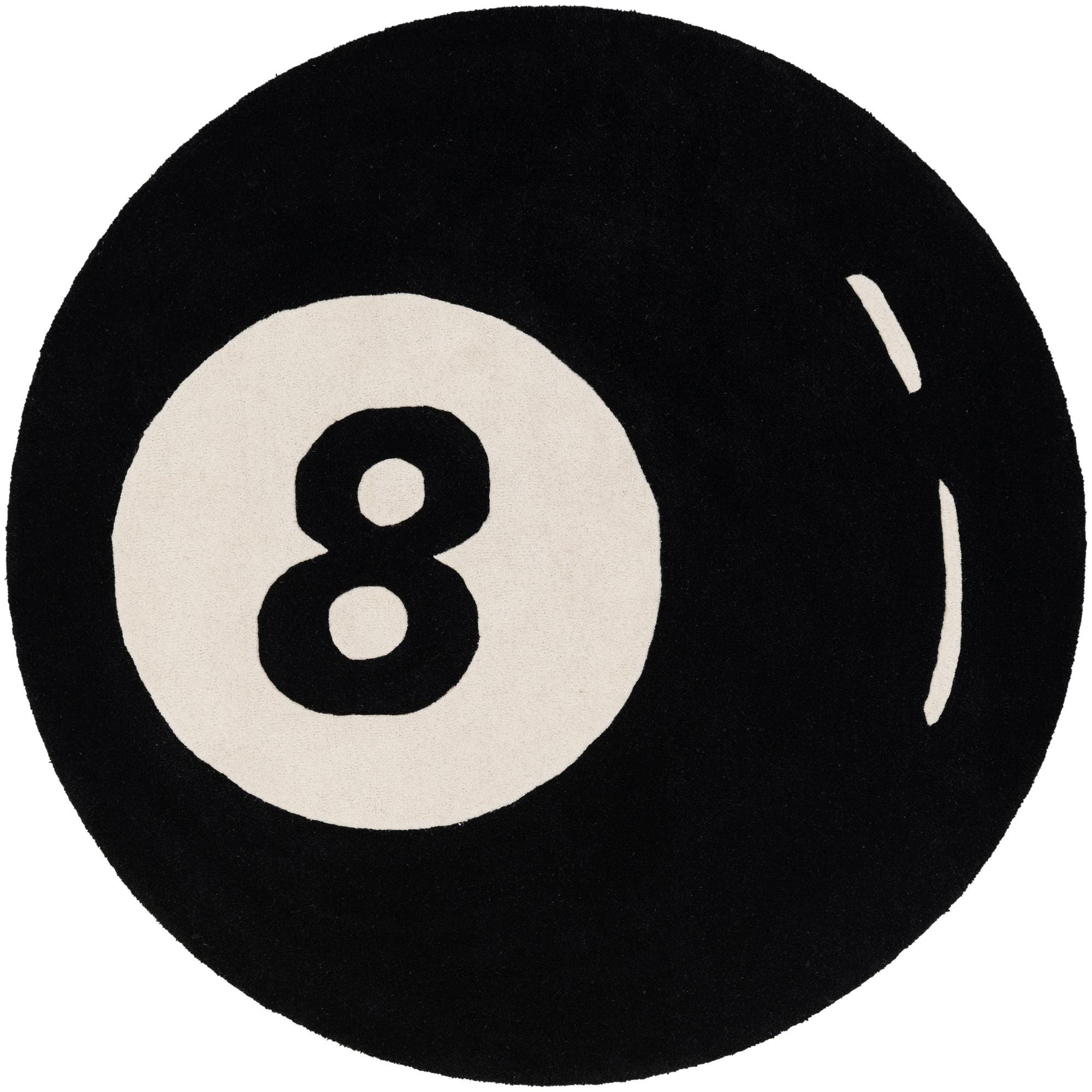 A round black rug featuring a large white circle with a black number 8, resembling a billiard 8-ball.