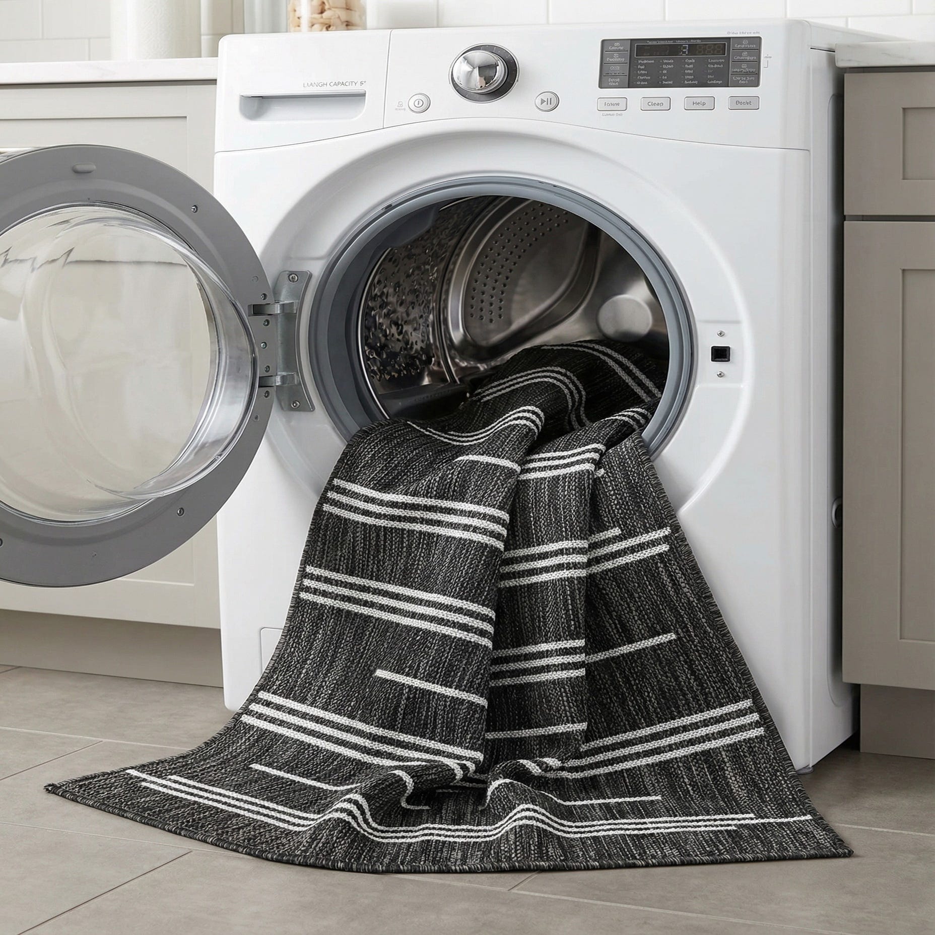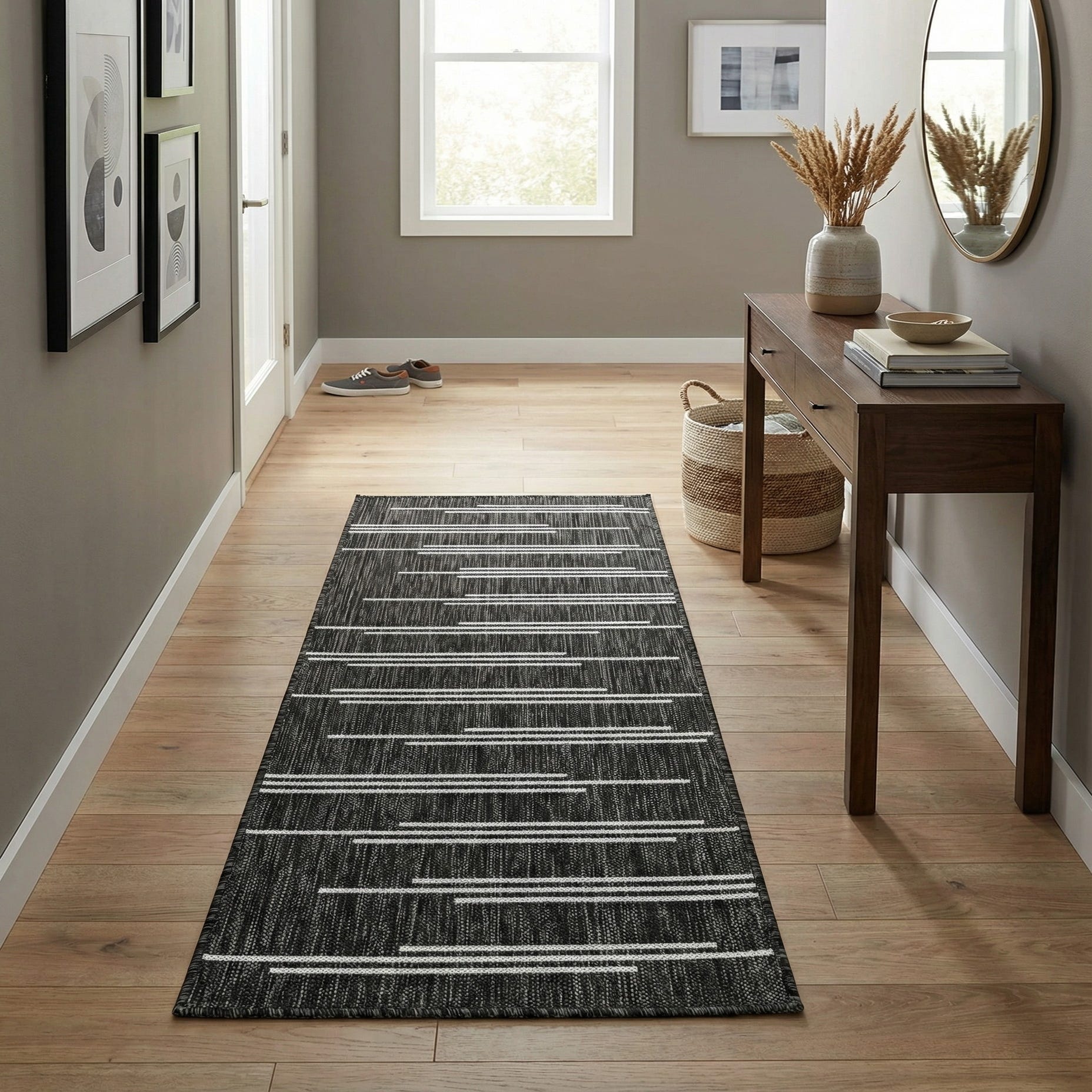 A 5 ft runner rug with a black textured flatweave base and minimalist white horizontal stripes, ideal for a hallway or patio.