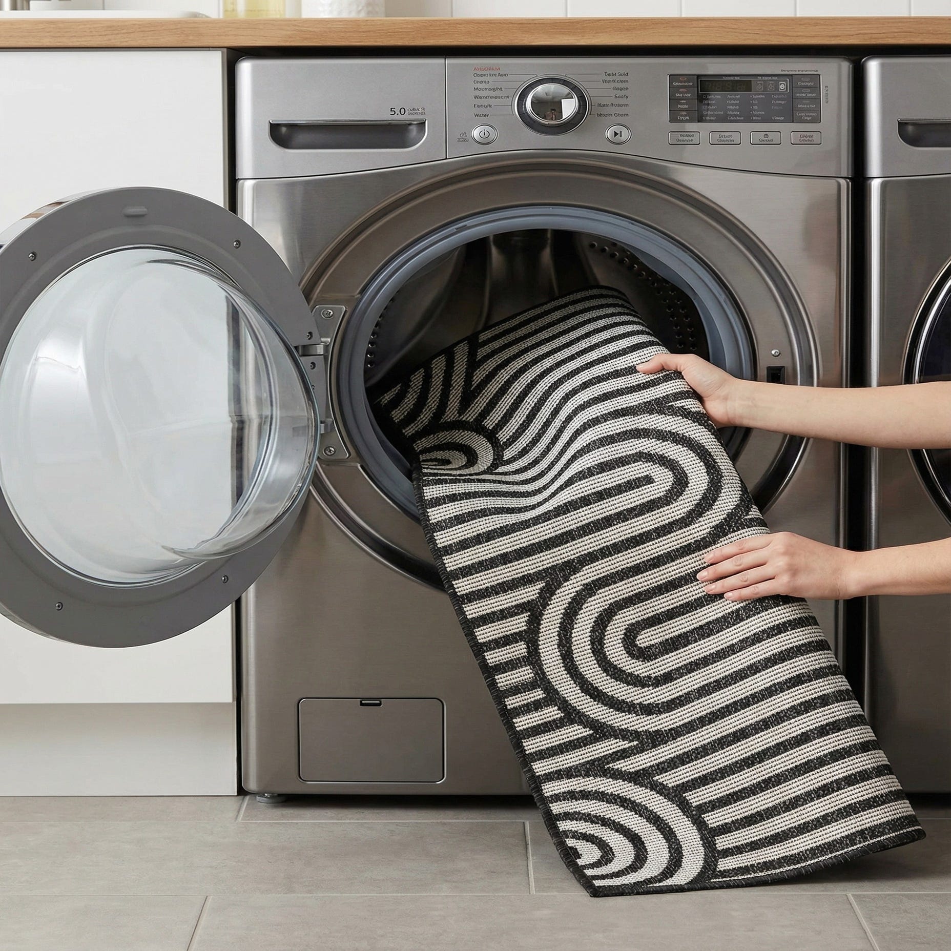 This rug's modern design and crisp color palette would complement minimalist and contemporary decor settings, as well as transitional spaces seeking a bold accent piece. It is well-suited for use in entryways, hallways, patios, or kitchens, where its resilience and aesthetic appeal can be fully appreciated.