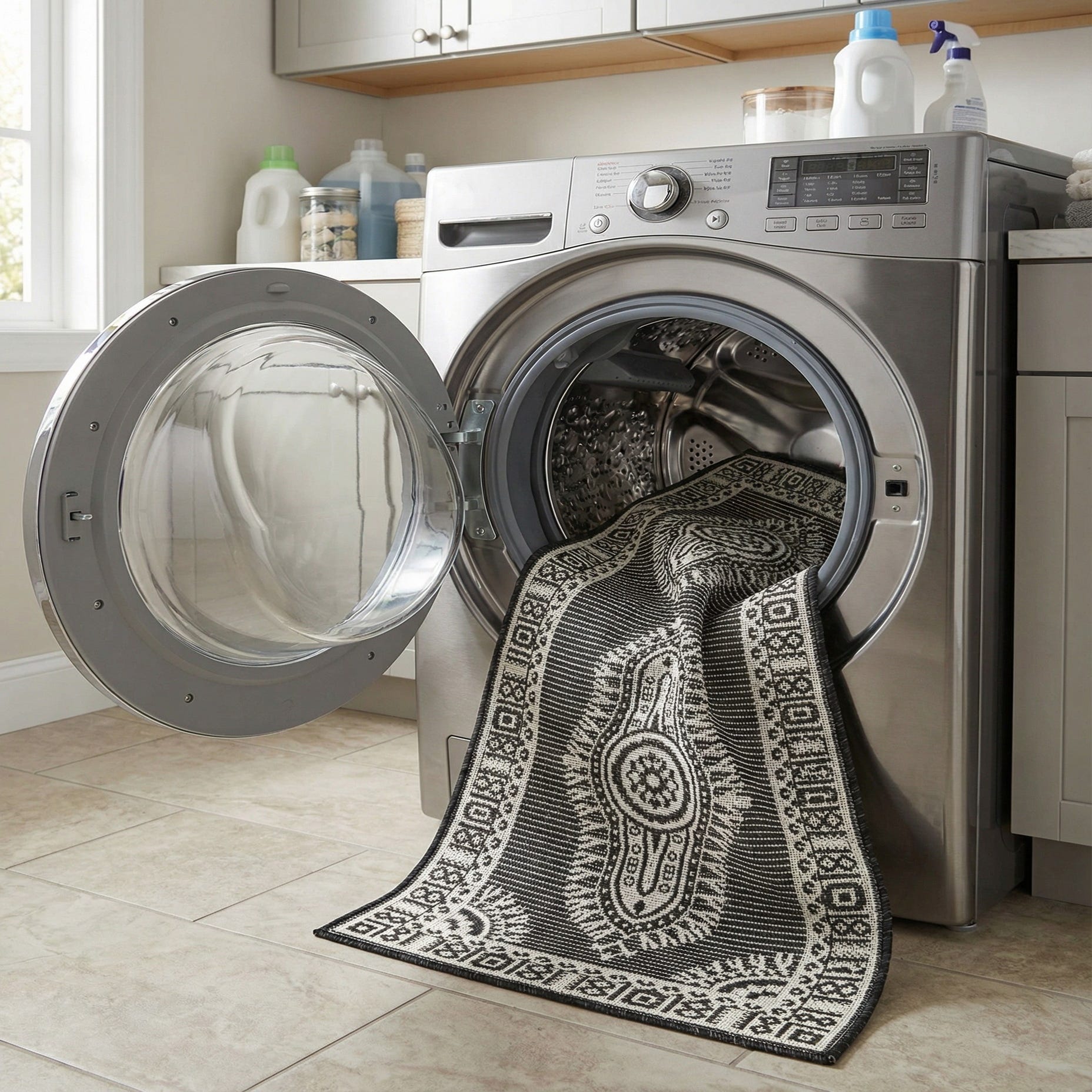 A black and white 5 ft runner rug with a traditional medallion pattern, ideal for hallways or patios.