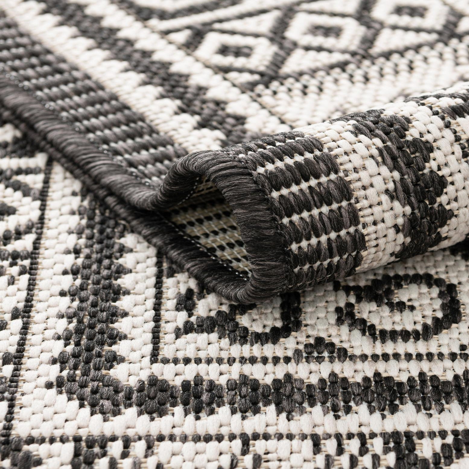 This Outdoor Traditional 5 Ft Runner rug presents a timeless motif with a modern twist, rendered in a striking black and white color palette. The machine-woven construction of 100% polypropylene ensures a flatweave texture that is both stain-resistant and suitable for high-traffic areas. The durability of the material complements active spaces such as entryways, hallways, or outdoor patios.