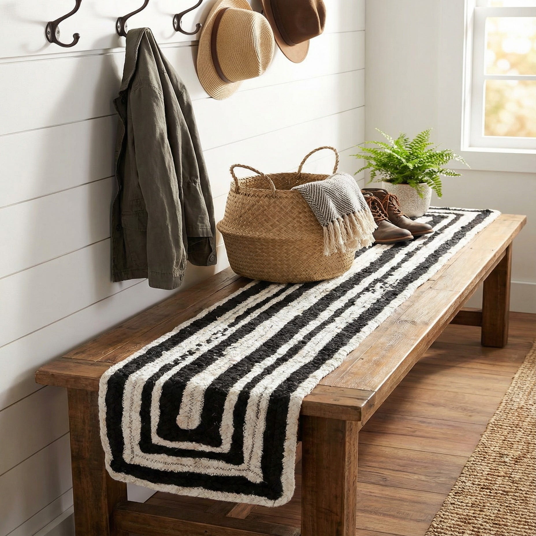 Hand?braided from 100% cotton, this table runner presents bold black bands on a white ground arranged in a rectangular spiral pattern that draws the eye along its length. The braided construction gives the surface a pleasingly tactile, slightly nubby feel, with visible zigzag stitching and small woven irregularities that add handcrafted character. The strong graphic contrast and linear rhythm make the design both modern and grounded — a clear, simple statement in black and white.