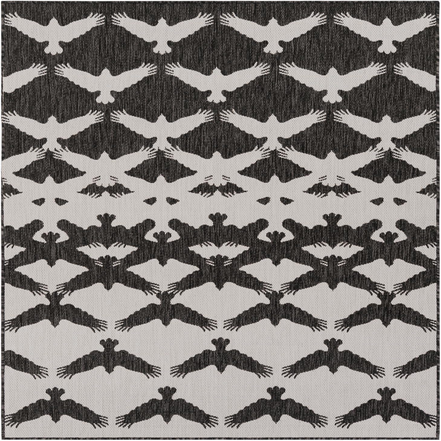 A 5x7 rectangular black and white modern rug featuring an interlocking pattern of white birds flying against a black background.