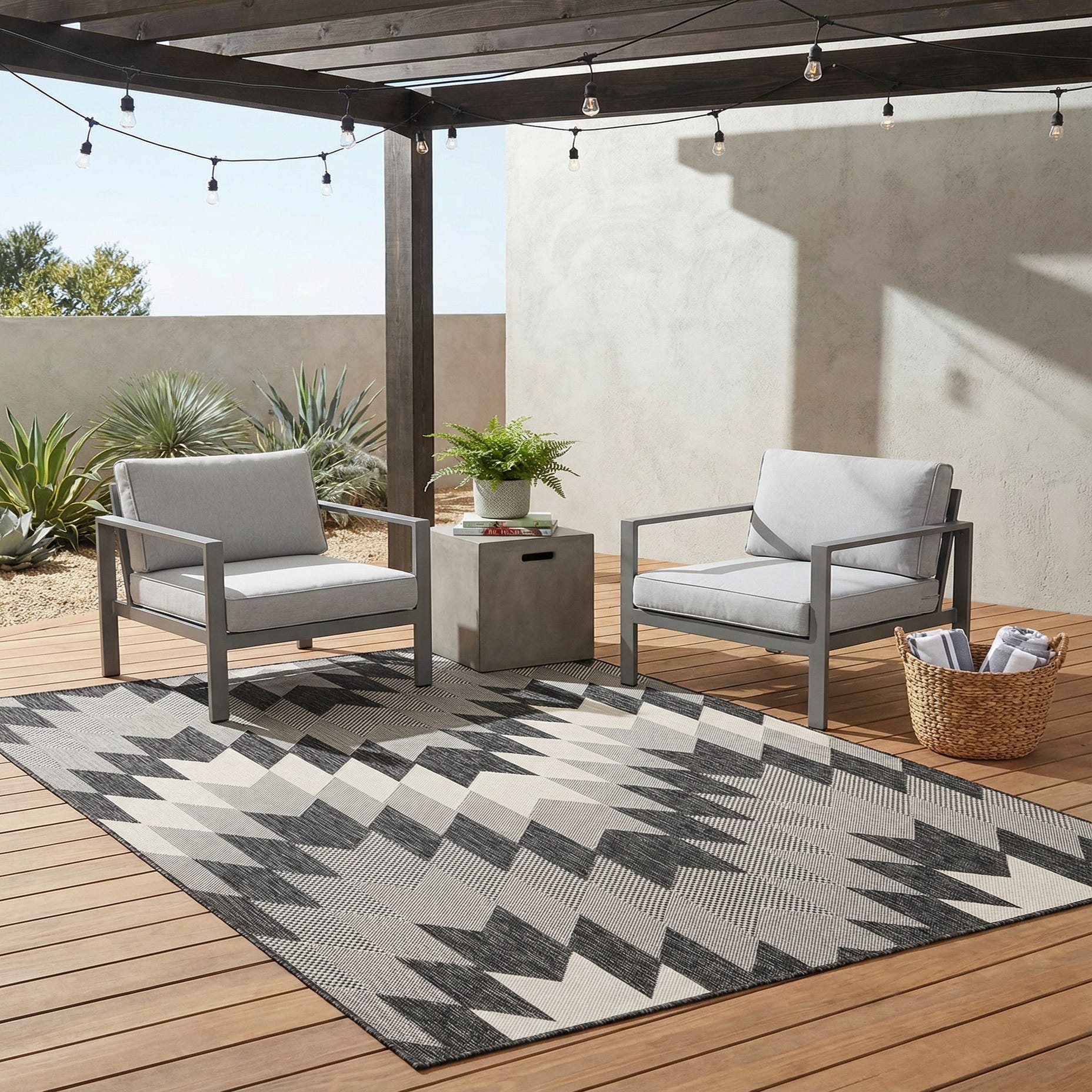 A 5x7 rectangular black, ivory, and cream flatweave rug with a modern tribal geometric pattern, suitable for indoor or outdoor use.