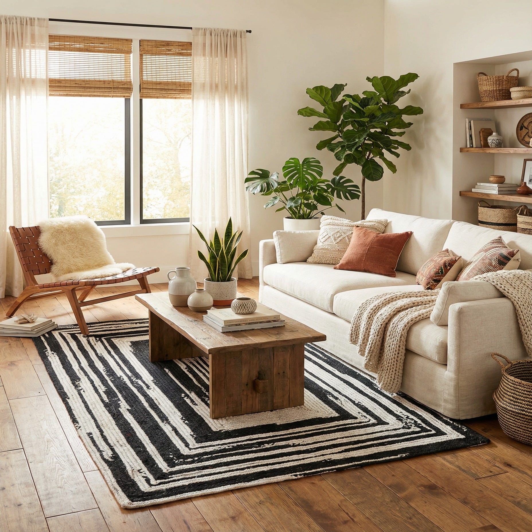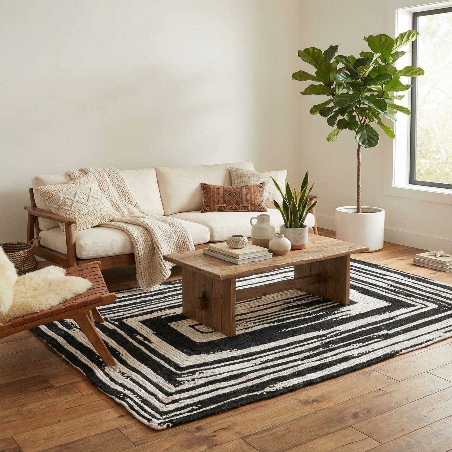 Hand-braided from 100% cotton, the surface has a low-profile, ribbed texture you can feel underfoot—soft but tactile, with slight irregularities that point to its handcrafted construction. The sturdy braided build lays flat and works well layered over hardwood or tile. Place it under a coffee table to anchor a living room, run it through an entryway for a striking first impression, or set it in a bedroom to add graphic contrast to neutral bedding. It pairs especially well with warm wood tones, black metal accents, and simple, streamlined furniture.